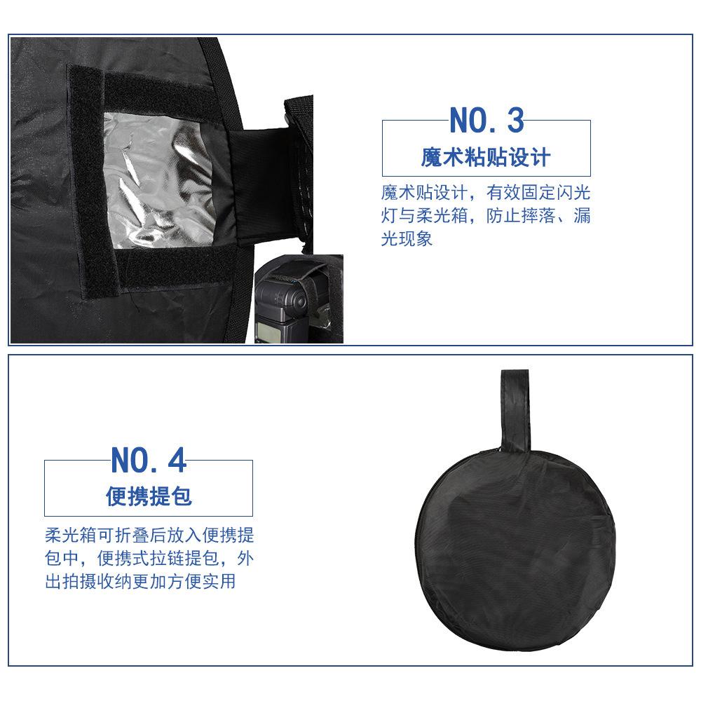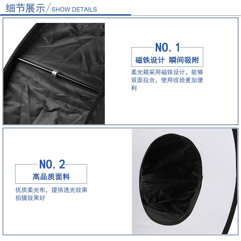 2. La parte frontal de la caja adopta un diseño de luz suave, con materiales reflectantes distribuidos en el interior, un puerto para flash con ancho ajustable reservado en la parte superior y un tubo de hierro magnético como marco, que es plegable y fácil de transportar.
