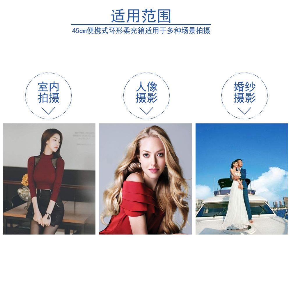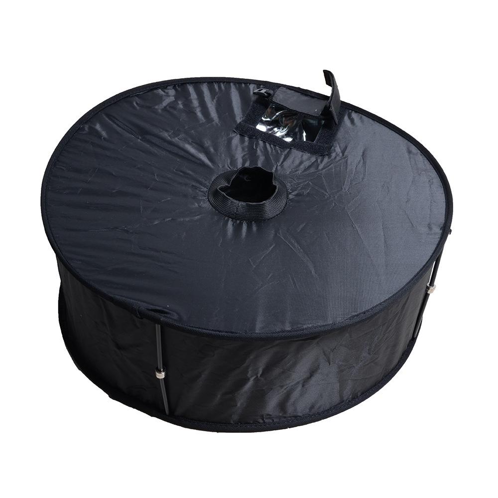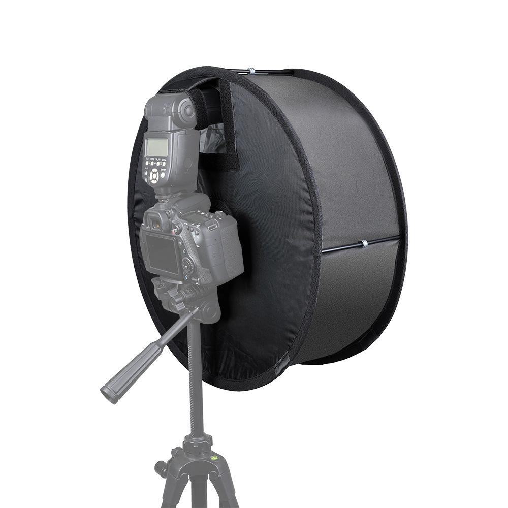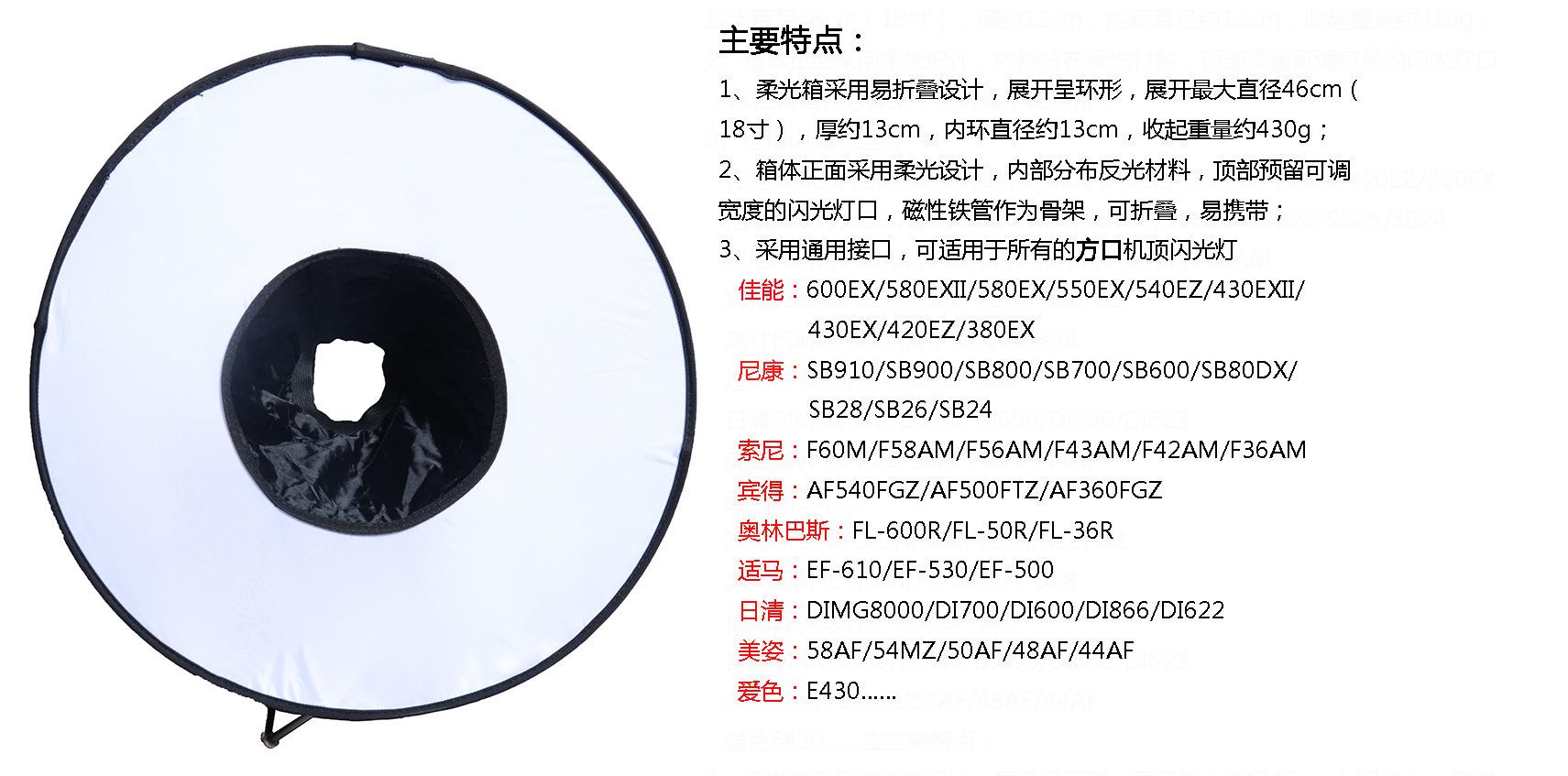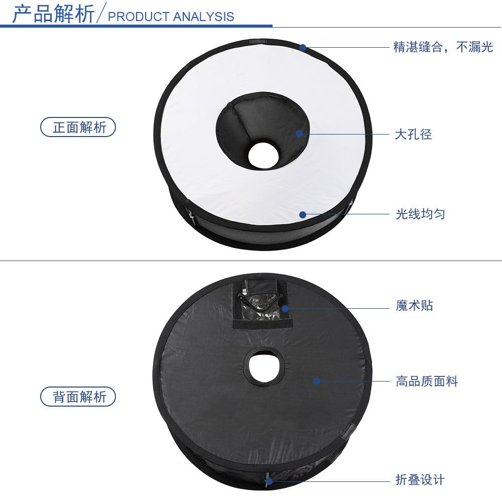 1. El softbox adopta un diseño fácil de plegar. Se despliega en forma de anillo con un diámetro máximo desplegado de 46 cm (18 pulgadas), un grosor de aproximadamente 13 cm y un diámetro de anillo interior de aproximadamente 13 cm