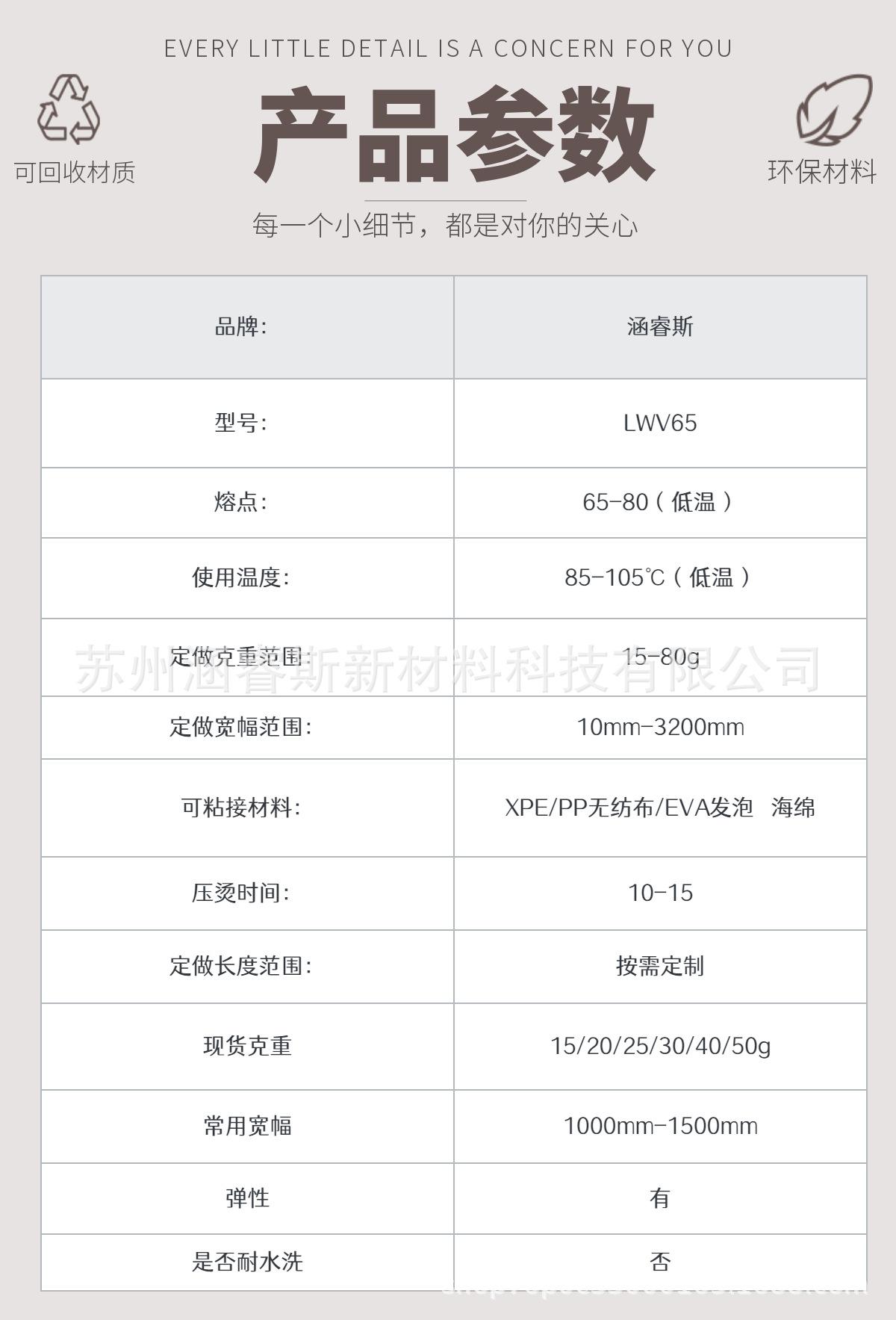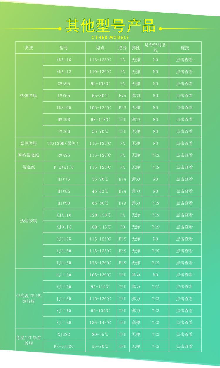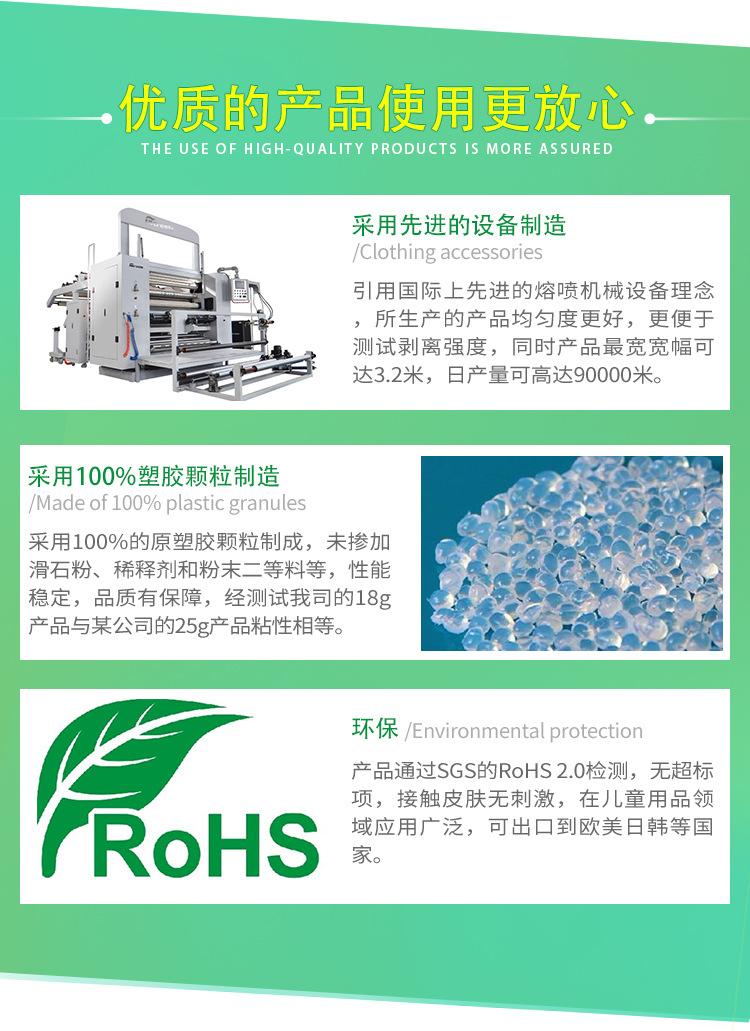 El rango de peso de la banda adhesiva termofusible EVA es mucho menor que el de PA y PES. Esto se debe a que el EVA es demasiado blando. Si el peso es demasiado ligero o demasiado delgado, será difícil despegar la banda adhesiva termofusible. Pueden presentarse problemas similares, como adherencias, durante el uso. Tirar con fuerza puede romper el rollo. Preste especial atención al usarlo.