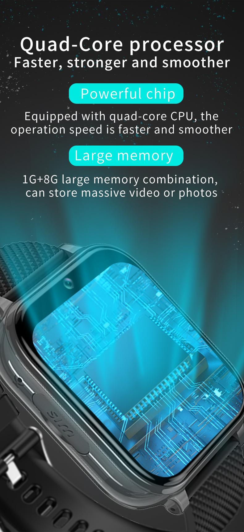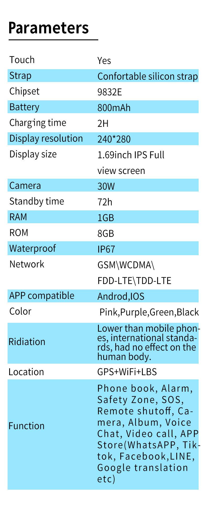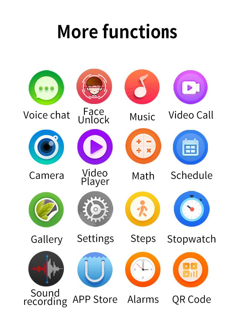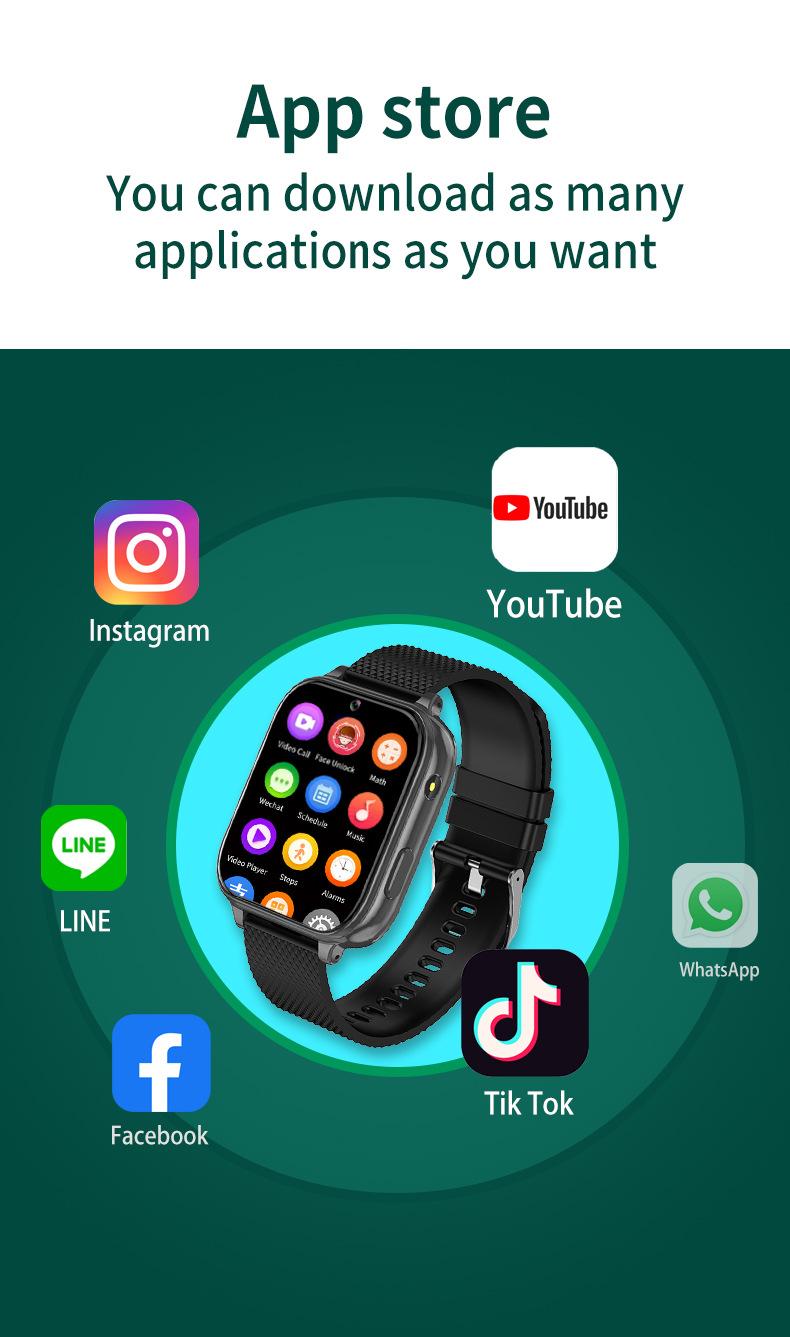 Funciones: Agenda telefónica, Alarma, Zona segura, SOS, Cámara, Álbum de fotos, Chat de voz, Videollamada, APPStore (WhatsAPP, TikTok, Facebook, LINE, Google Translate, etc.)