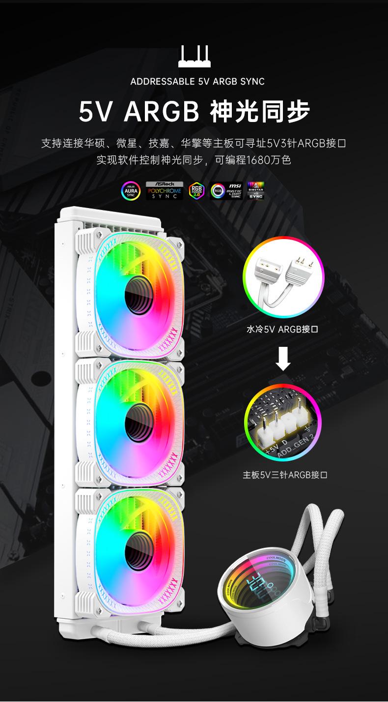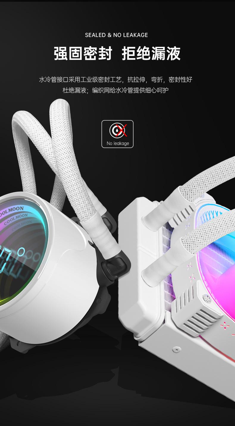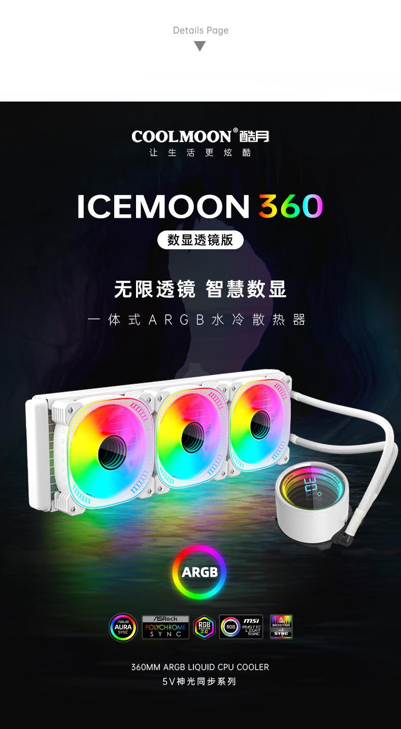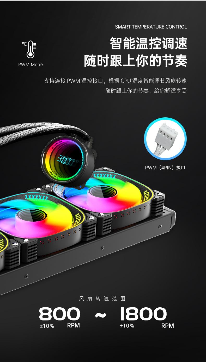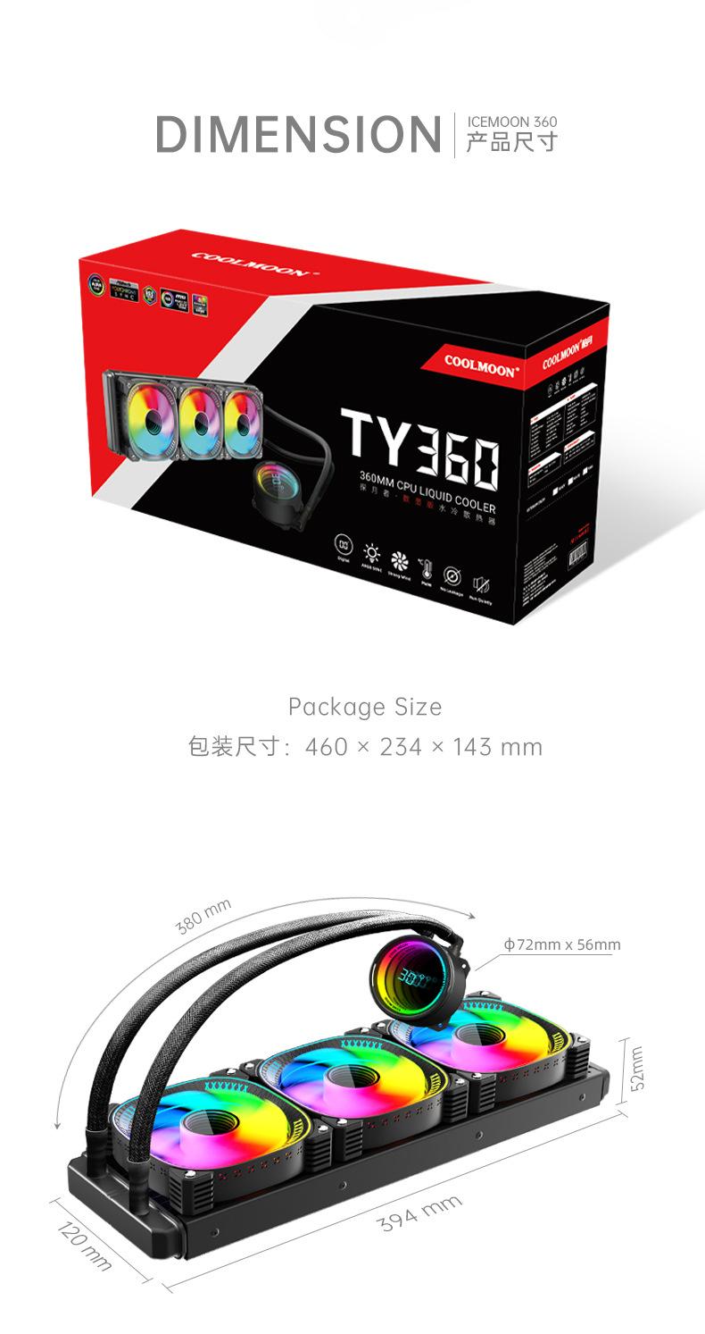 El nuevo radiador refrigerado por agua 360 de Cool Moon, nueva pantalla de temperatura de cabezal frío, la lente infinita es muy genial, con control de temperatura inteligente luminoso interno y externo, ventilador ARGB Moon Explorer, admite instalación multiplataforma, venta directa de fábrica, garantía spot. 6 piezas / caja, tamaño de caja única 49,5 * 49 * 46 cm, 14,8 kg / caja, admite ventas transfronterizas y OEM, comuníquese con el servicio al cliente para obtener más información.