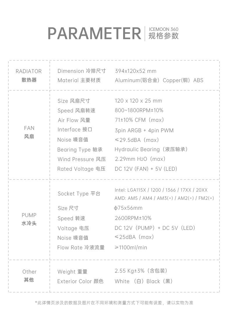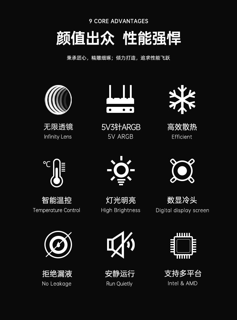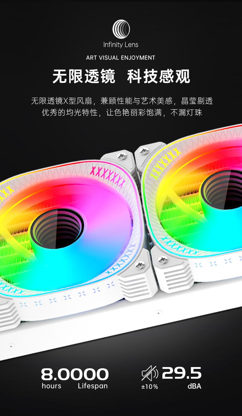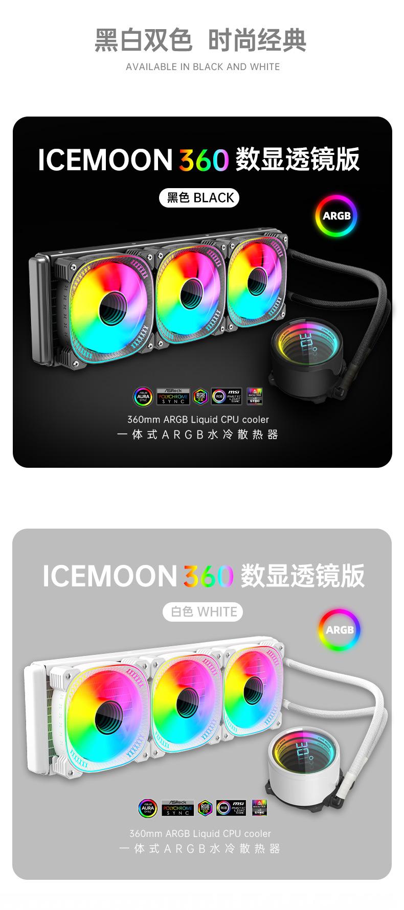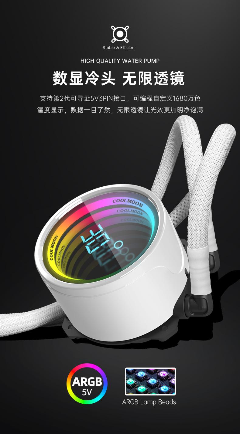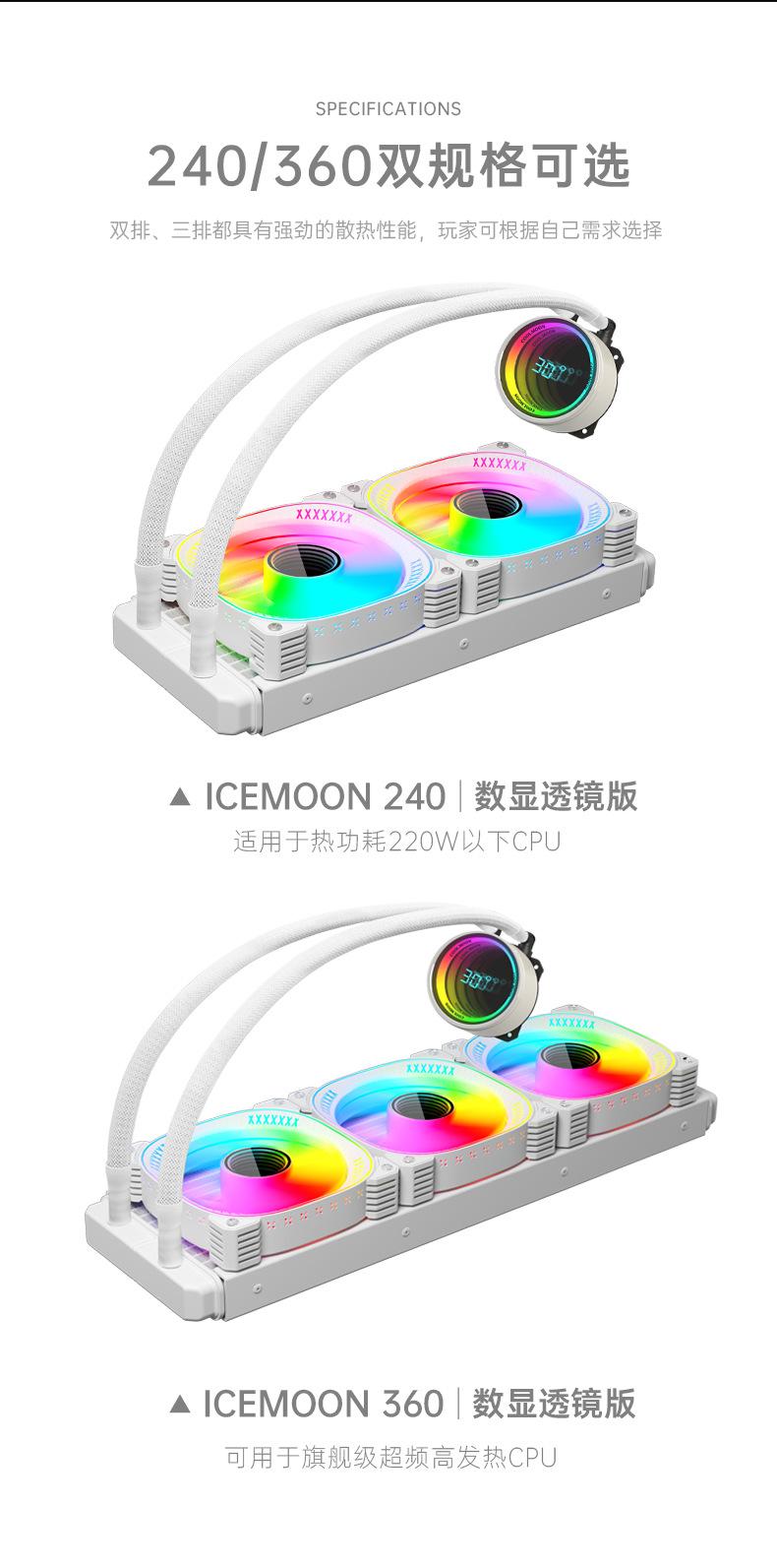 El nuevo radiador refrigerado por agua 360 de Cool Moon, nueva pantalla de temperatura de cabezal frío, la lente infinita es muy genial, con control de temperatura inteligente luminoso interno y externo, ventilador ARGB Moon Explorer, admite instalación multiplataforma, venta directa de fábrica, garantía spot. 6 piezas / caja, tamaño de caja única 49,5 * 49 * 46 cm, 14,8 kg / caja, admite ventas transfronterizas y OEM, comuníquese con el servicio al cliente para obtener más información.