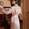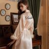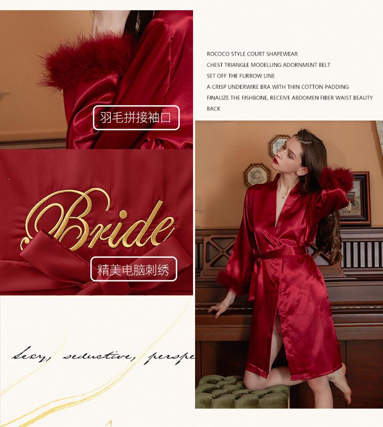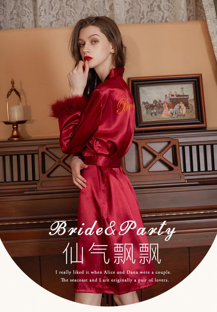 Vestido de novia, vestido de mañana, camisón de plumas para mujer, maquillaje de boda, dama de honor, grupo de boda, kimono, bata de satén