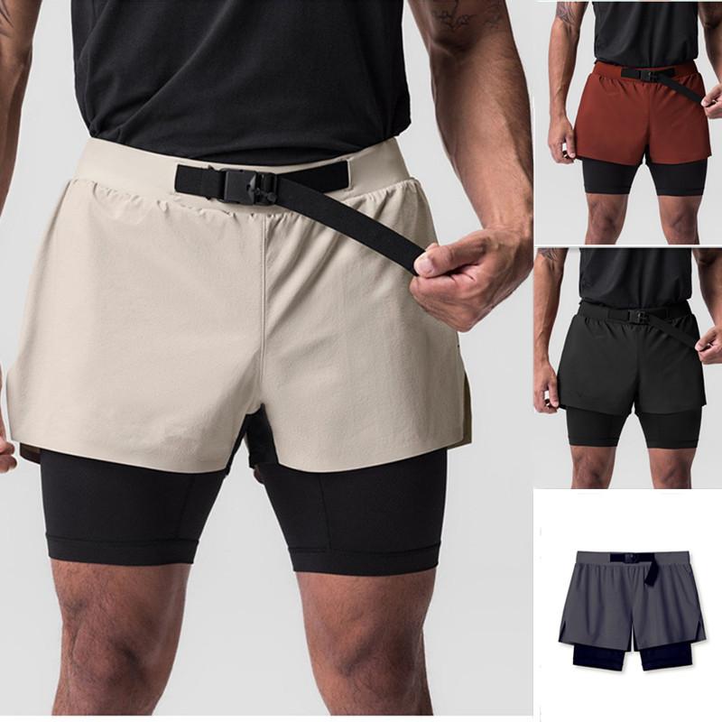 Nuevos pantalones cortos deportivos casuales de AliExpress transfronterizos de verano para hombre, pantalones de cuatro puntos para correr, fitness, elásticos, de doble capa