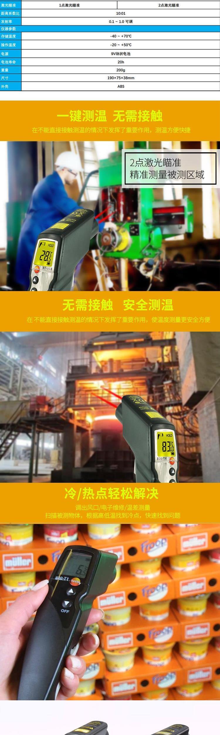 El testo 830-T2 tiene una función de puntería láser y una resolución óptica de 12:1, lo que lo hace adecuado para mediciones de temperatura de superficies industriales o de importación y exportación.