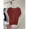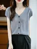 Camiseta de punto de seda de hielo para mujer, novedad de verano 2024, top de manga corta con cuello en V y color liso.