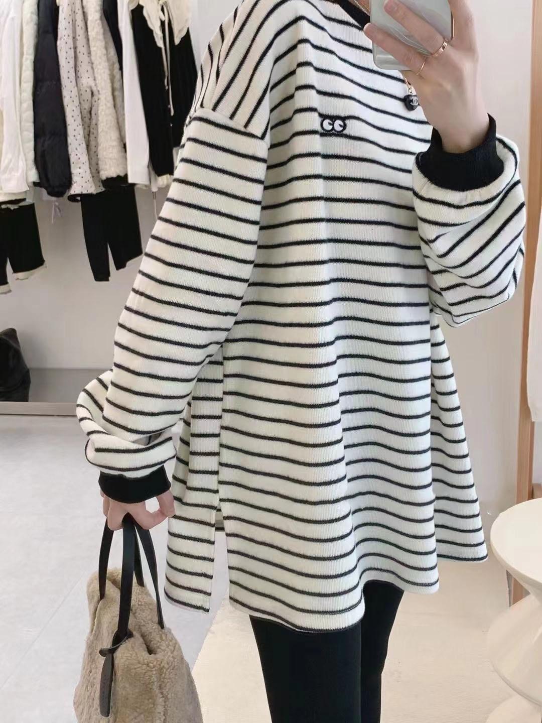 Camiseta de manga larga holgada a rayas gruesas con forro polar para mujer, blusa bordada con abertura en la cadera y base interior para otoño e invierno.