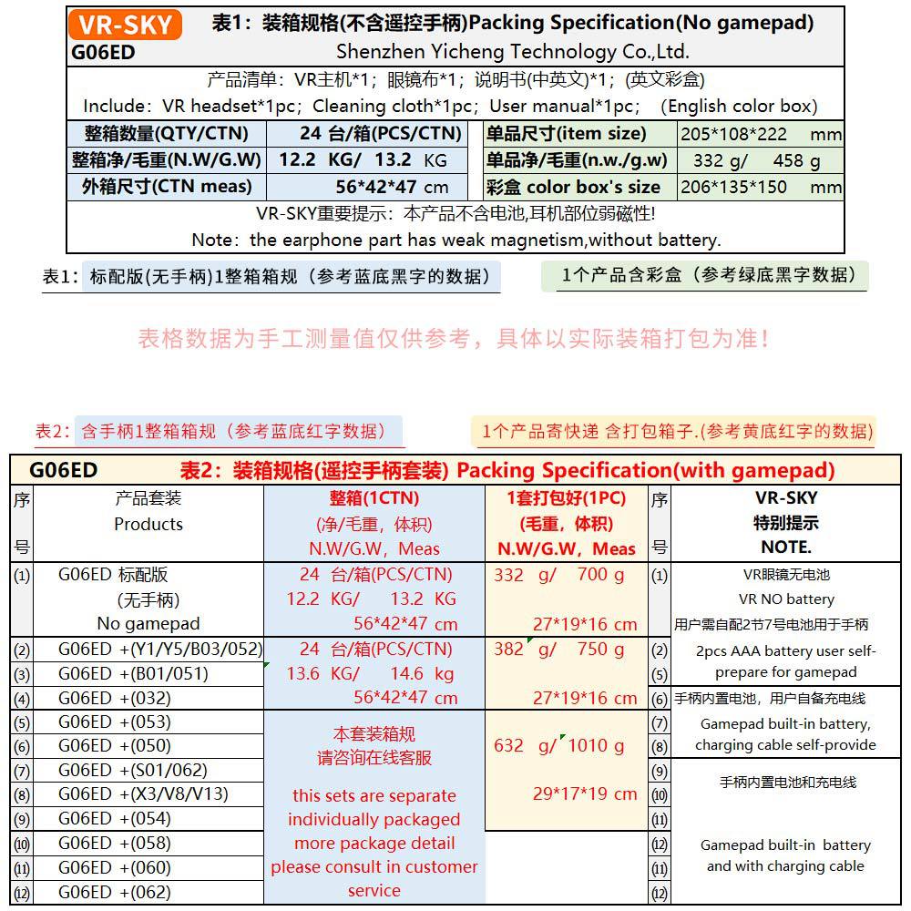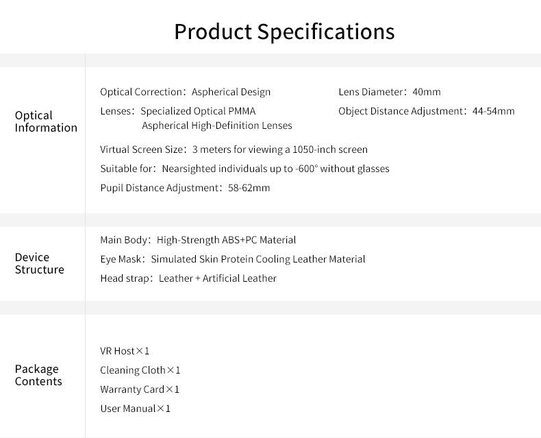 Embalaje: Gafas VR * 1; Cable de carga USB, manual de instrucciones (inglés) * 1; Paño de limpieza de lentes * 1; Embalaje en inglés * 1