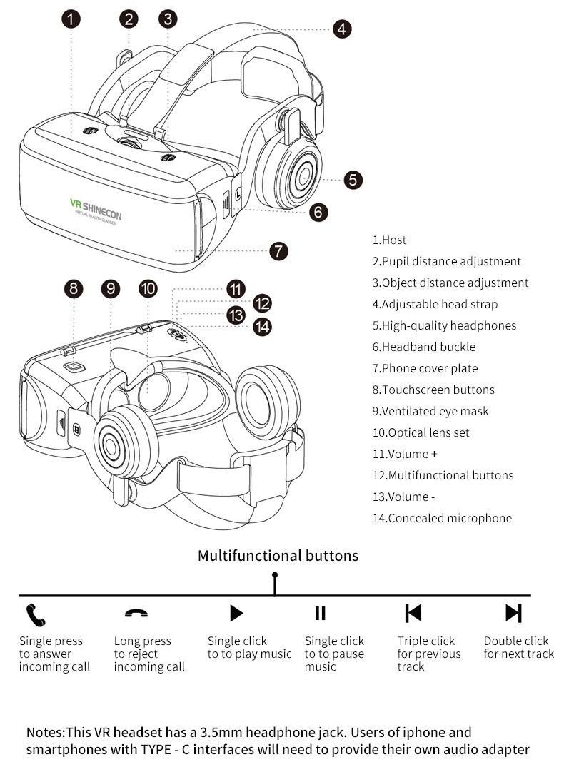 El conector para auriculares de las gafas VR es un conector de audio de 3.5 mm a la antigua. Si el usuario tiene un teléfono Apple o un teléfono Android con una interfaz Tipo-C, el usuario necesita comprar un adaptador de audio para usar los auriculares en las gafas VR. ¡Por favor, téngase en cuenta!