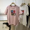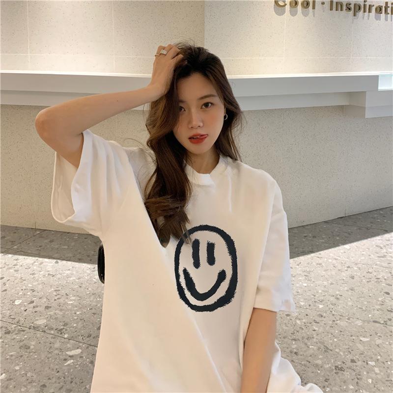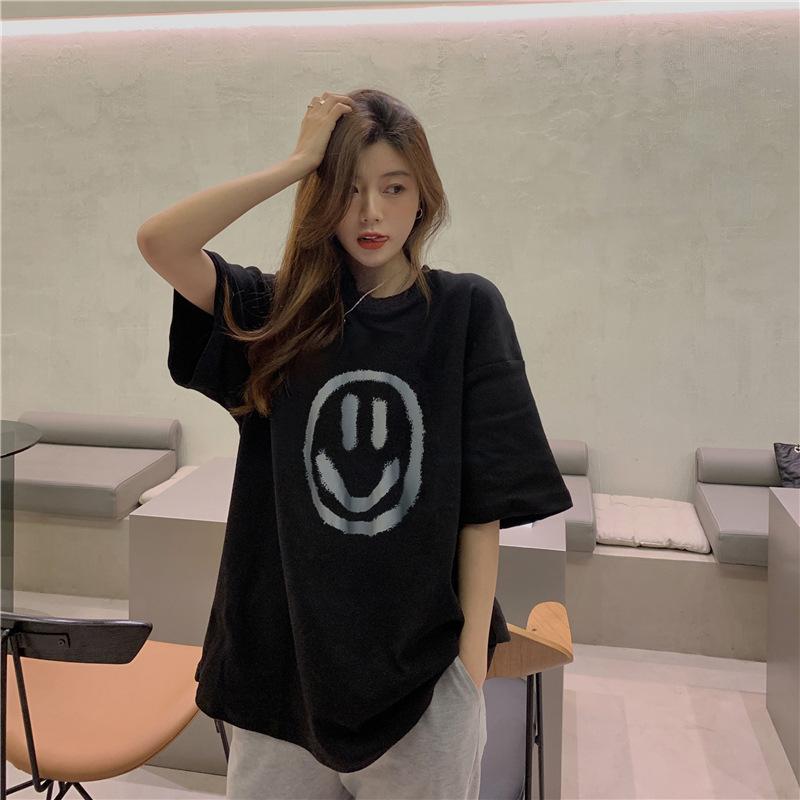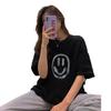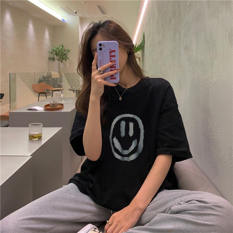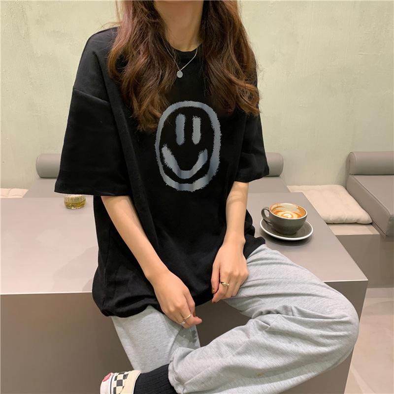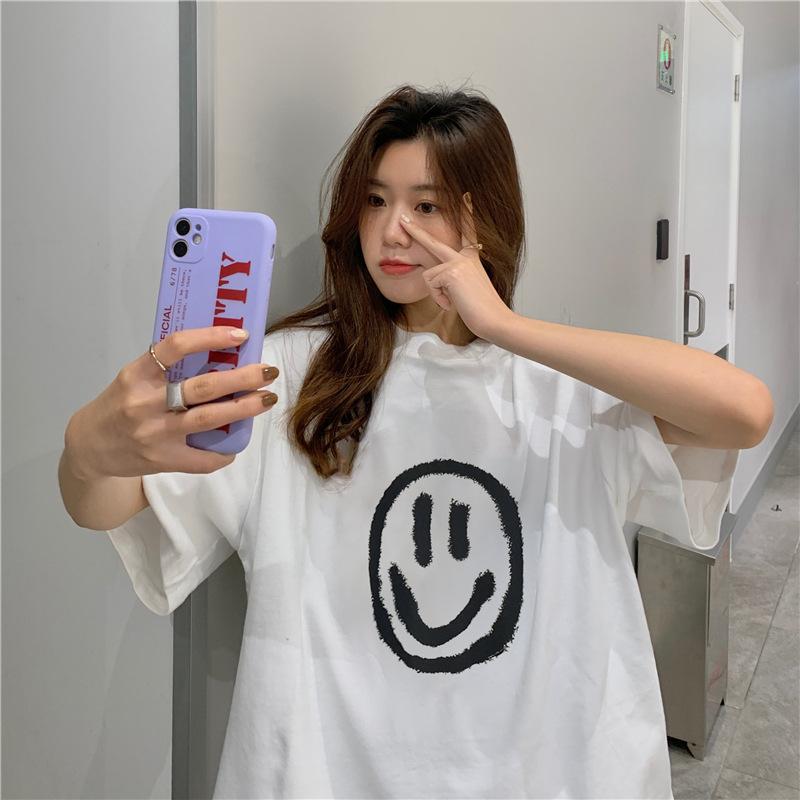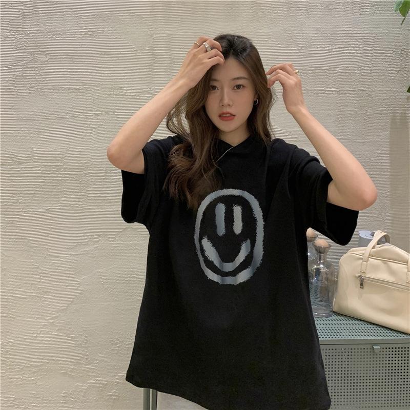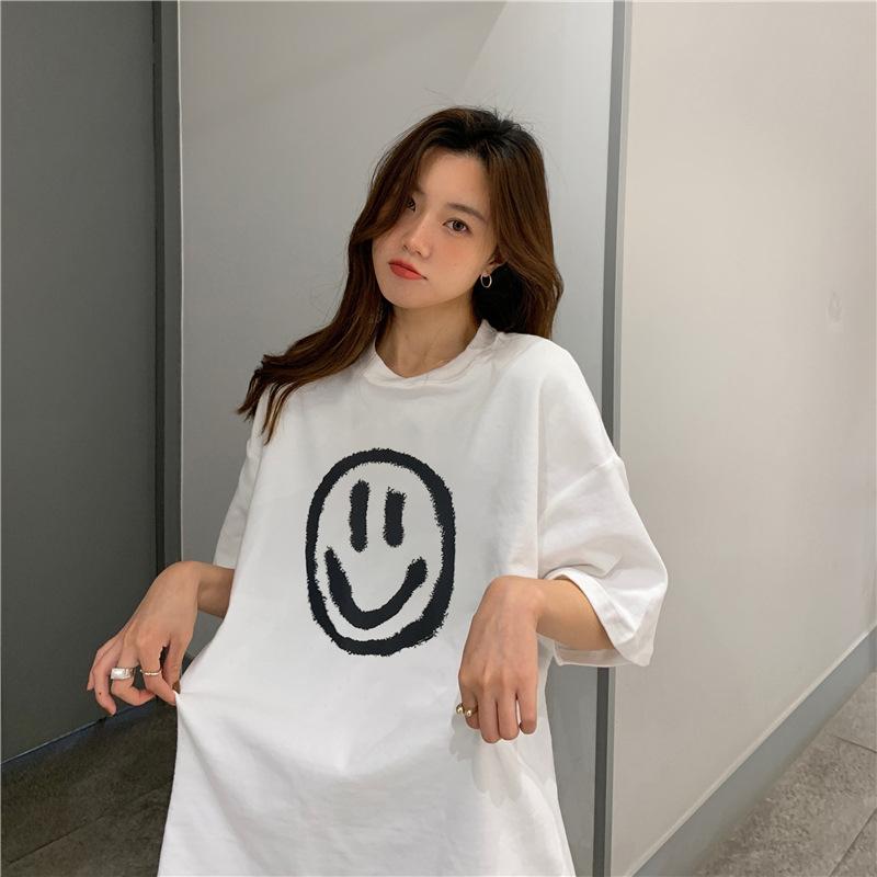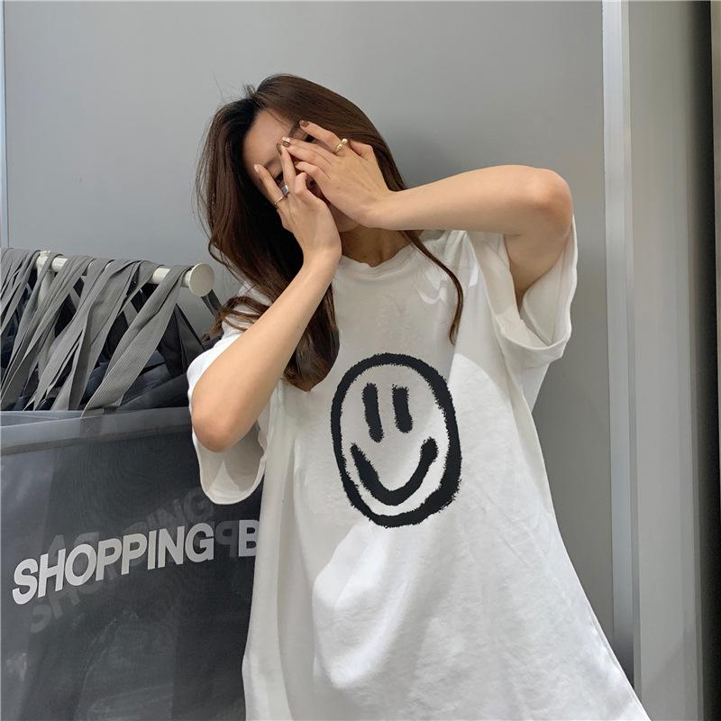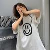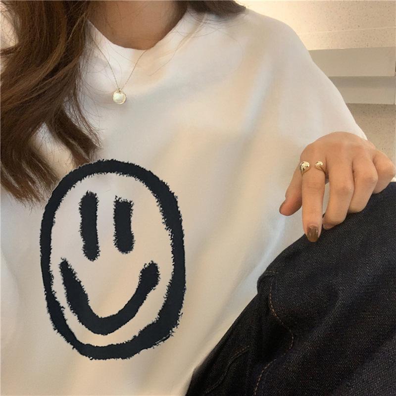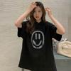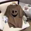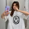 Camiseta de Manga Corta con Cuello de Algodón Puro y Estampado de Carita Sonriente de Dibujos Animados para Mujer 2024 Verano Nueva Top Versátil Holgado de Largo Medio