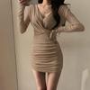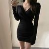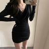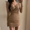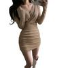 Vestido de otoño e invierno con mangas largas cruzadas en el pecho y escote en V profundo, sexy, ajustado, con pliegues y falda a la cadera.