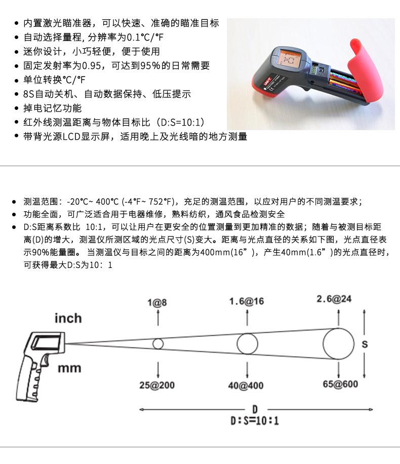Rango de medición de temperatura: -20℃~ 400℃ (-4℉~ 752℉), rango de medición de temperatura suficiente para satisfacer los diferentes requisitos de medición de temperatura de los usuarios;