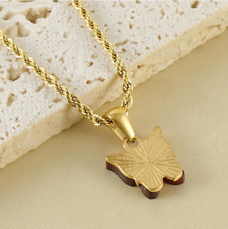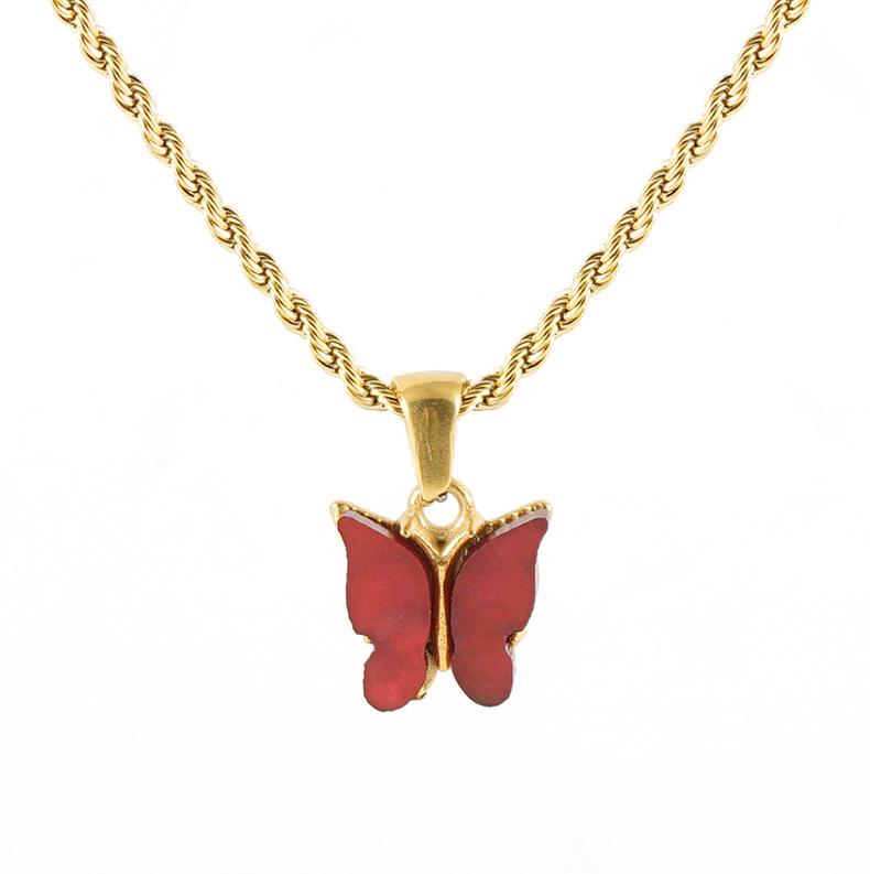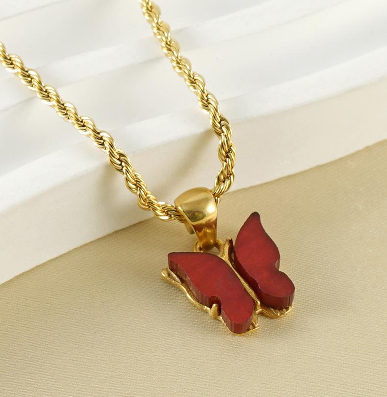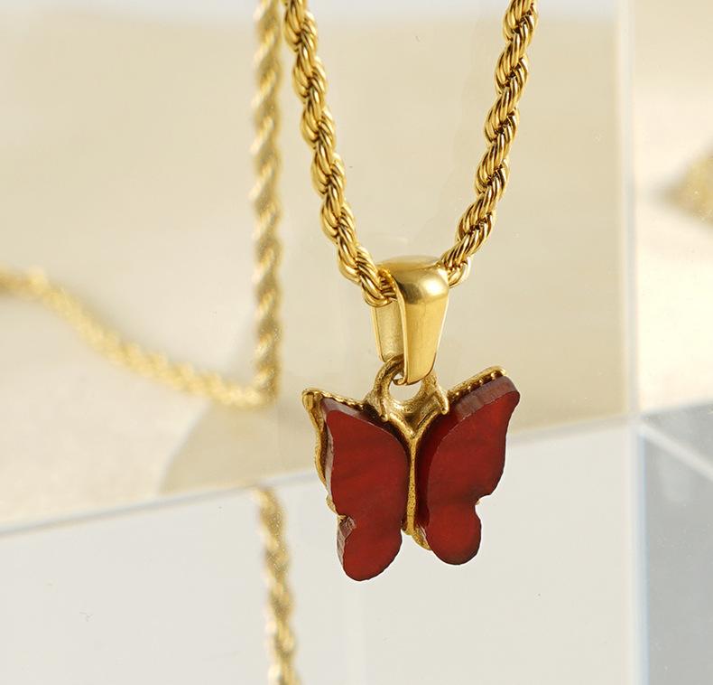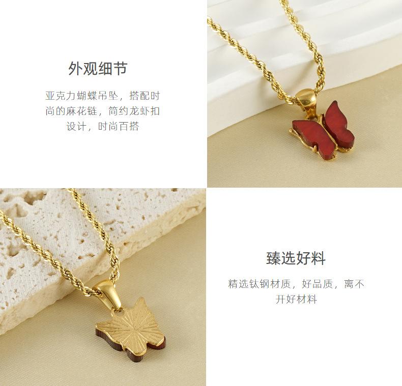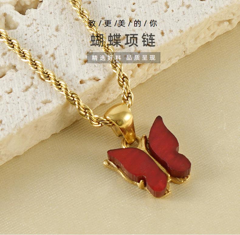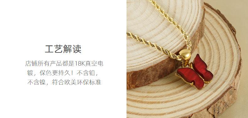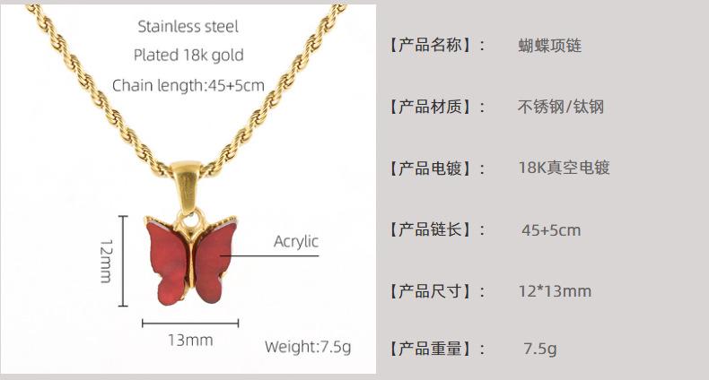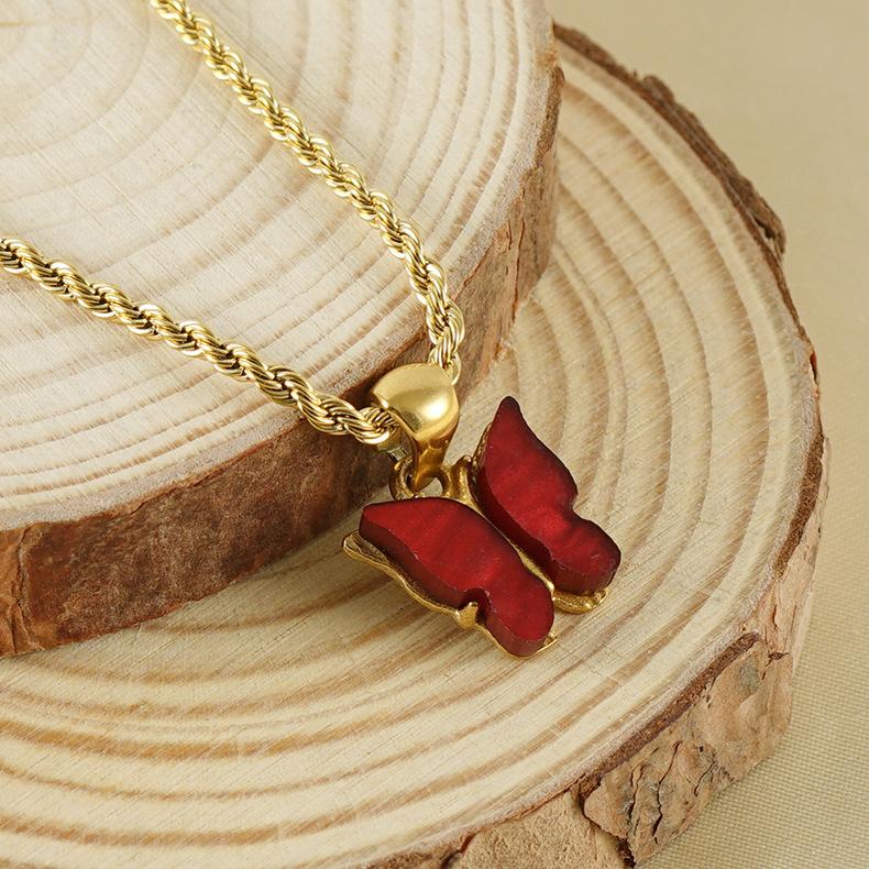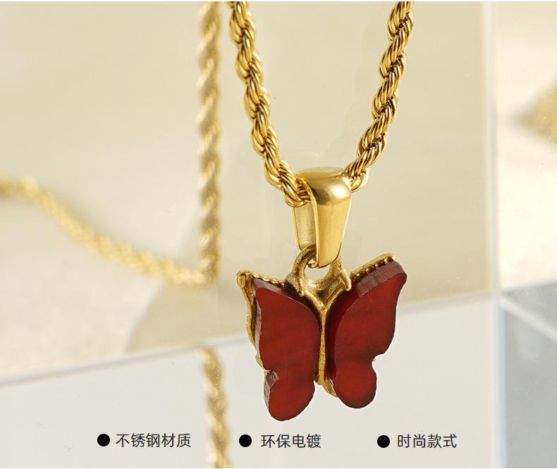 Collar de mariposa de acero inoxidable estilo europeo y americano con colgante de mariposa roja acrílica, cadena torcida de acero de titanio de 18 quilates para mujer