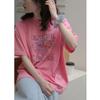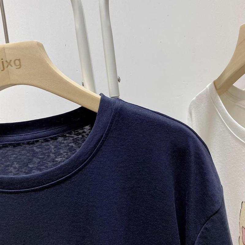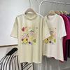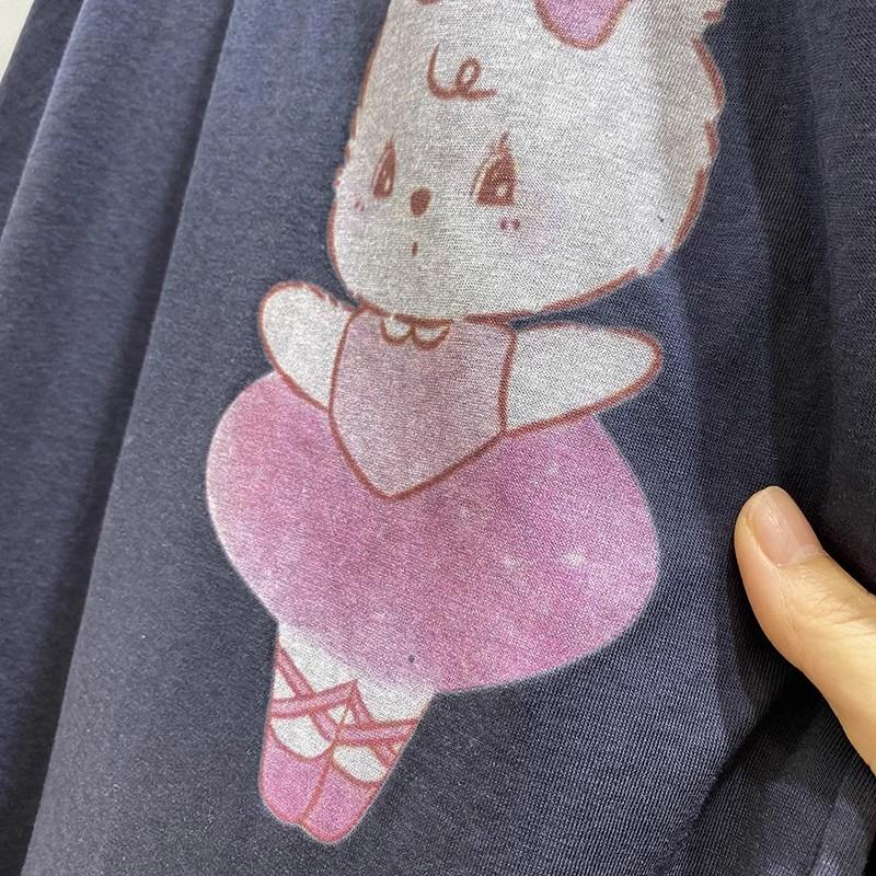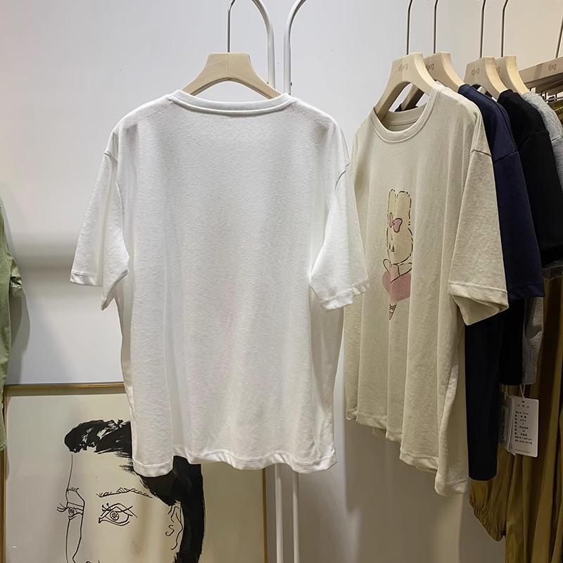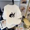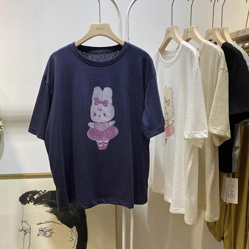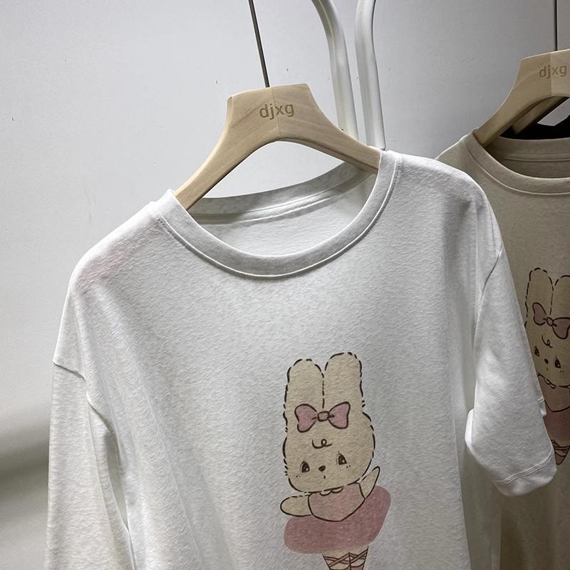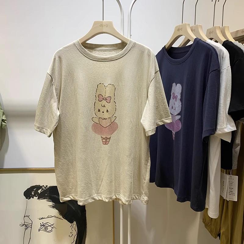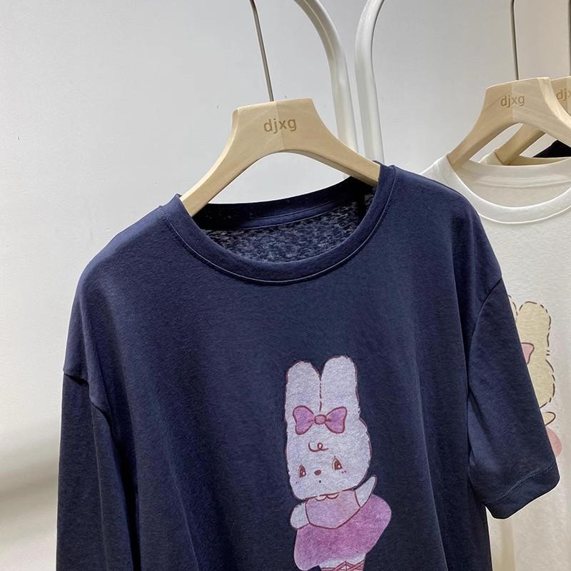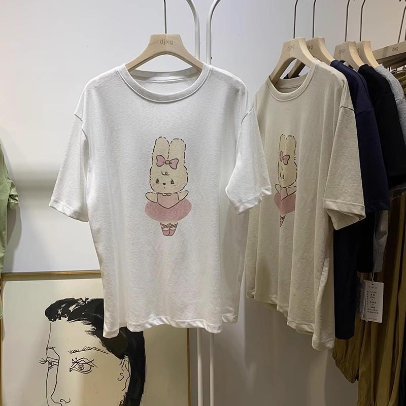 Camiseta de verano para mujer, de manga corta, holgada y cómoda, con cuello de algodón y estampado de conejito de dibujos animados, ideal para salir.
