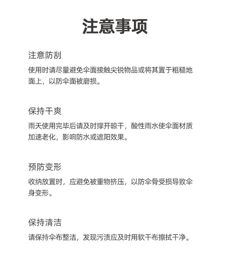 1. Si no abre y firma para inspección en persona después de recibir la mercancía, el comprador será responsable de cualquier daño a la entrega expresa. 2. El producto afecta las ventas secundarias (la etiqueta se pierde y se desfigura) 3. El producto ha sido utilizado o ha sido dañado por personas. 4. Exceder el plazo prescrito (válido por 15 días) Accidentes que pueden ocurrir fácilmente durante el transporte del producto: Los paraguas son artículos frágiles y presentan características especiales durante el envío. En ocasiones, pueden sufrir daños internos debido a una carga y descarga bruscas o a problemas de embalaje durante el envío exprés. Por lo tanto, se ruega a los compradores que inspeccionen la mercancía en persona al firmar la recepción. Si observan algún daño, presenten una reclamación de inmediato a la empresa de mensajería o contacten con el personal de atención al cliente para tomar fotos u obtener un certificado del repartidor. Si no se detectan daños tras firmar la recepción, la responsabilidad recaerá sobre la persona que firmó la recepción. Por favor, sean amables y proactivos. Cooperen para evitar molestias mutuas.