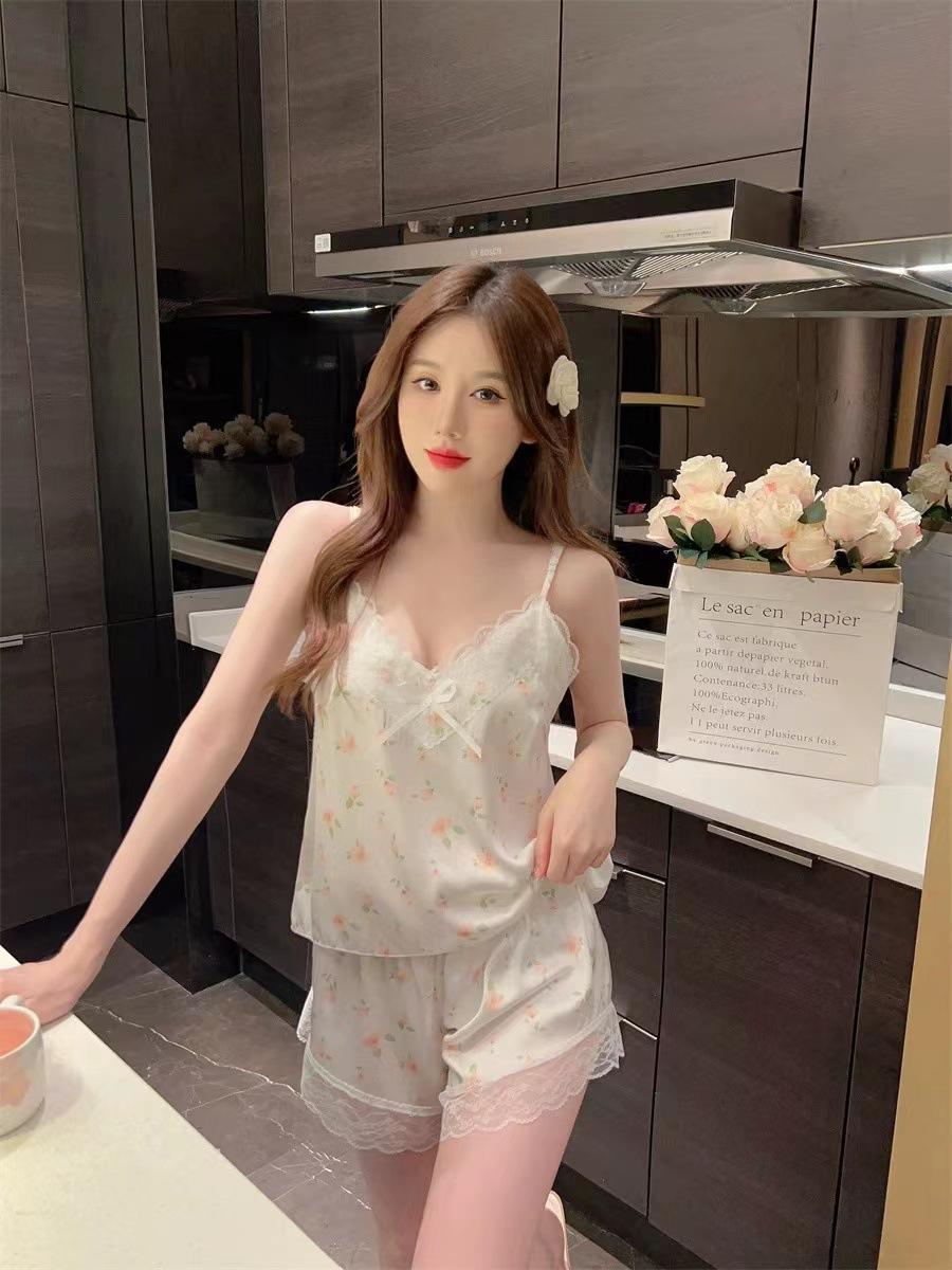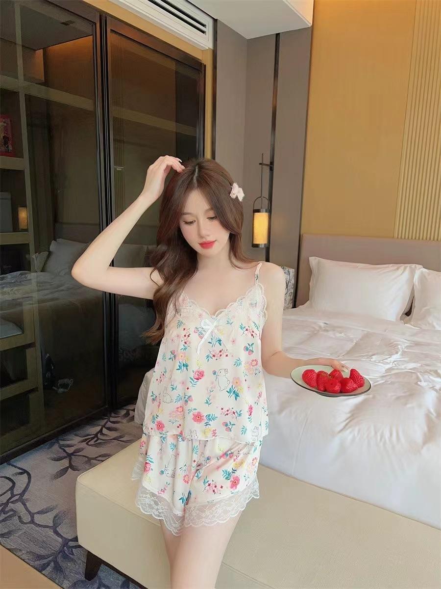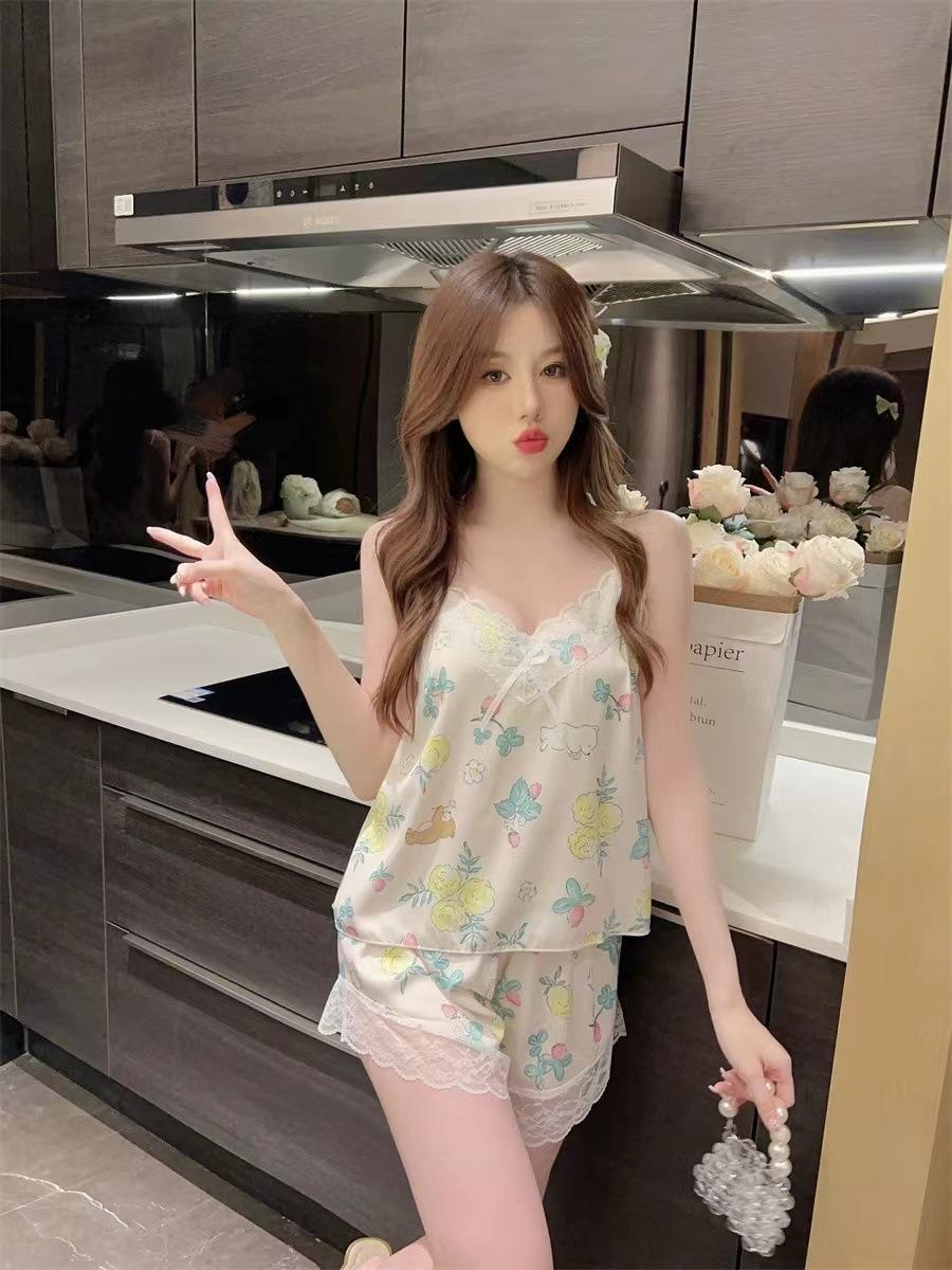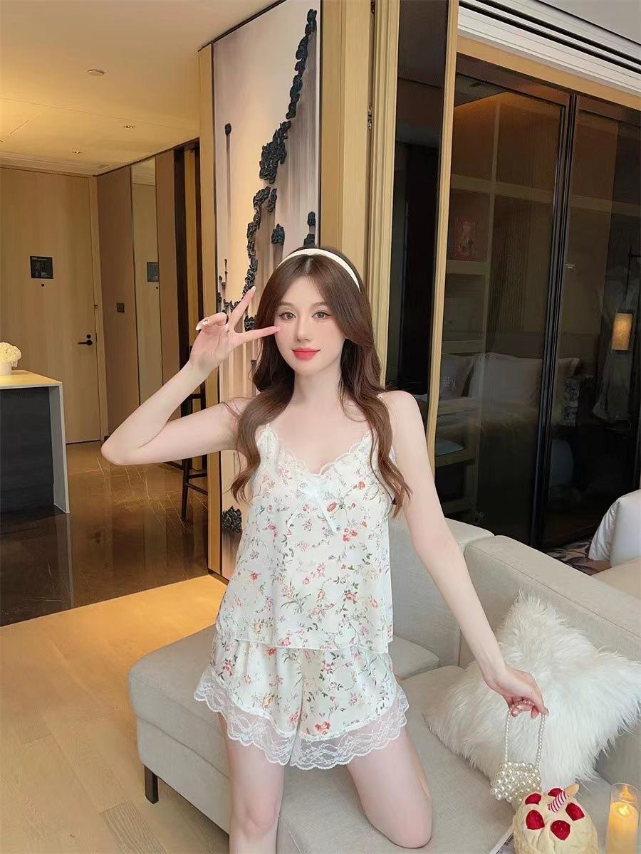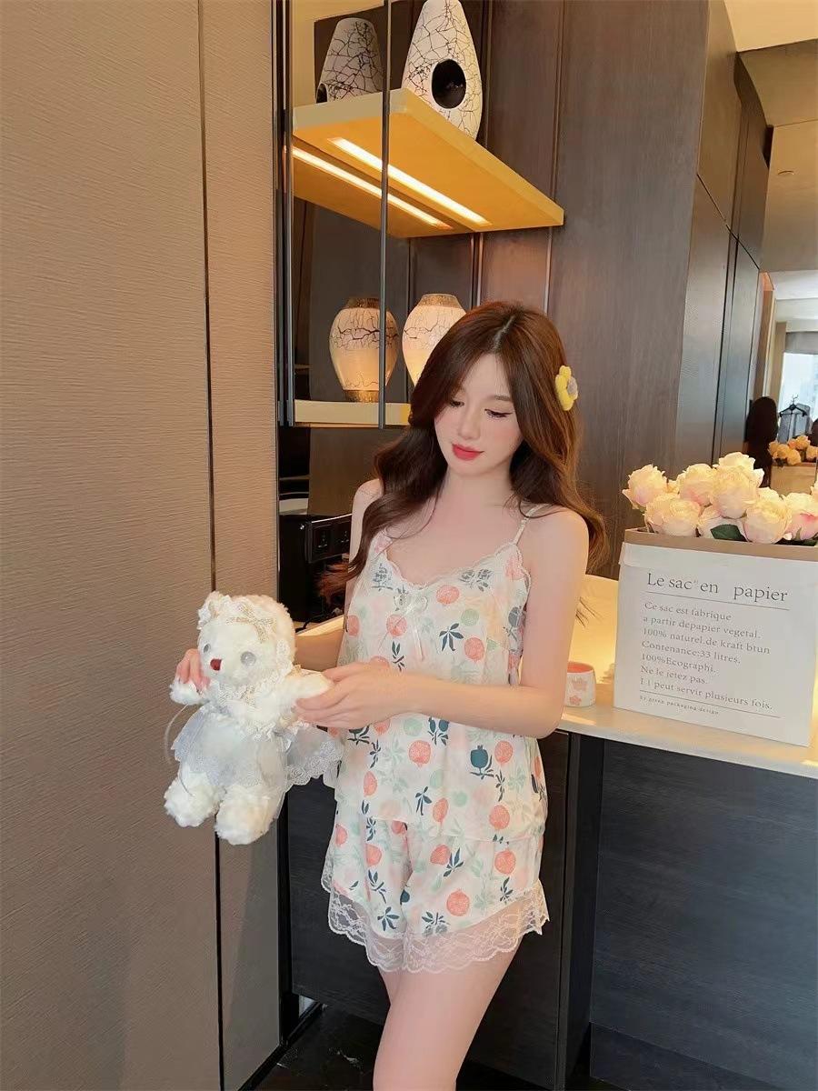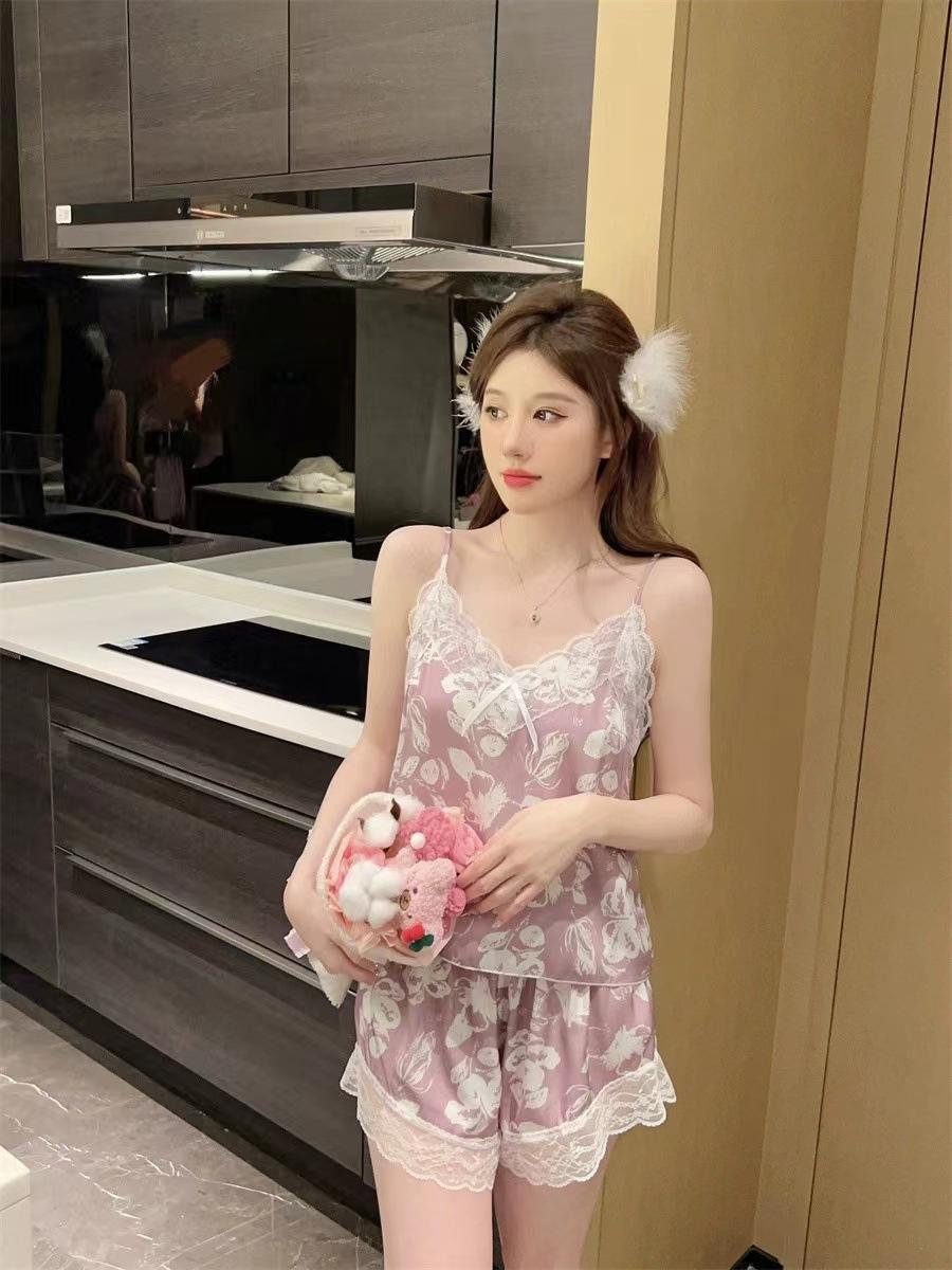 Pijama de verano de estilo nuevo para niña, serie dulce y linda, pantalones cortos colgantes, estilo Pure Desire, conjunto de dos piezas con escote en V pequeño y encaje
