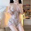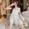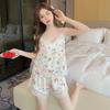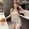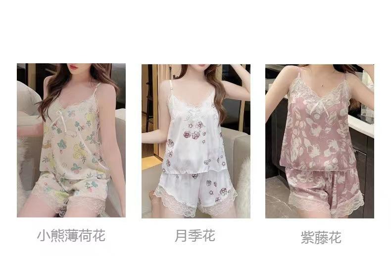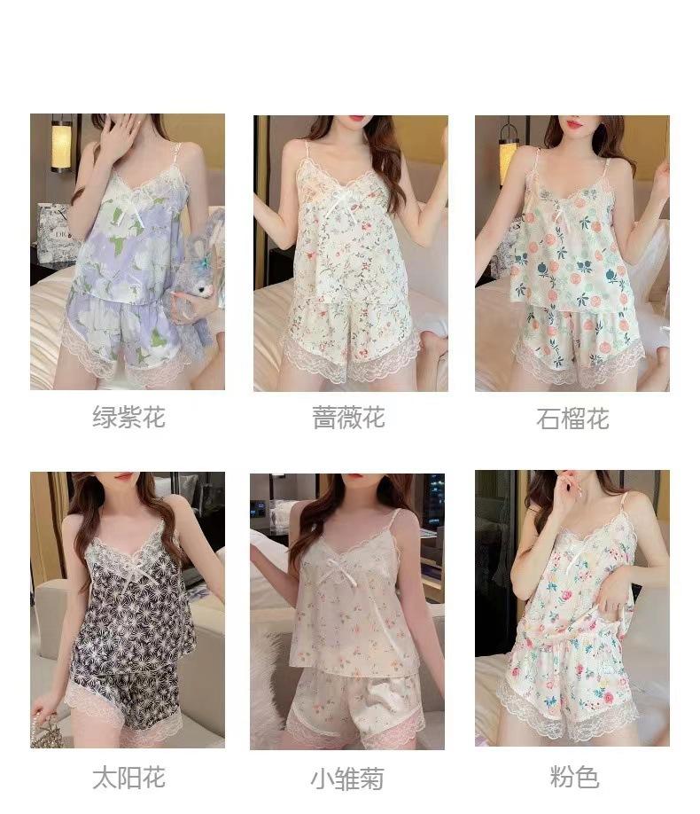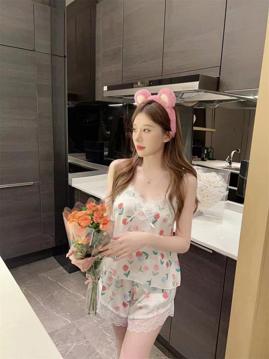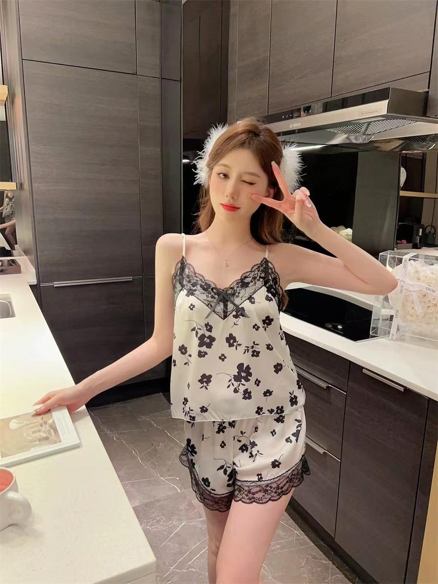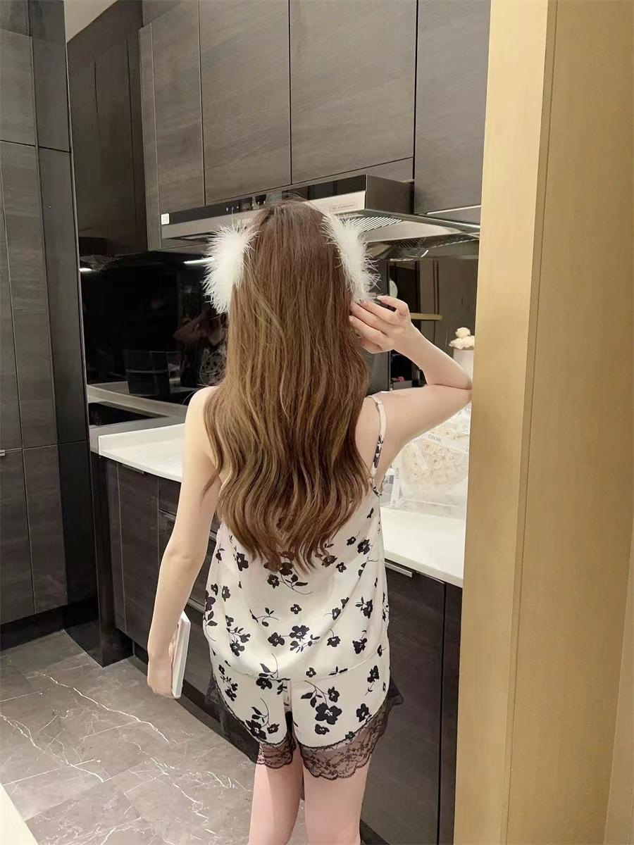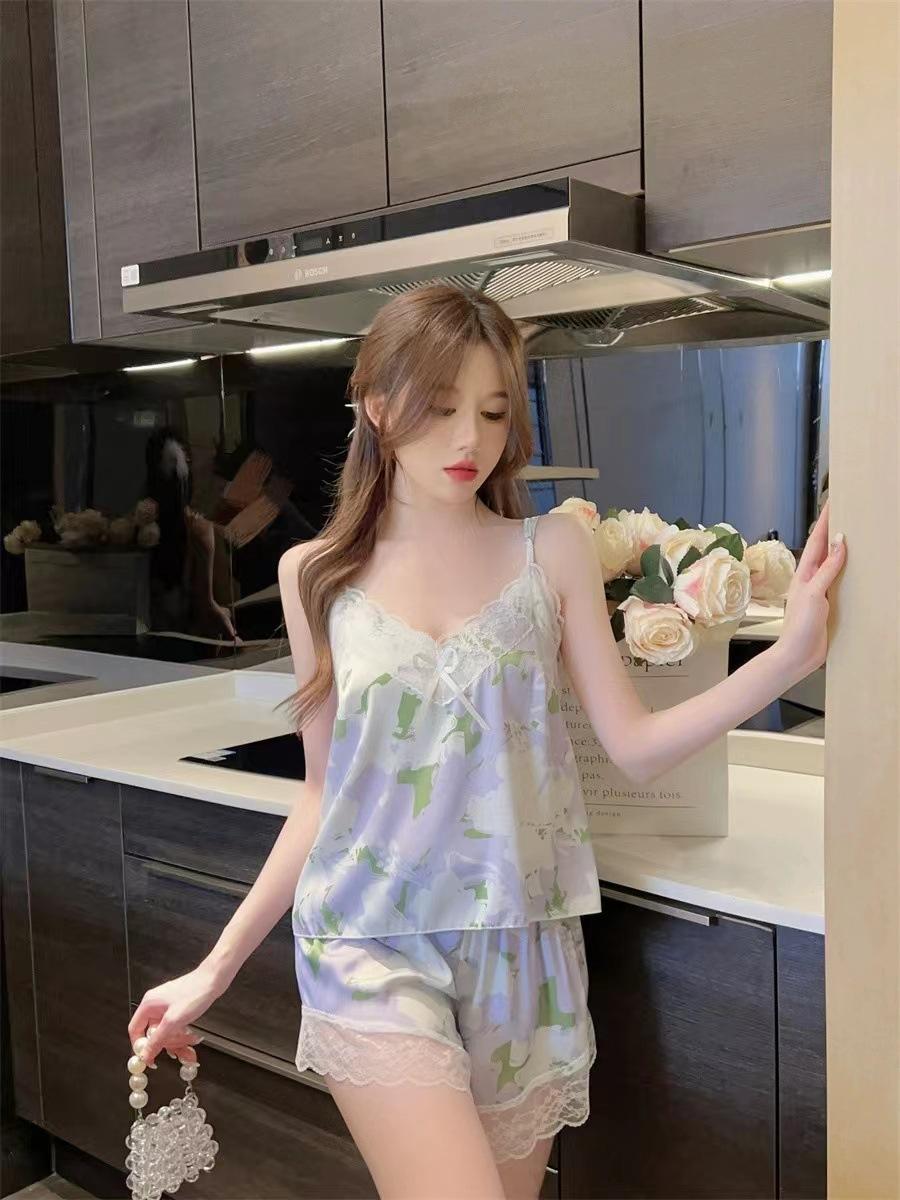 Pijama de verano de estilo nuevo para niña, serie dulce y linda, pantalones cortos colgantes, estilo Pure Desire, conjunto de dos piezas con escote en V pequeño y encaje