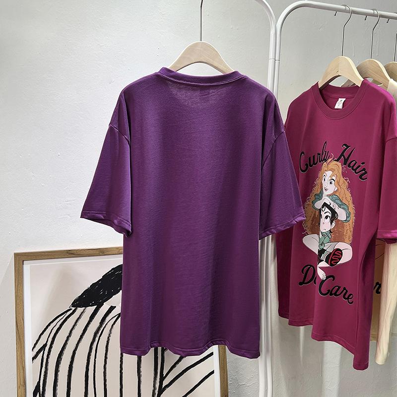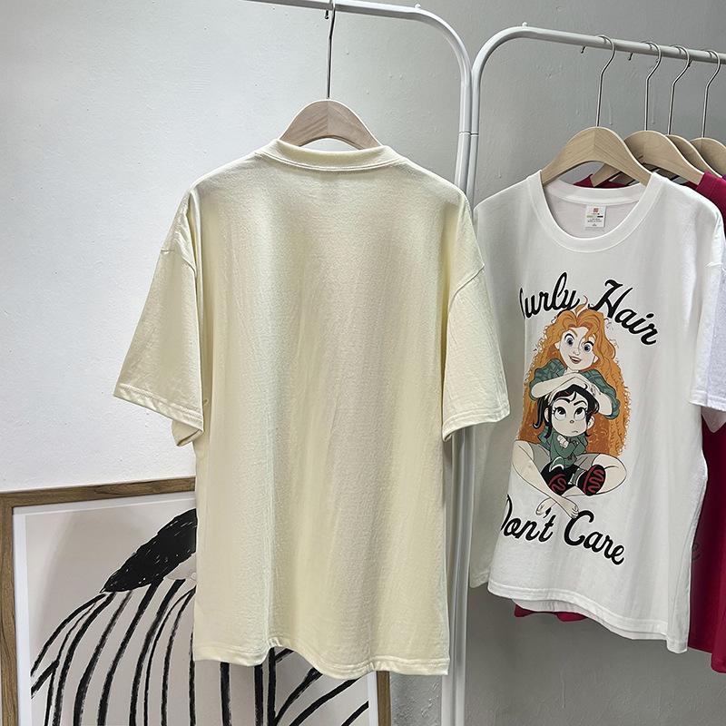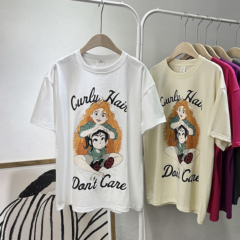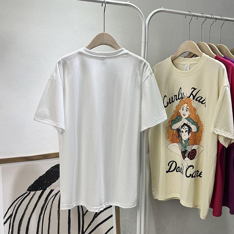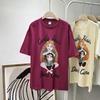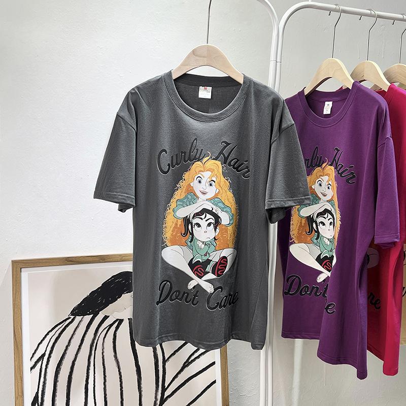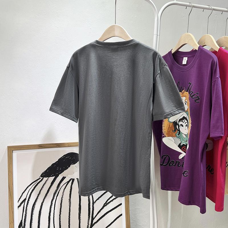 Camiseta de manga corta con cuello de bolsa de algodón para mujer, con estampado de dibujos animados en gris, holgada, informal, de verano, de manga corta, combinable con todo