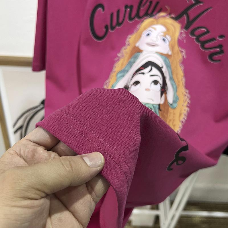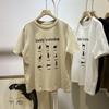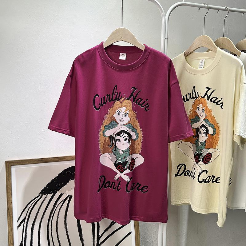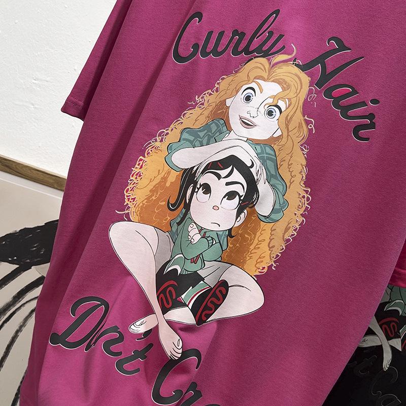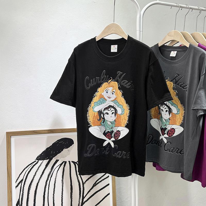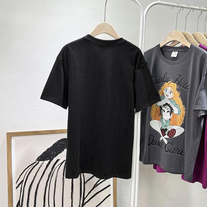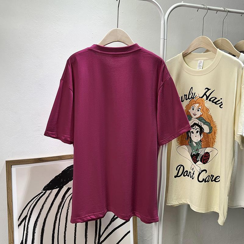 Camiseta de manga corta con cuello de bolsa de algodón para mujer, con estampado de dibujos animados en gris, holgada, informal, de verano, de manga corta, combinable con todo