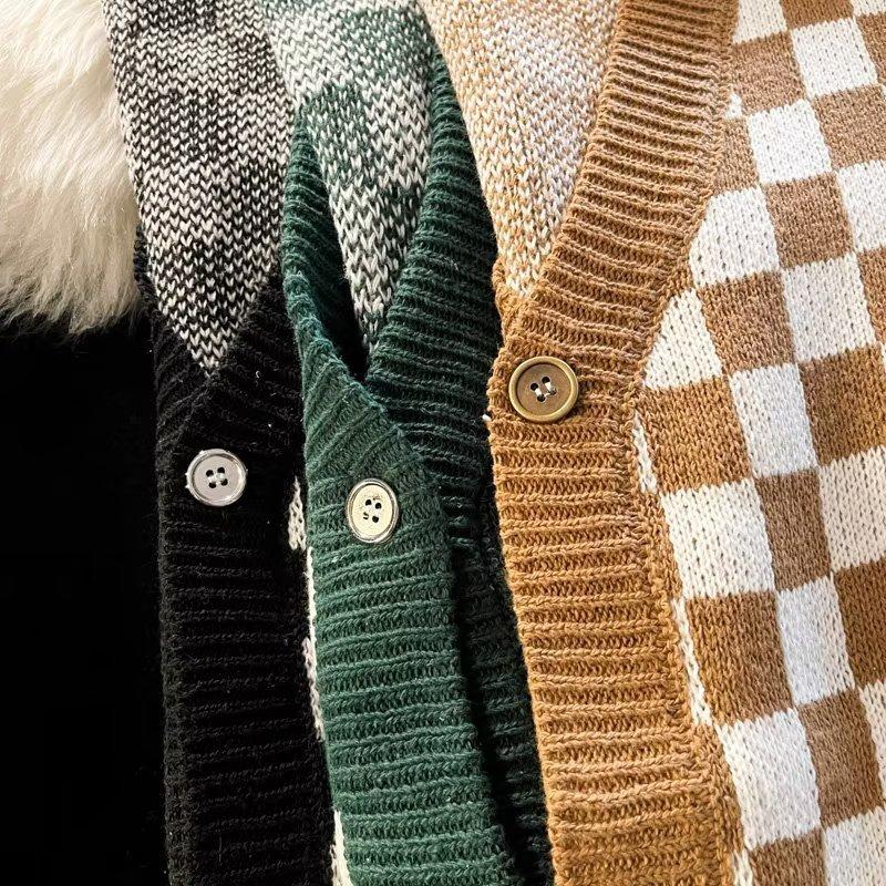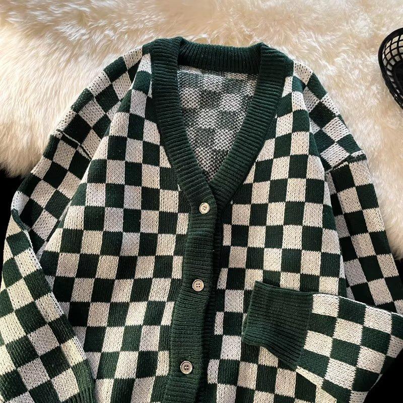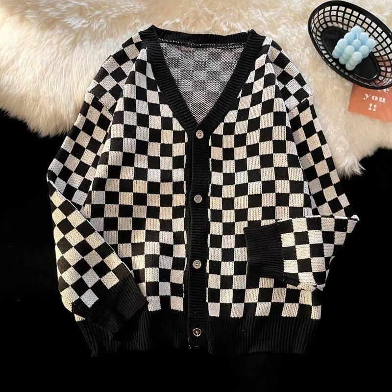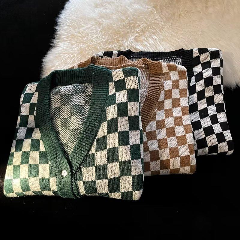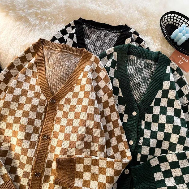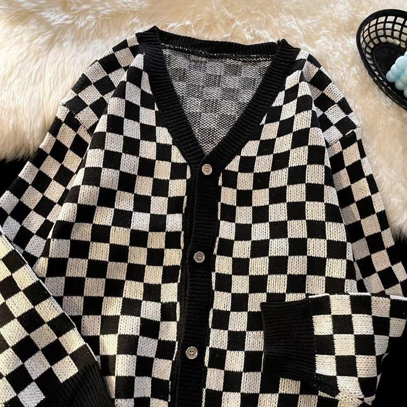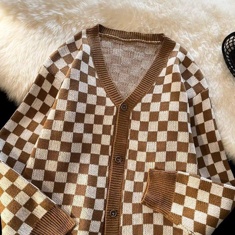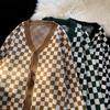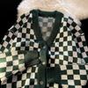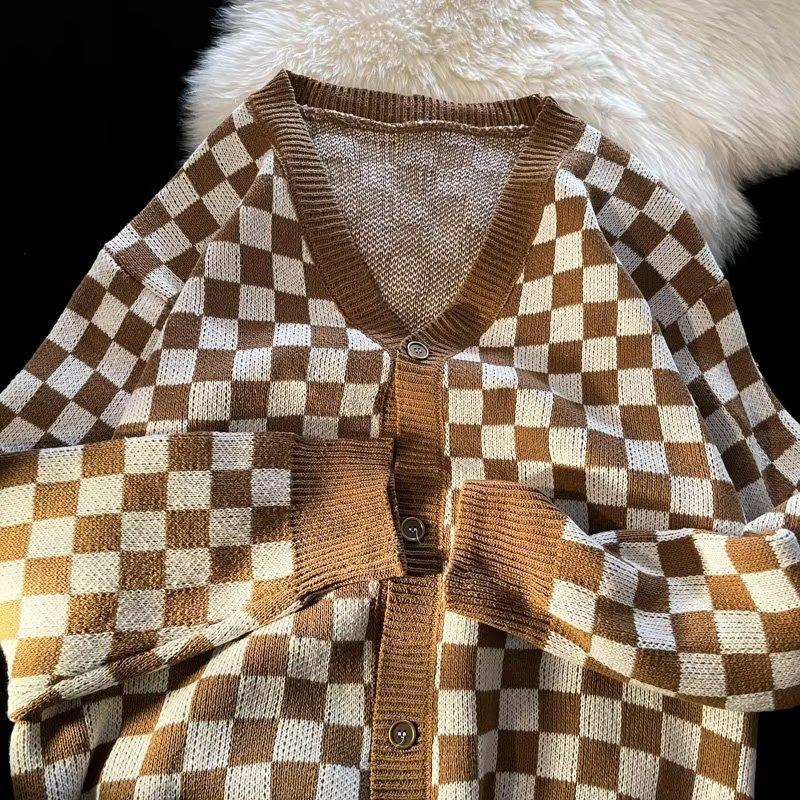 Cárdigan a cuadros Suéter de cuello en V para hombre y mujer Estilo holgado y perezoso Chaqueta de punto para pareja Trendy