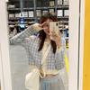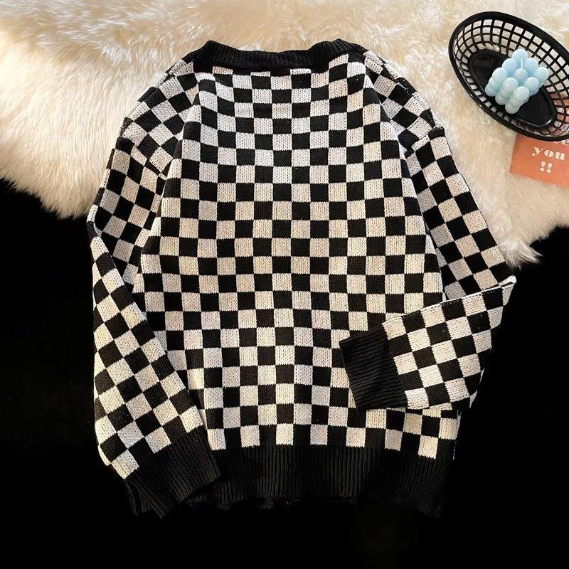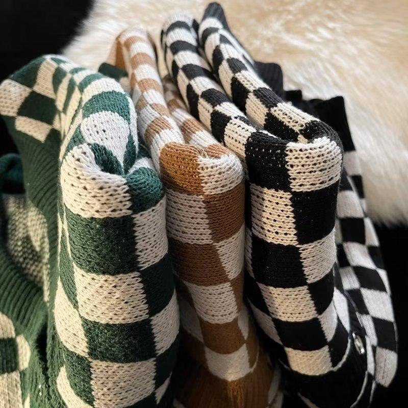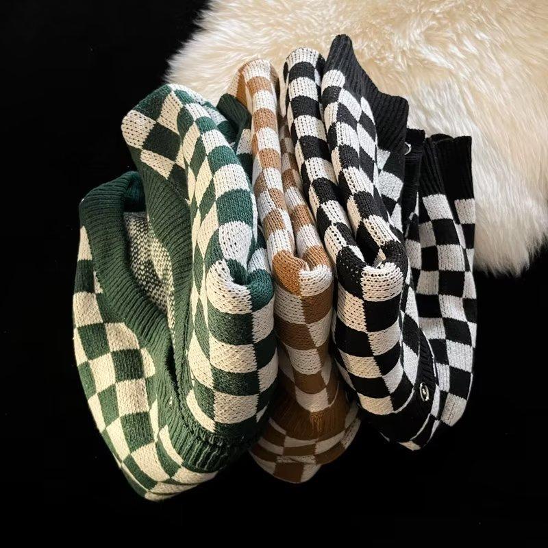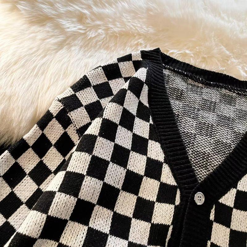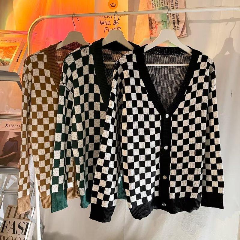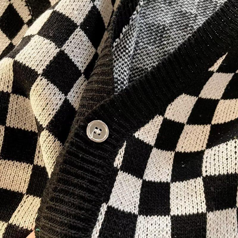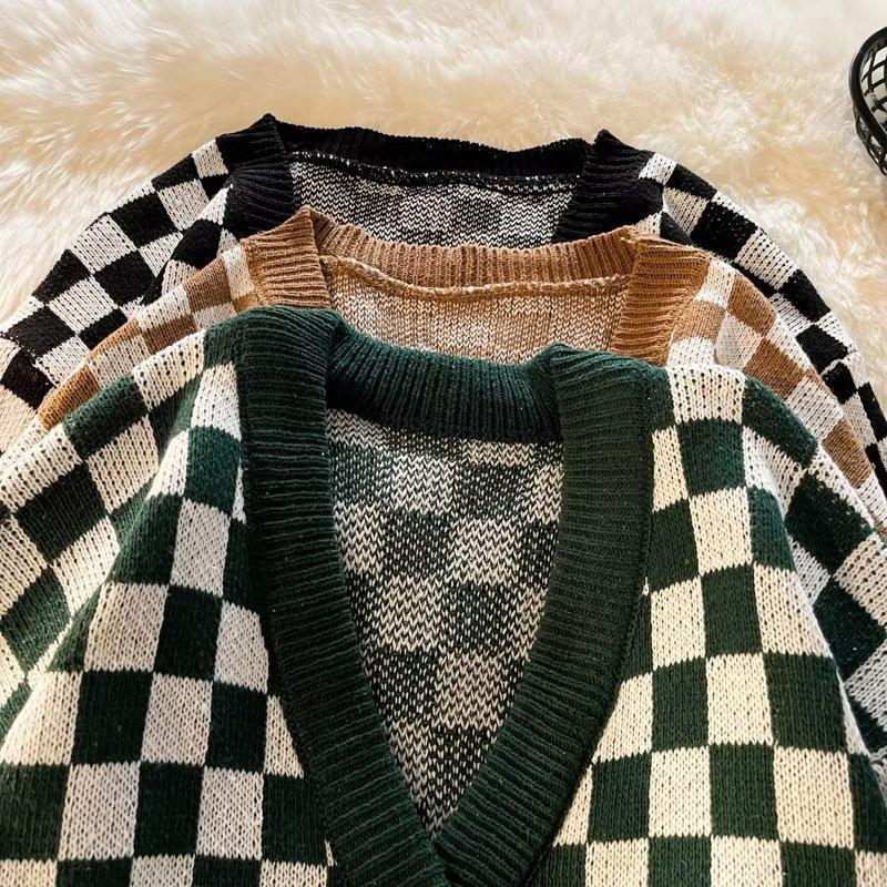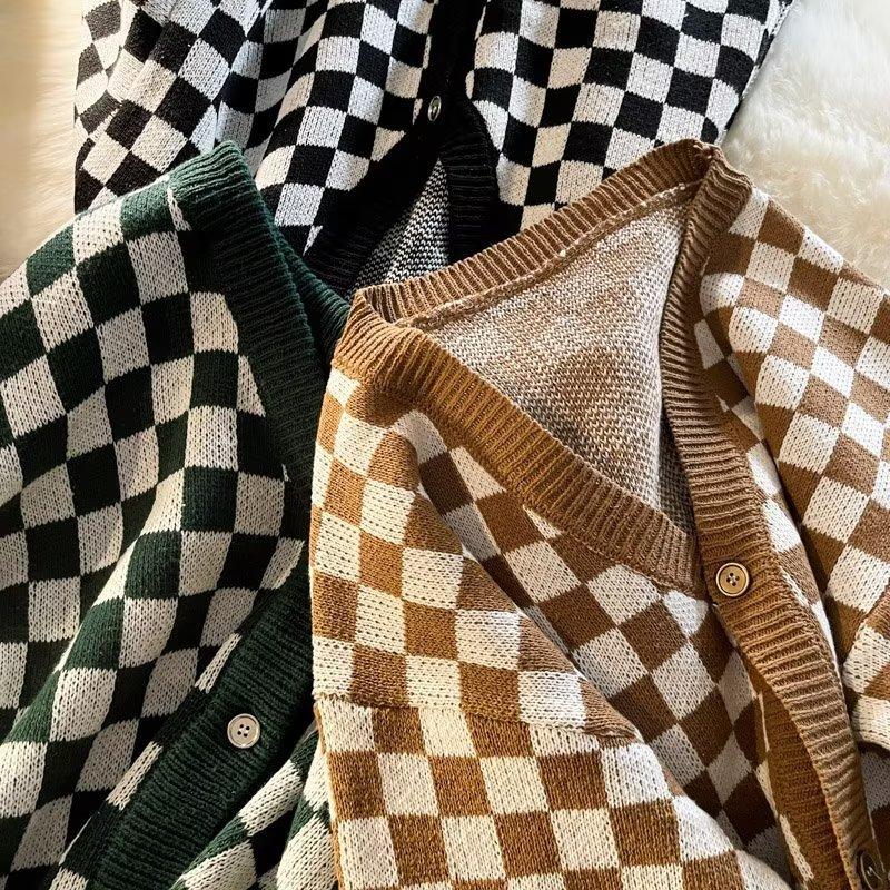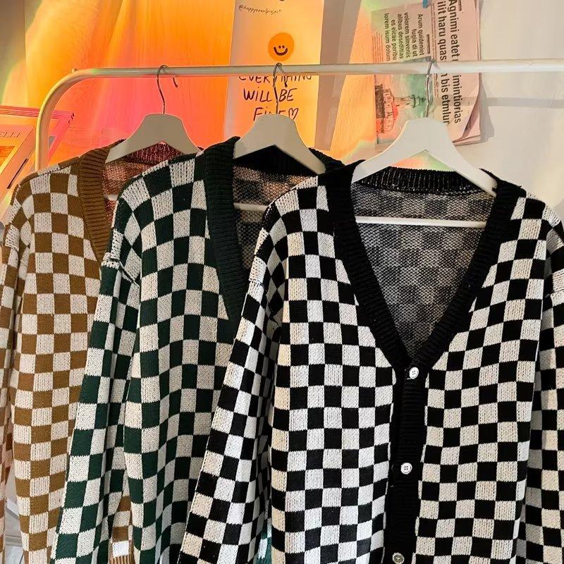 Cárdigan a cuadros Suéter de cuello en V para hombre y mujer Estilo holgado y perezoso Chaqueta de punto para pareja Trendy