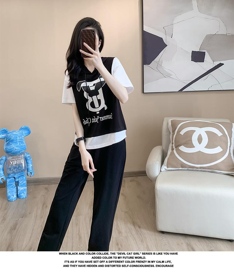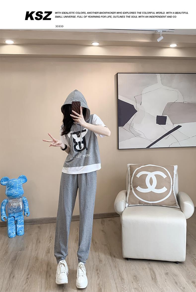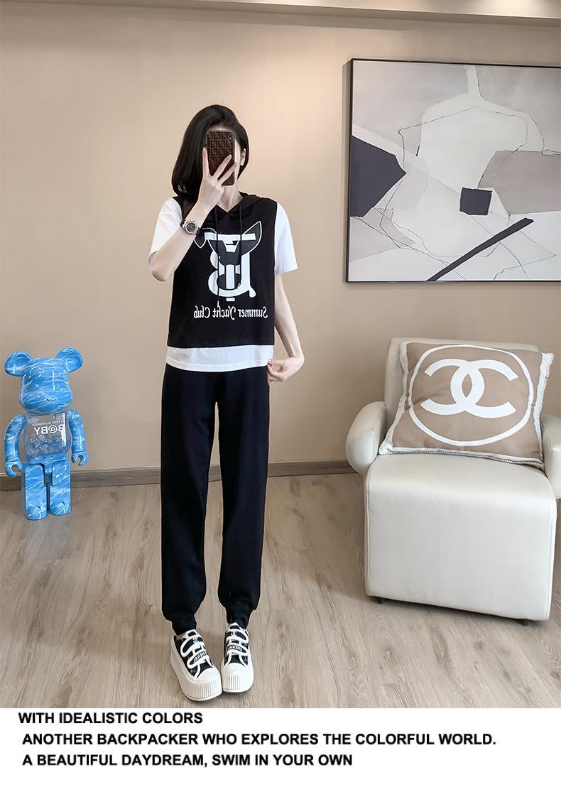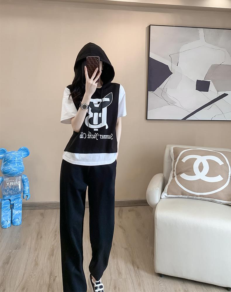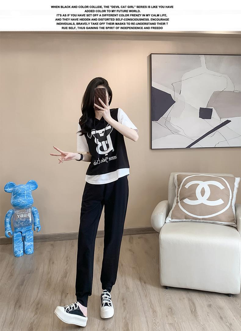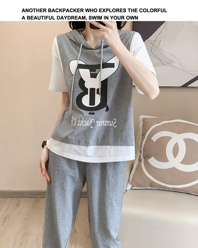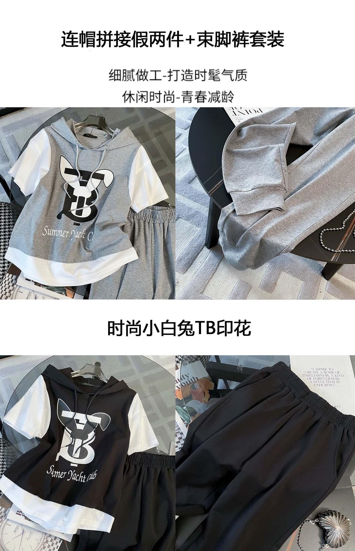 2025 Primavera y Verano Nueva Camiseta de Dos Piezas Falsas con Capucha para Mujer Año del Conejo TB Pantalones Tut Moda Casual Traje Deportivo para Mujer