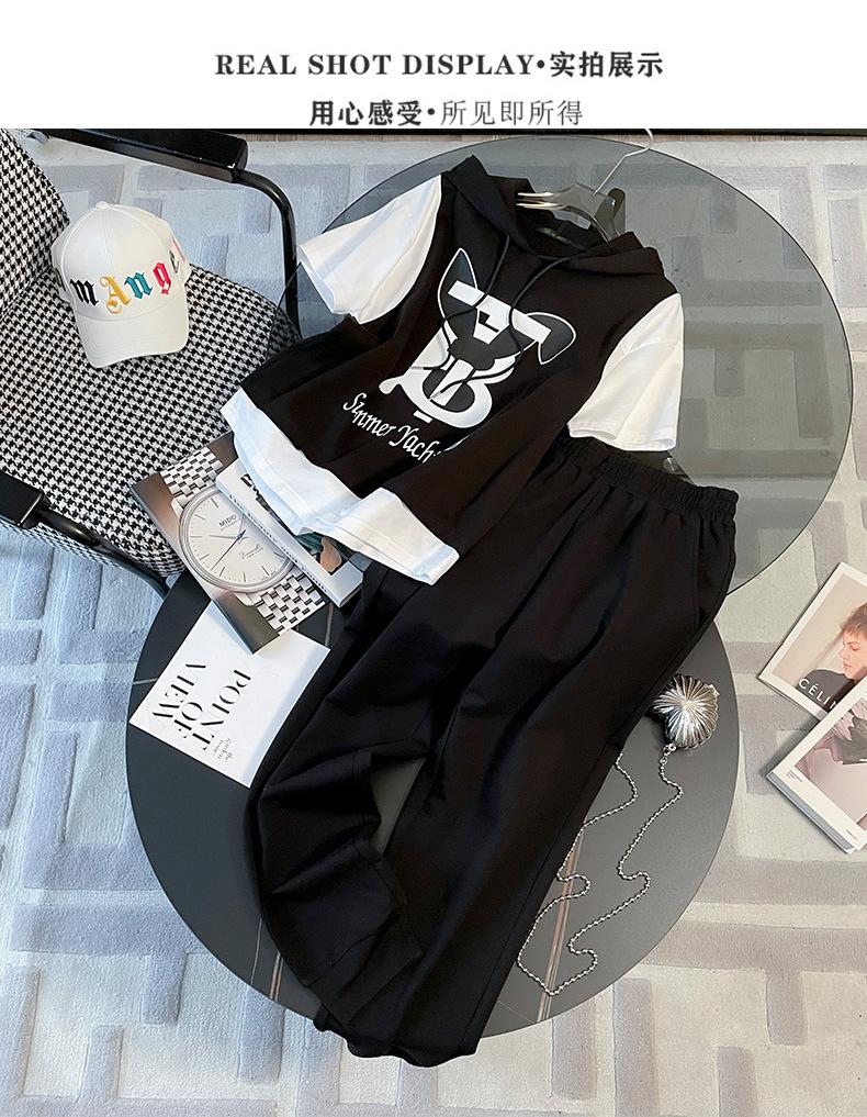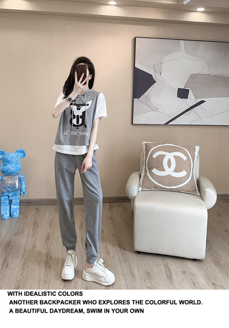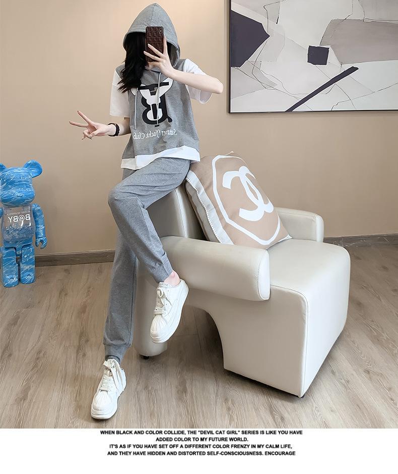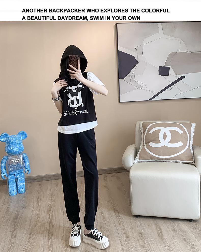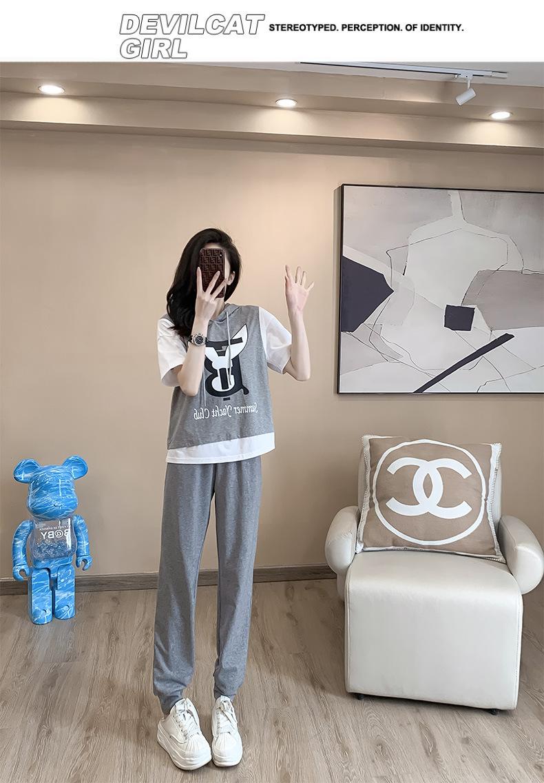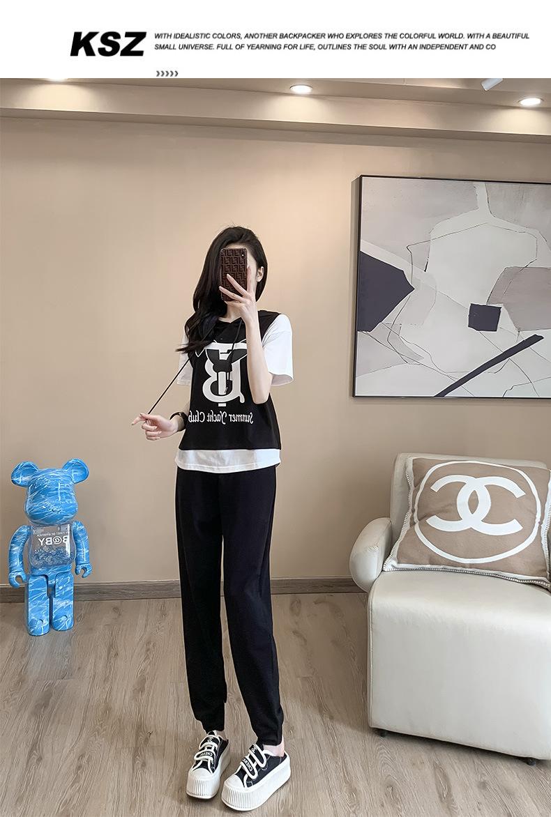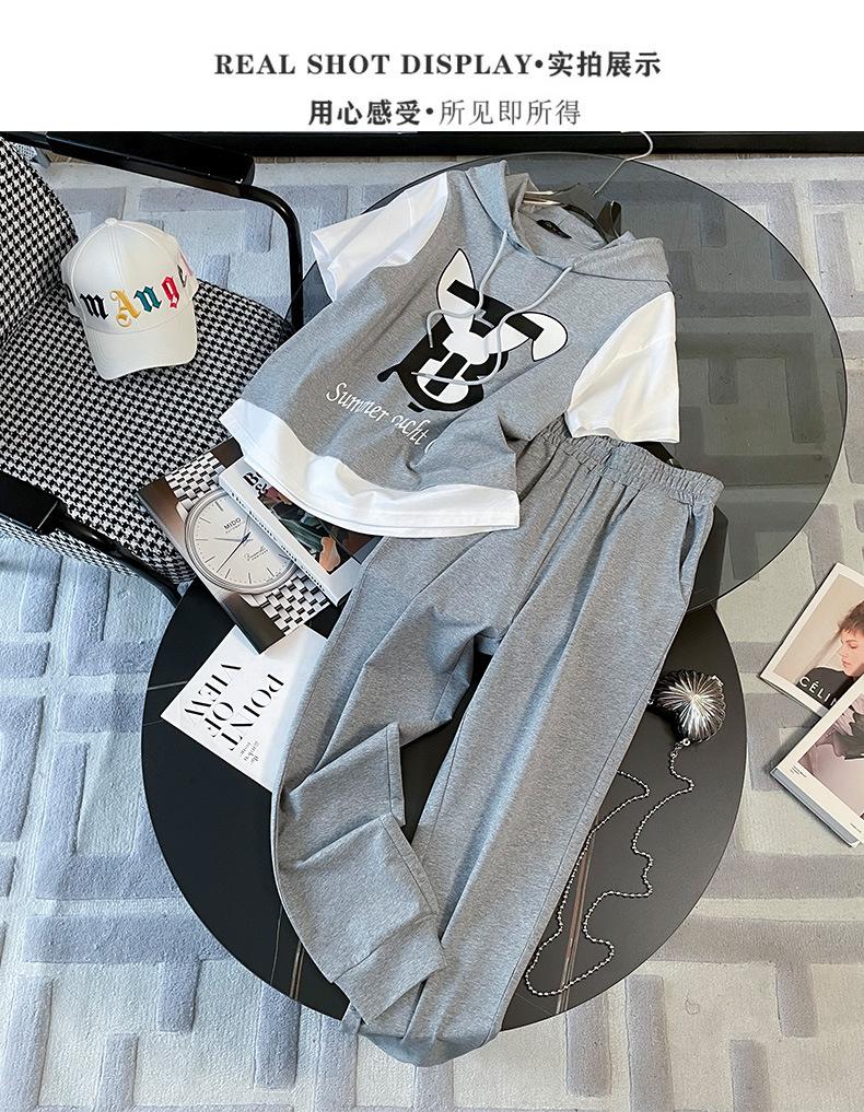 2025 Primavera y Verano Nueva Camiseta de Dos Piezas Falsas con Capucha para Mujer Año del Conejo TB Pantalones Tut Moda Casual Traje Deportivo para Mujer