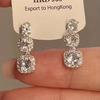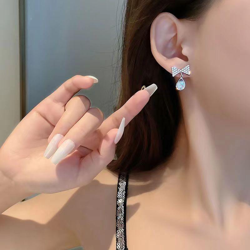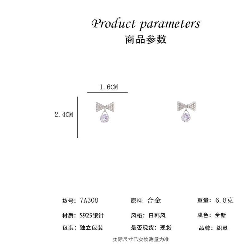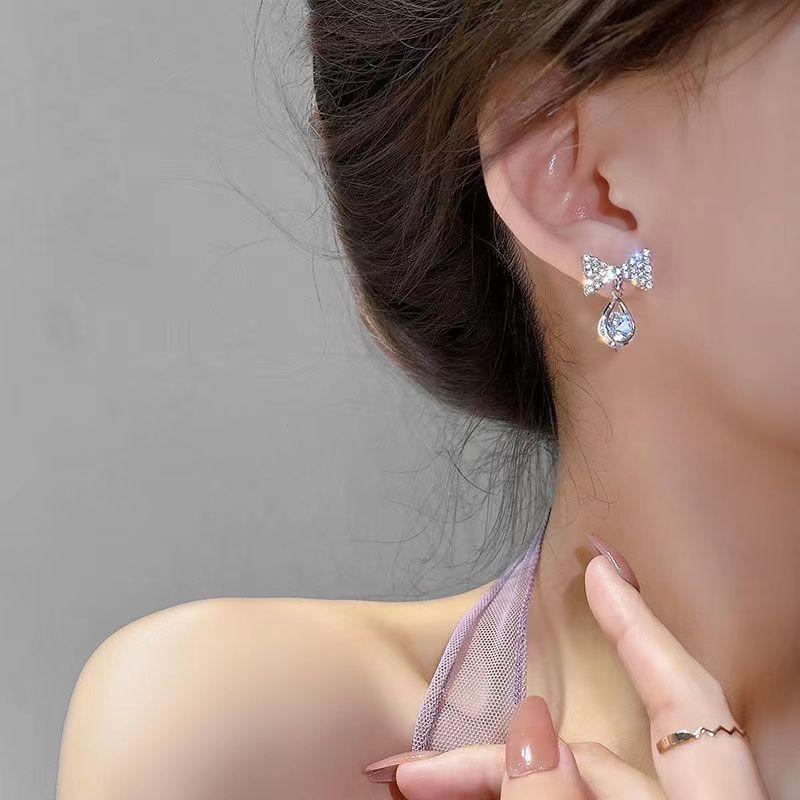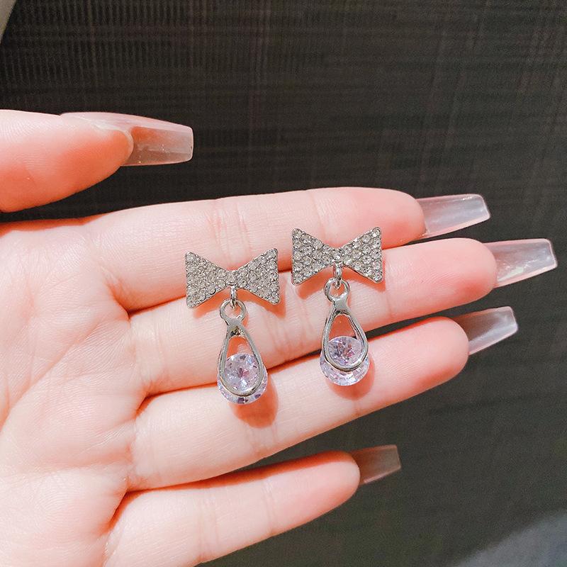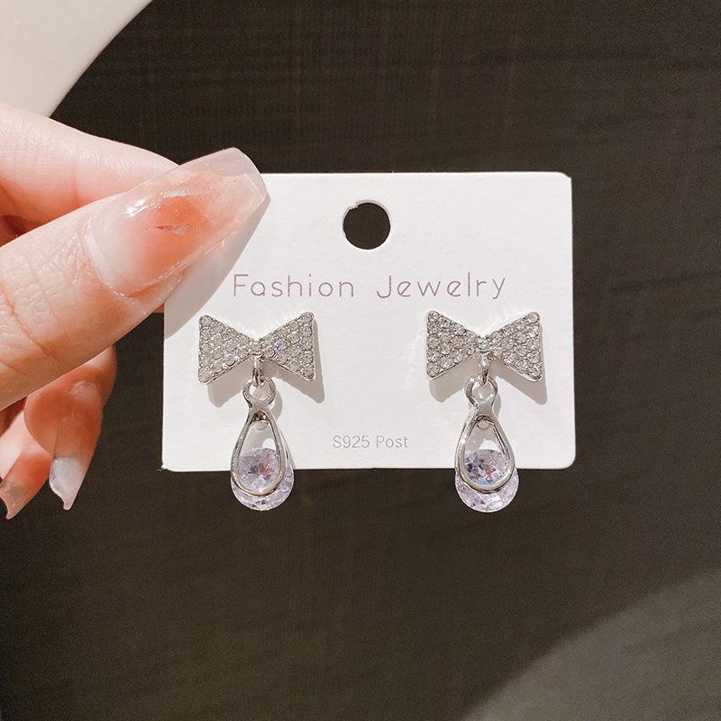 Pendientes de circonita con aguja de plata s925, sencillos y modernos, con cristales incrustados y lazos populares con temperamento de celebridades de Internet para mujer.