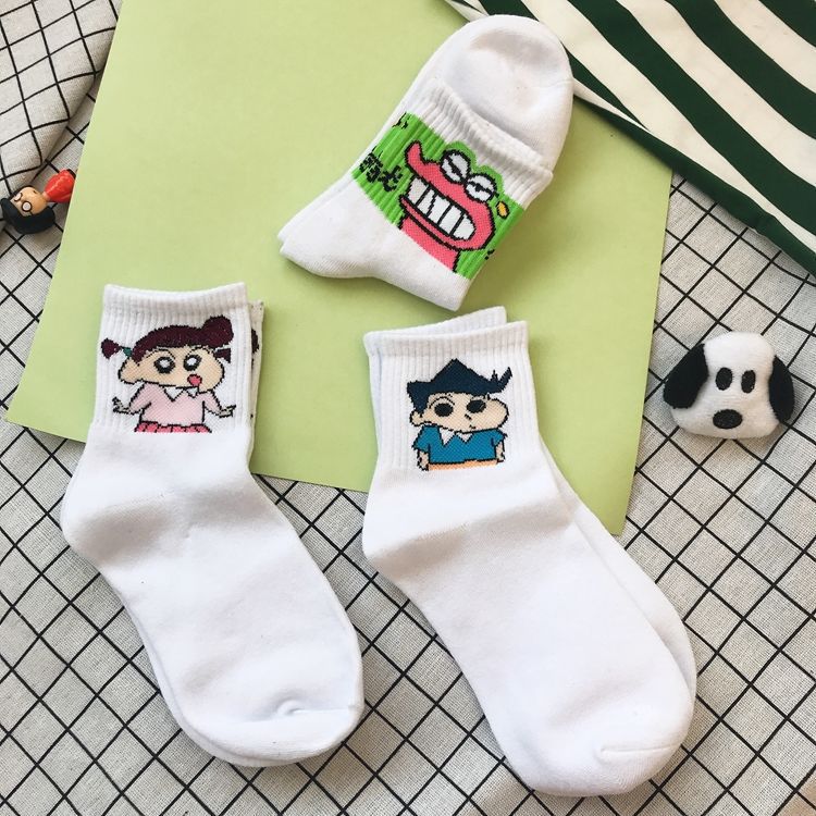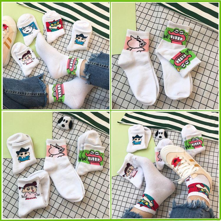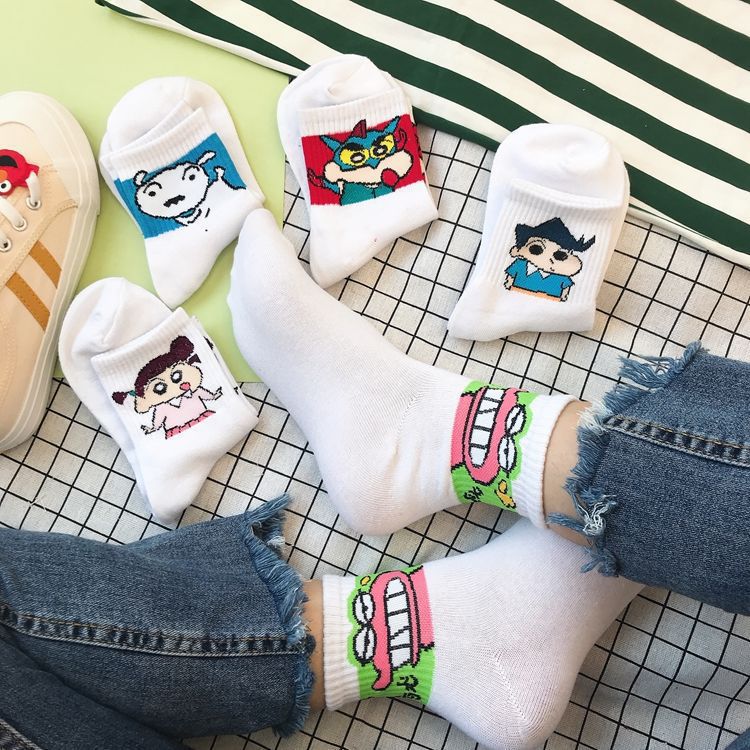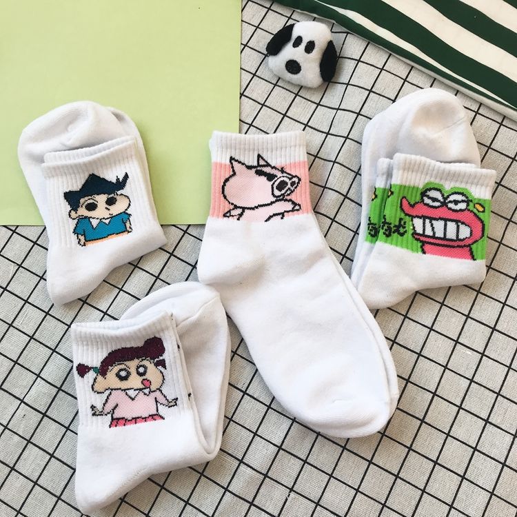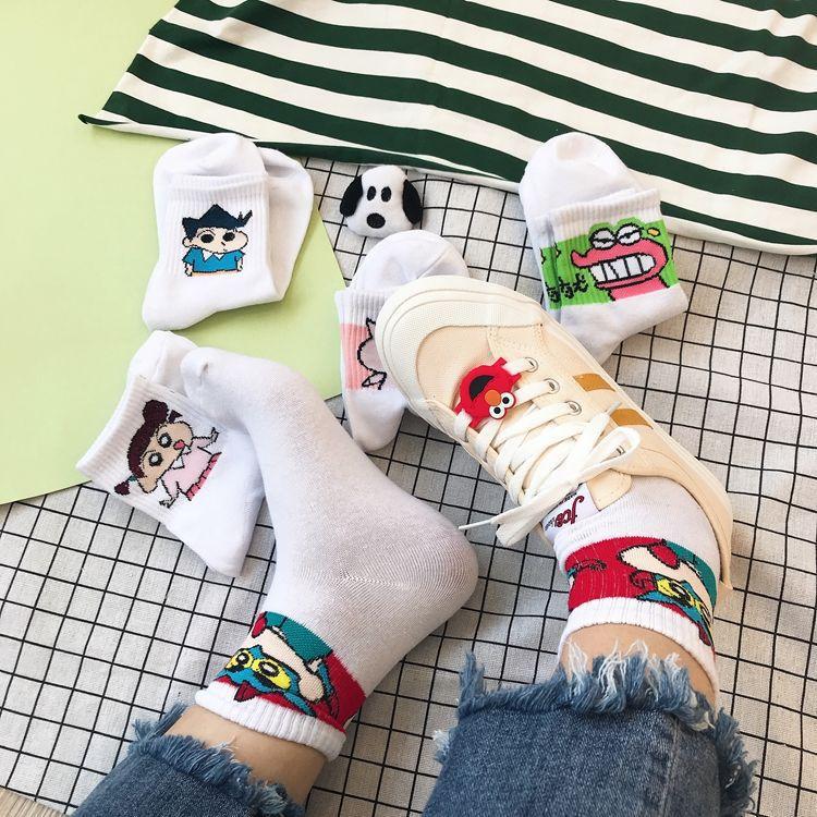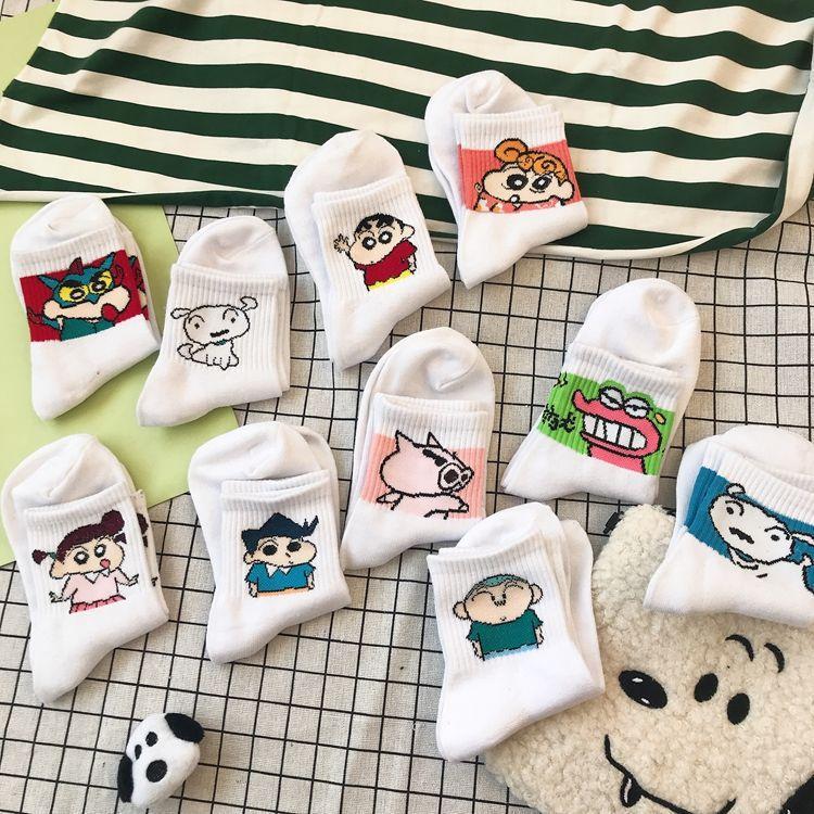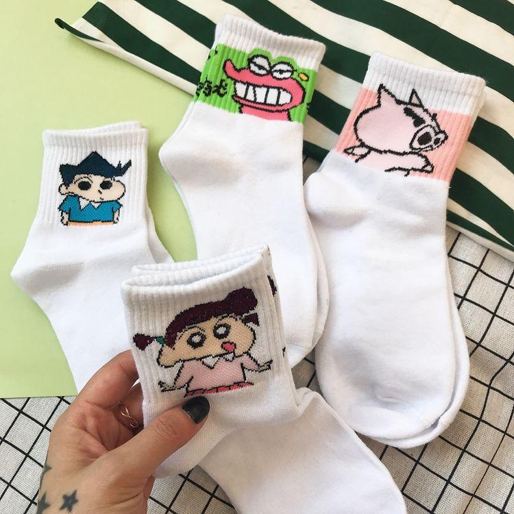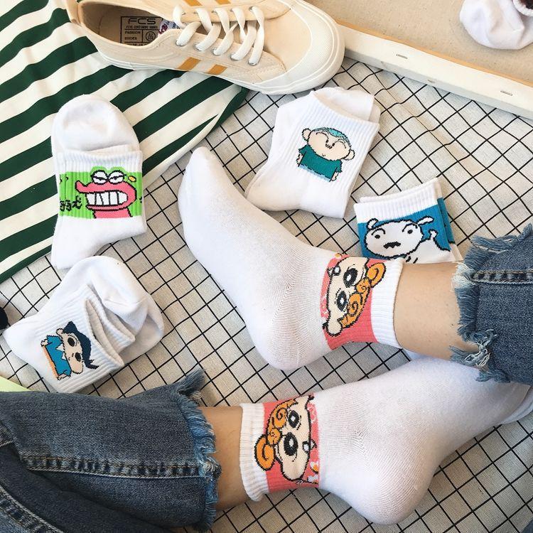 Calcetines de dibujos animados de crayones bonitos de estudiantes japoneses, calcetines deportivos de verano para mujer, calcetines de patineta con personalidad, calcetines de media pantorrilla de moda