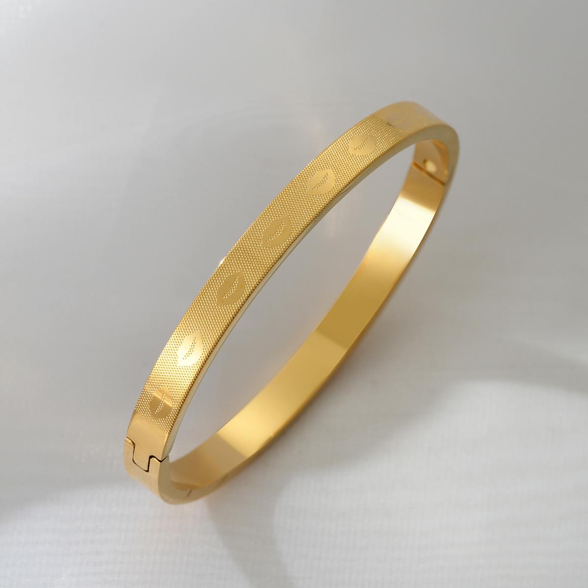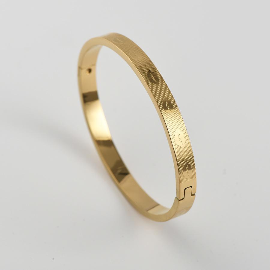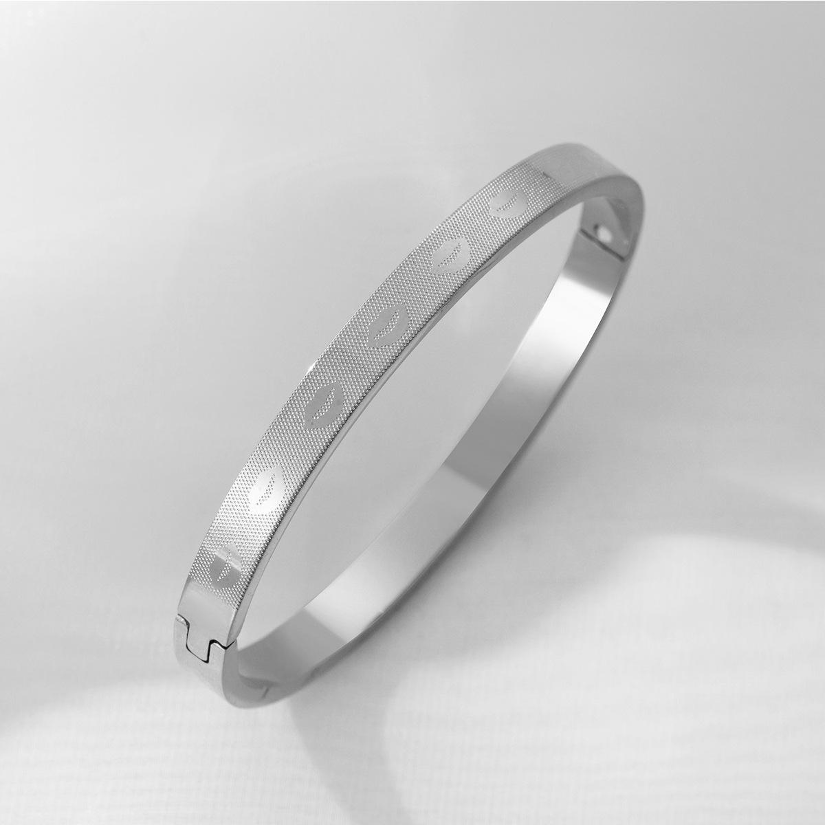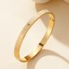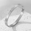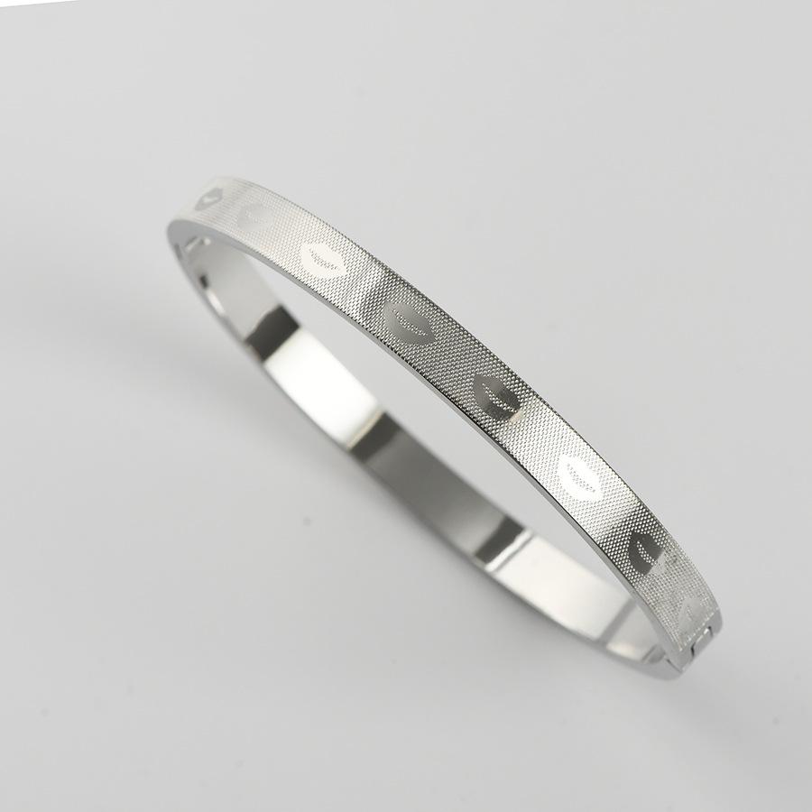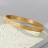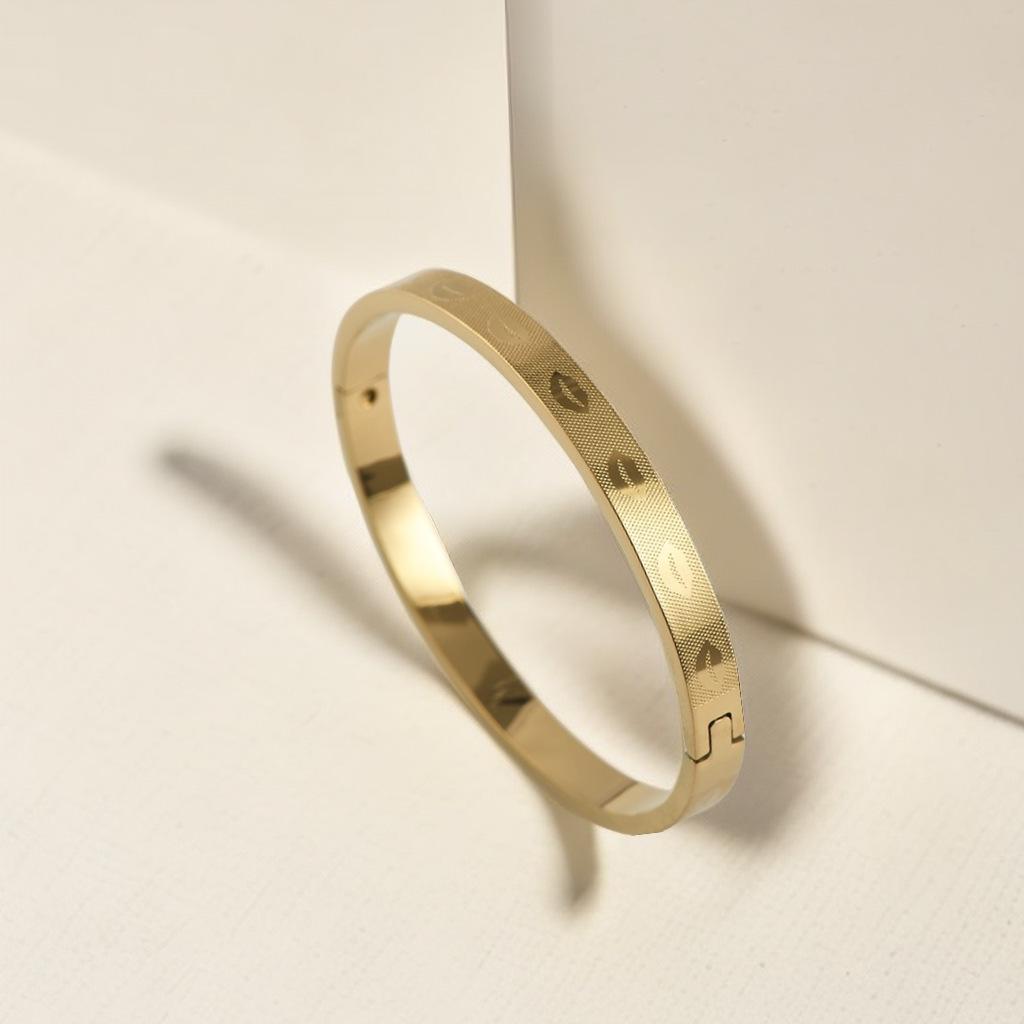 Fabricantes de pulseras de acero de titanio al por mayor, pulsera ajustable abierta en forma de C, pulsera femenina de acero inoxidable con logotipo de texto grabado.