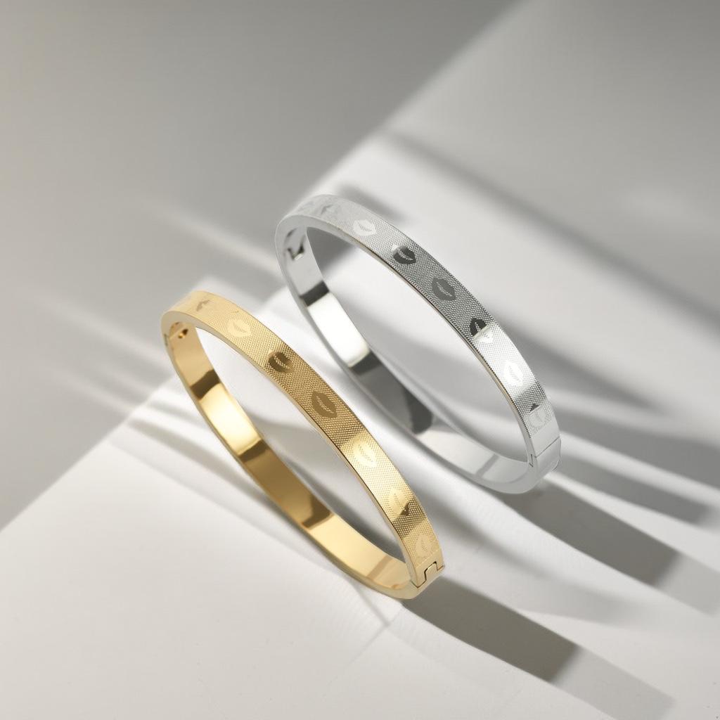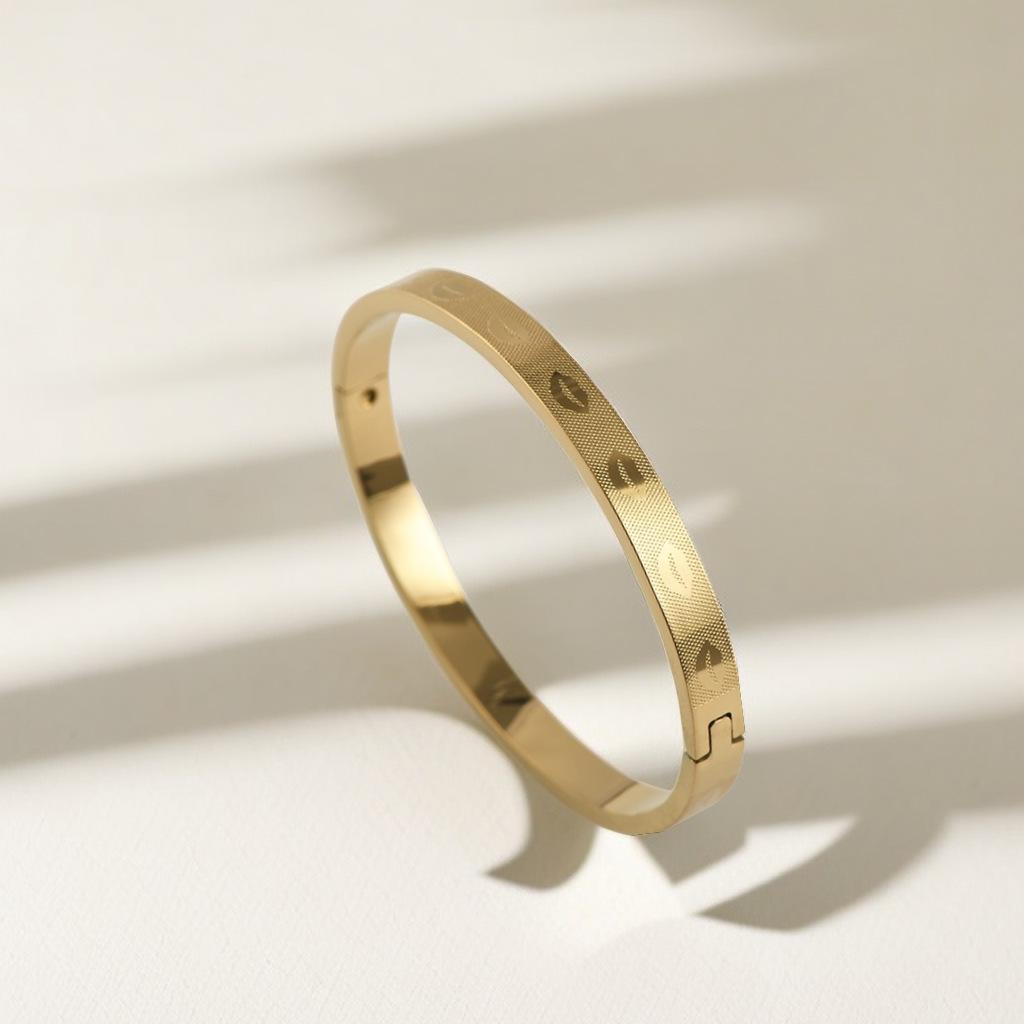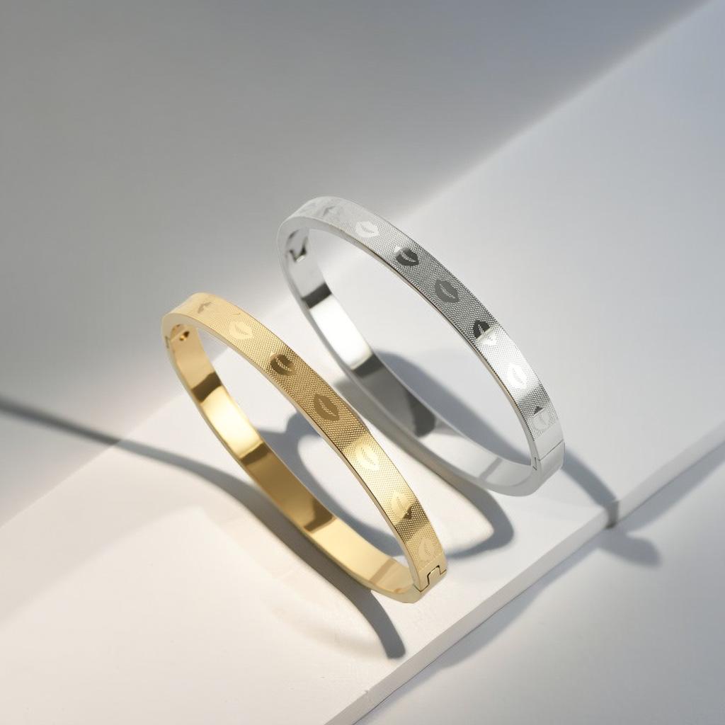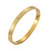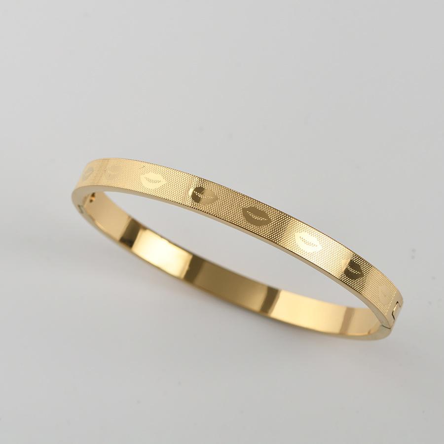 Fabricantes de pulseras de acero de titanio al por mayor, pulsera ajustable abierta en forma de C, pulsera femenina de acero inoxidable con logotipo de texto grabado.