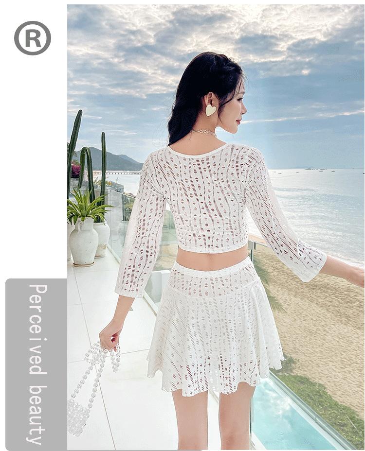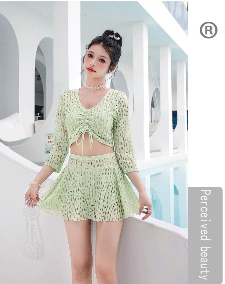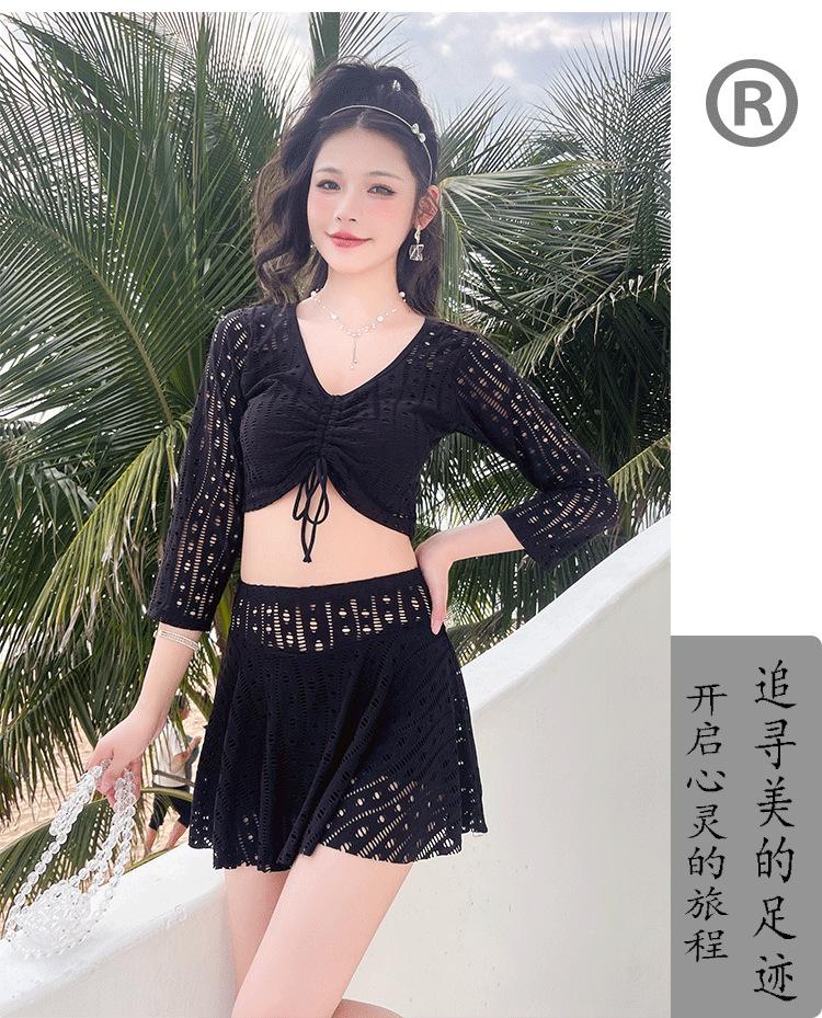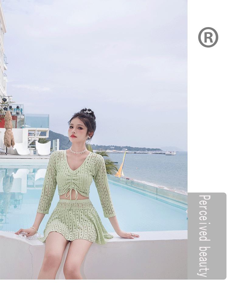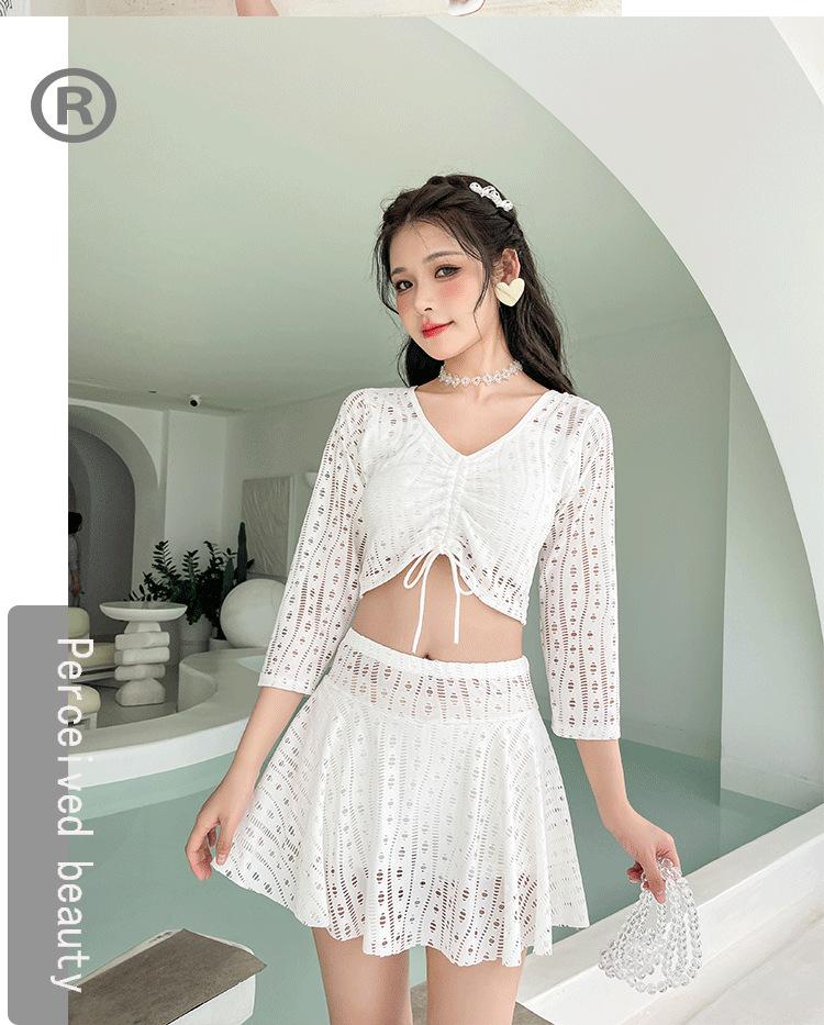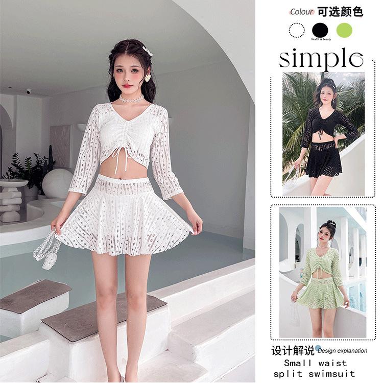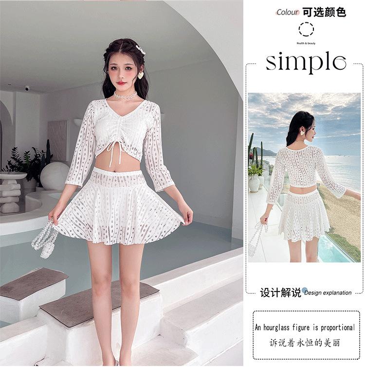 Traje de baño para mujer, nuevo, sexy, con encaje, mangas, falda dividida, estilo conservador, esquinas planas, dos piezas, traje de baño de fotos de aguas termales junto al mar.