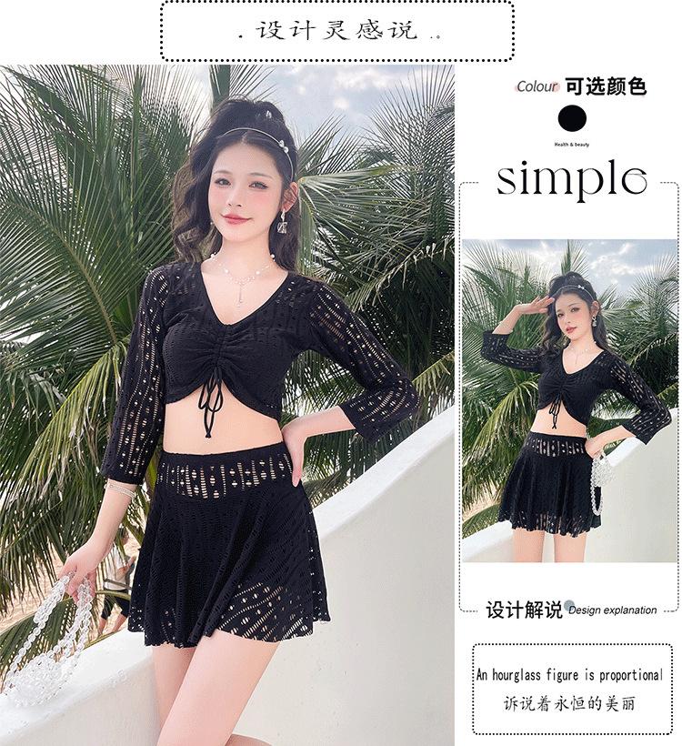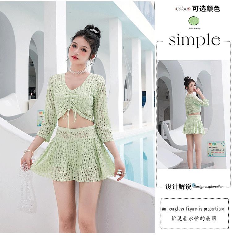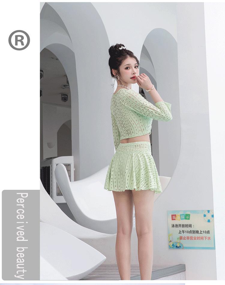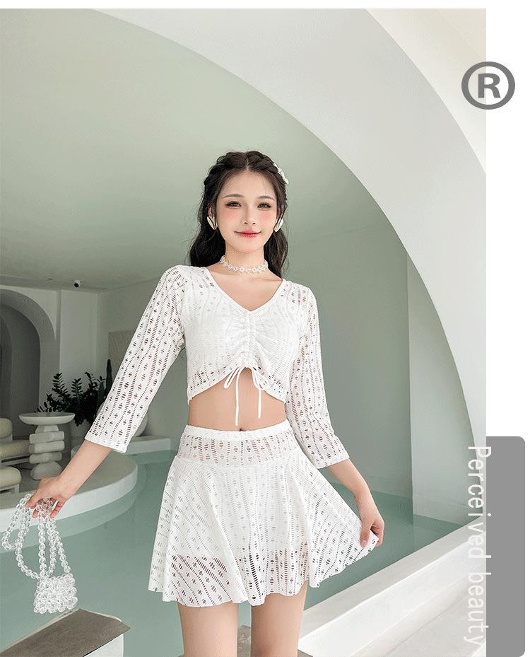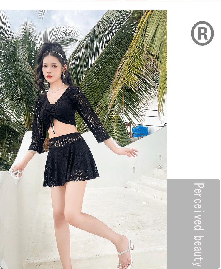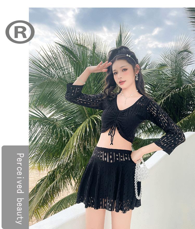 Traje de baño para mujer, nuevo, sexy, con encaje, mangas, falda dividida, estilo conservador, esquinas planas, dos piezas, traje de baño de fotos de aguas termales junto al mar.