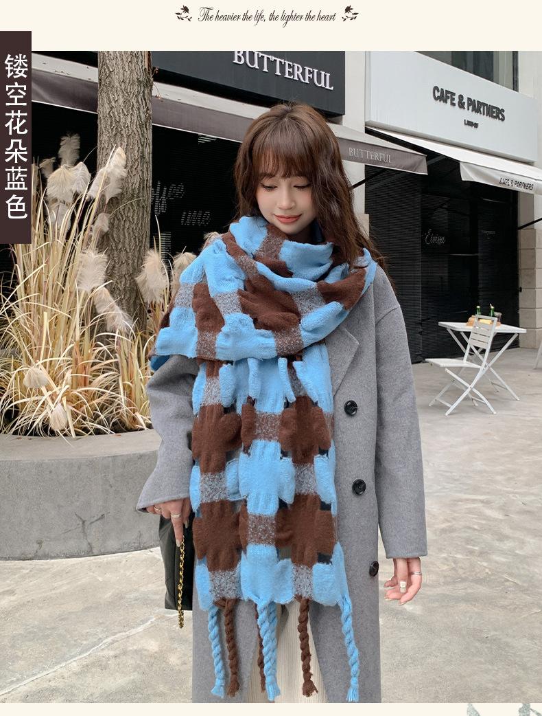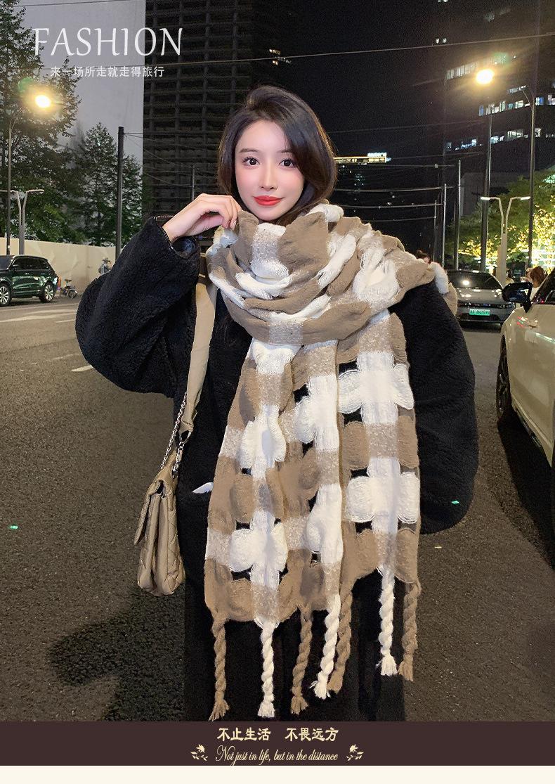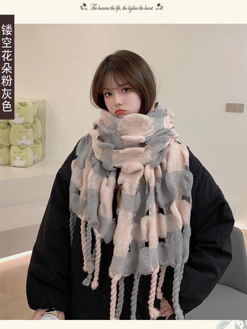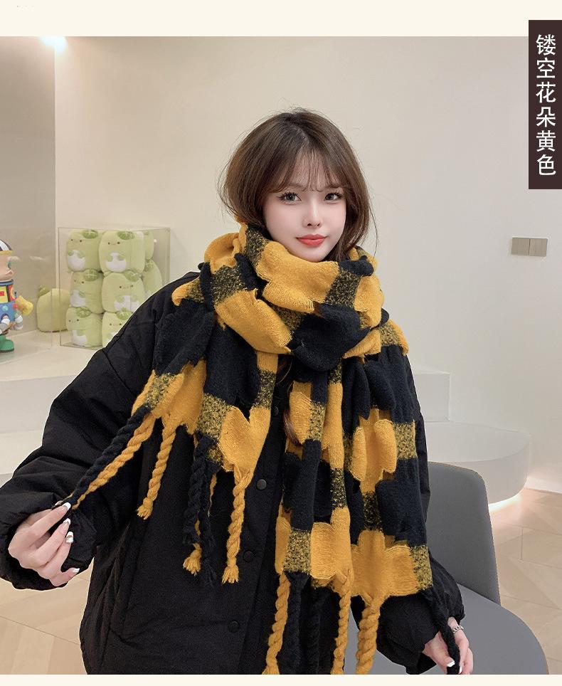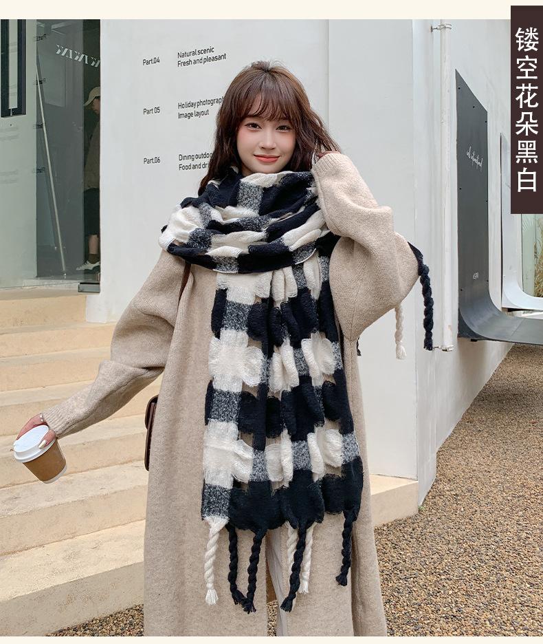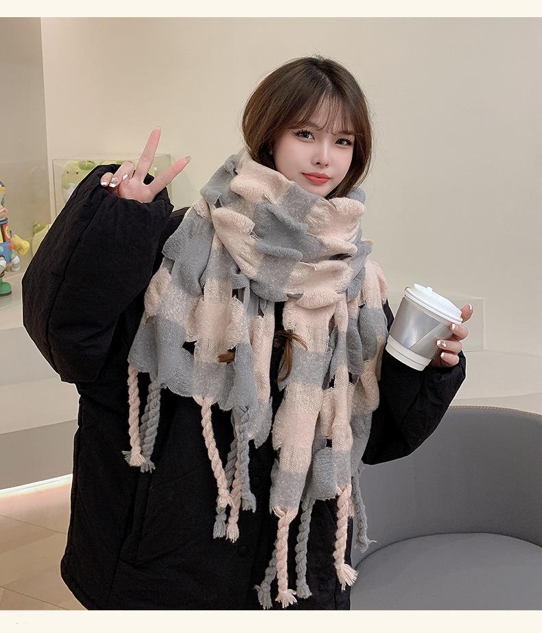 Bufanda de diseño nicho a cuadros huecos estilo coreano ins chal de borlas largas cálida bufanda de estudiante al por mayor