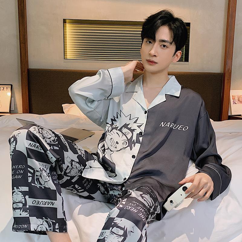Pijamas de seda de hielo para hombre, ropa de hogar de seda de primavera y otoño, de manga larga, a rayas, estilo otoñal, para niños, para las cuatro estaciones, talla grande |