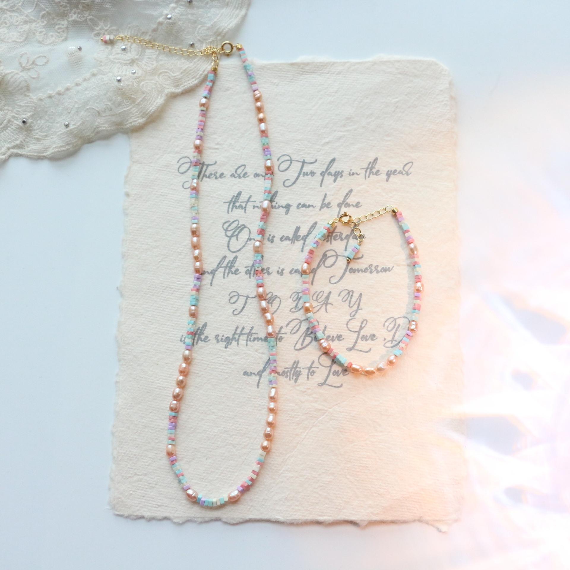 Light candy necklace 39+8cm, Light candy bracelet 15+4cm, Pink pearl necklace 43+7cm, Pink pearl bracelet 16+4cm