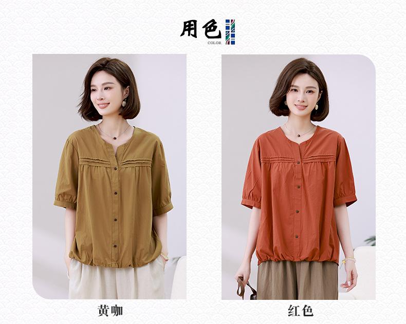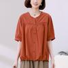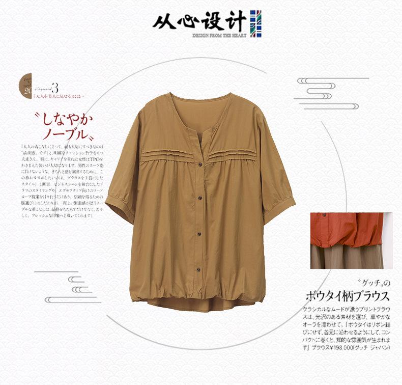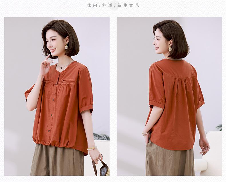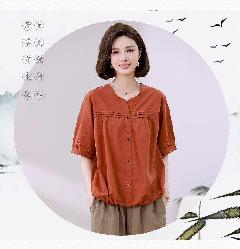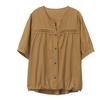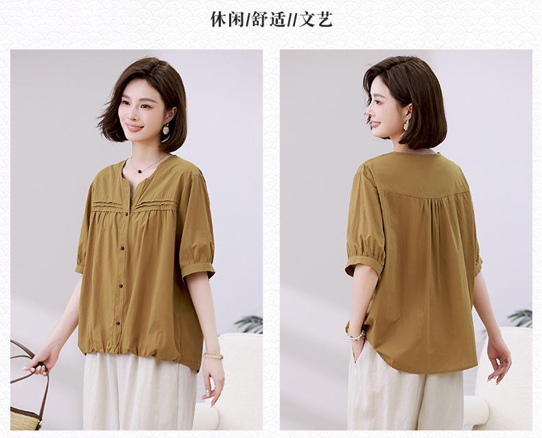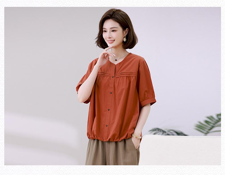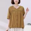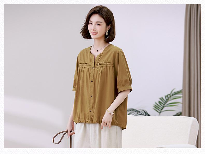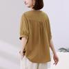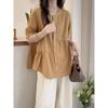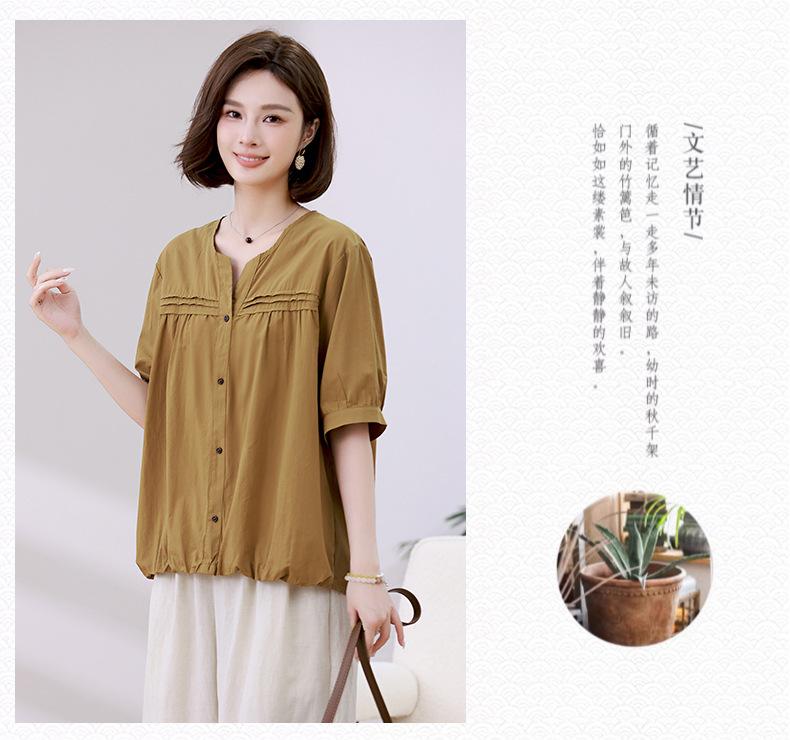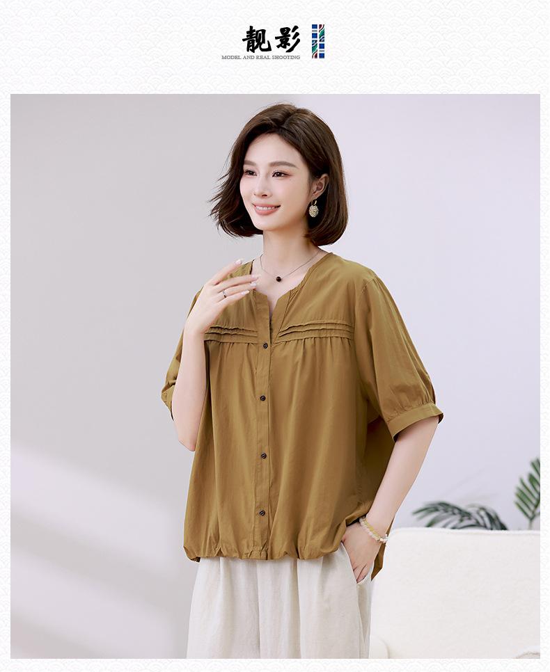 Camisa de algodón ligero artística, cárdigan de un solo pecho con cuello en V plisado, manga corta, holgada, talla grande, para mujer