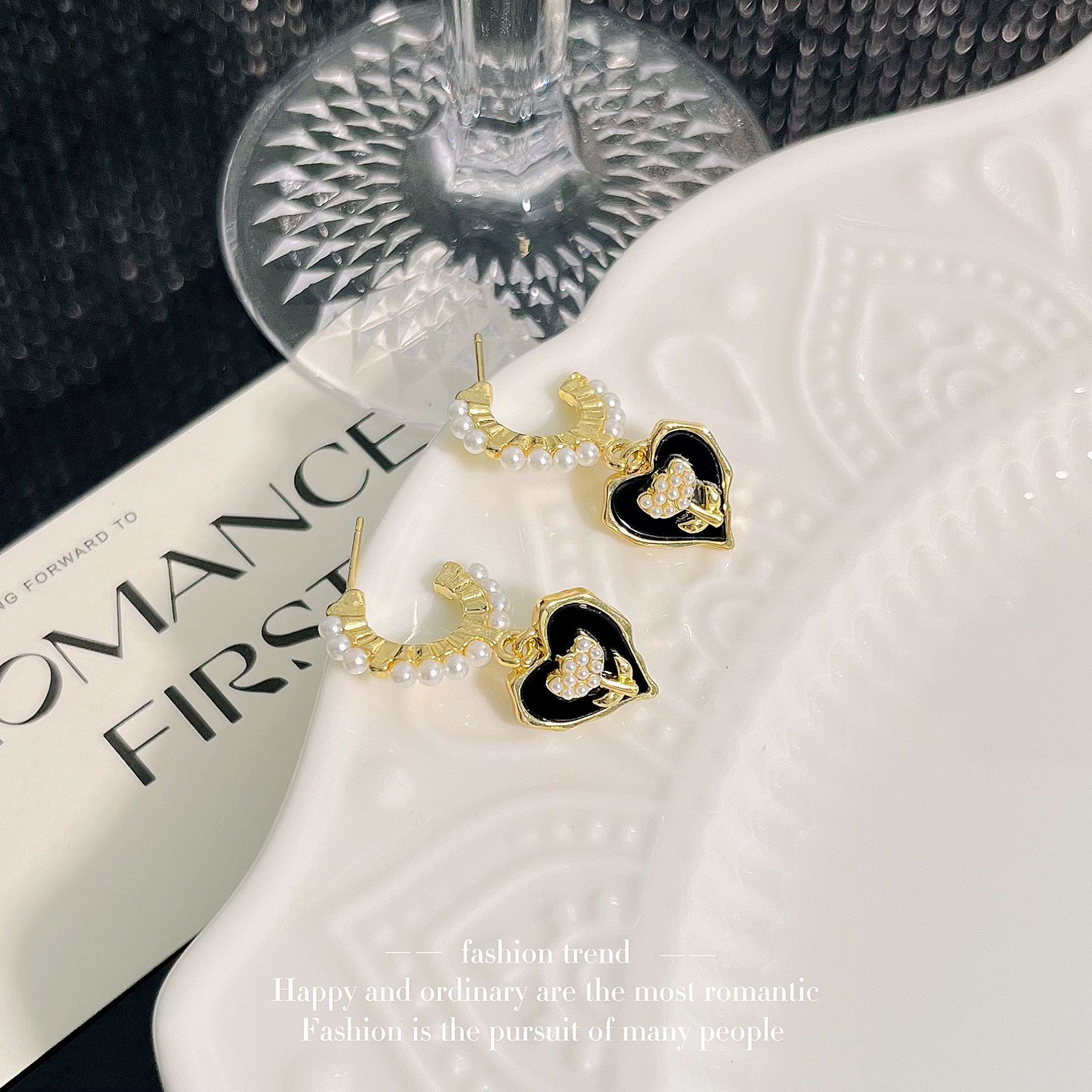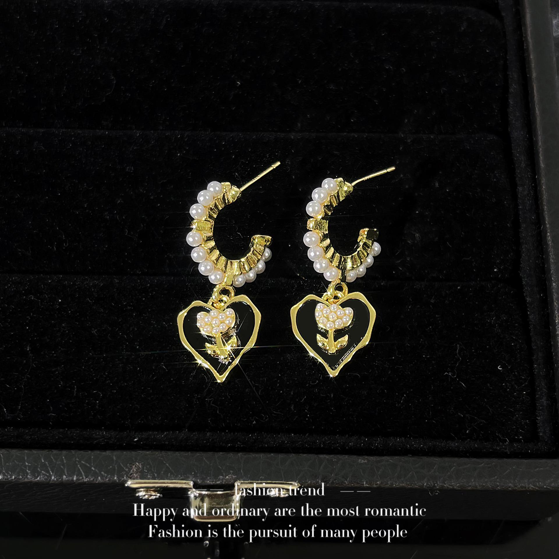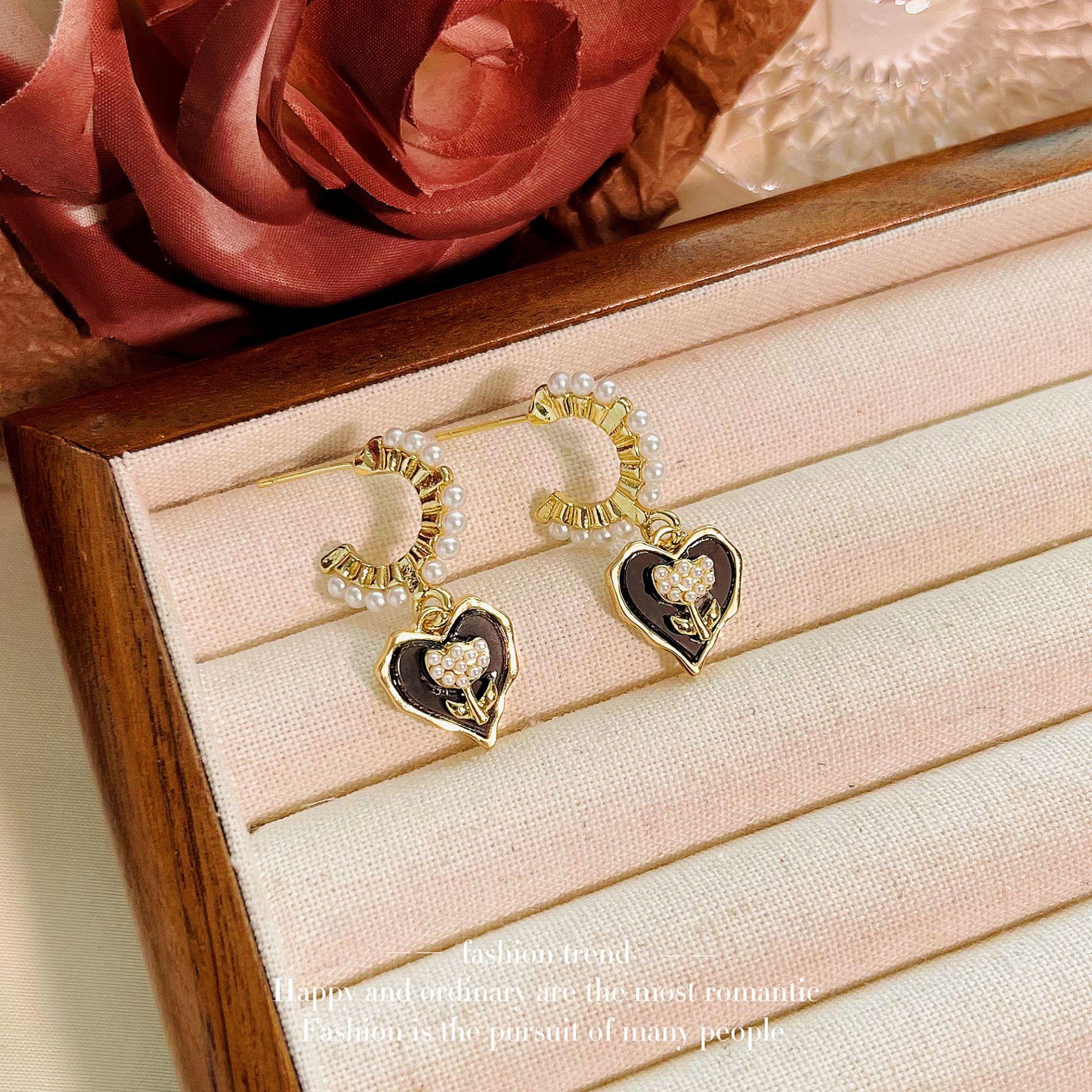 Pendientes de perla de amor retro francés, pendientes sencillos de moda con diseño de nicho, pendientes de lujo ligeros y de alta gama.