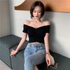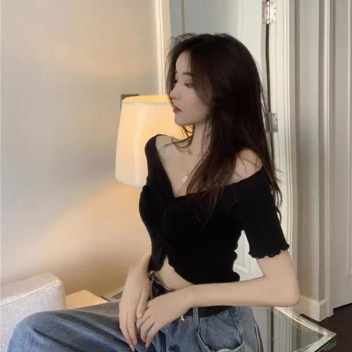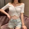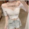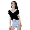 2024 Verano Nuevo Ajustado Sexy Hombro Descubierto Cuello en V Profundo Plisado Camiseta Ropa Superior Extra-corta Ombligo para Mujer