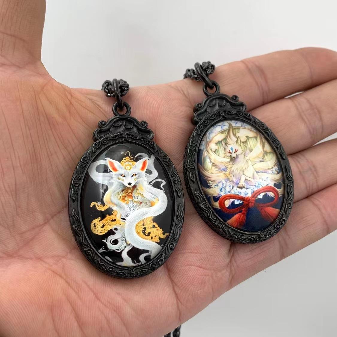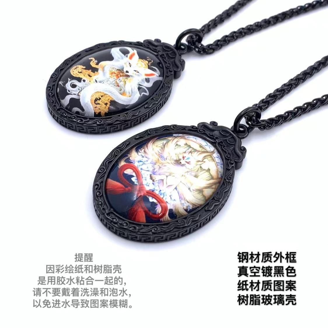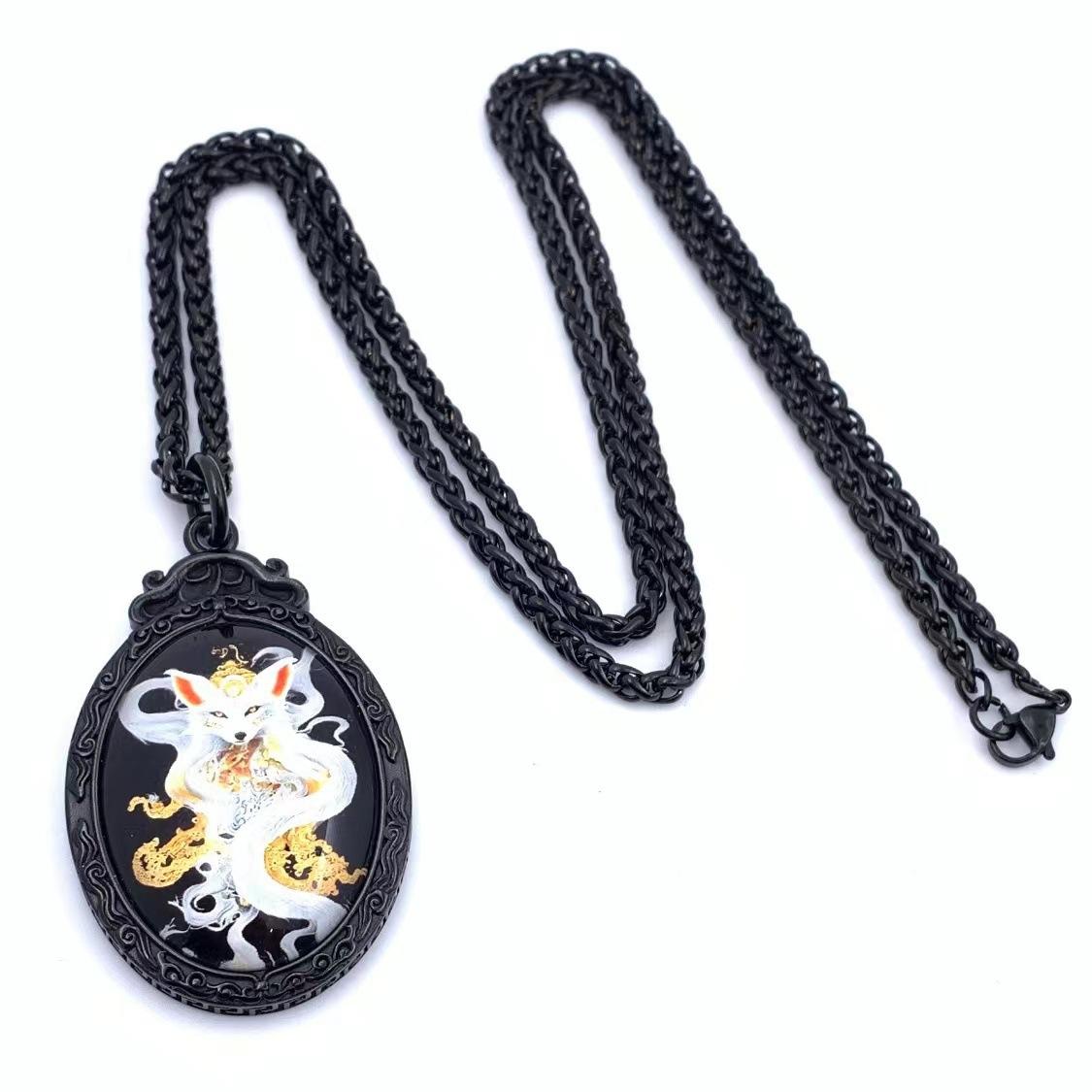 Nuevo estilo nacional, colgante de tarjeta negra de acero de titanio con diseño de zorro de nueve colas pintado thangka para niña, cadena de suéter de moda con personalidad moderna