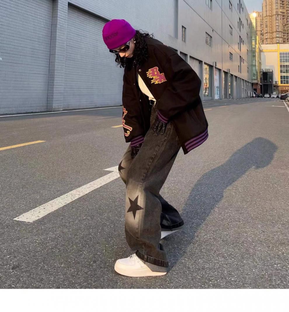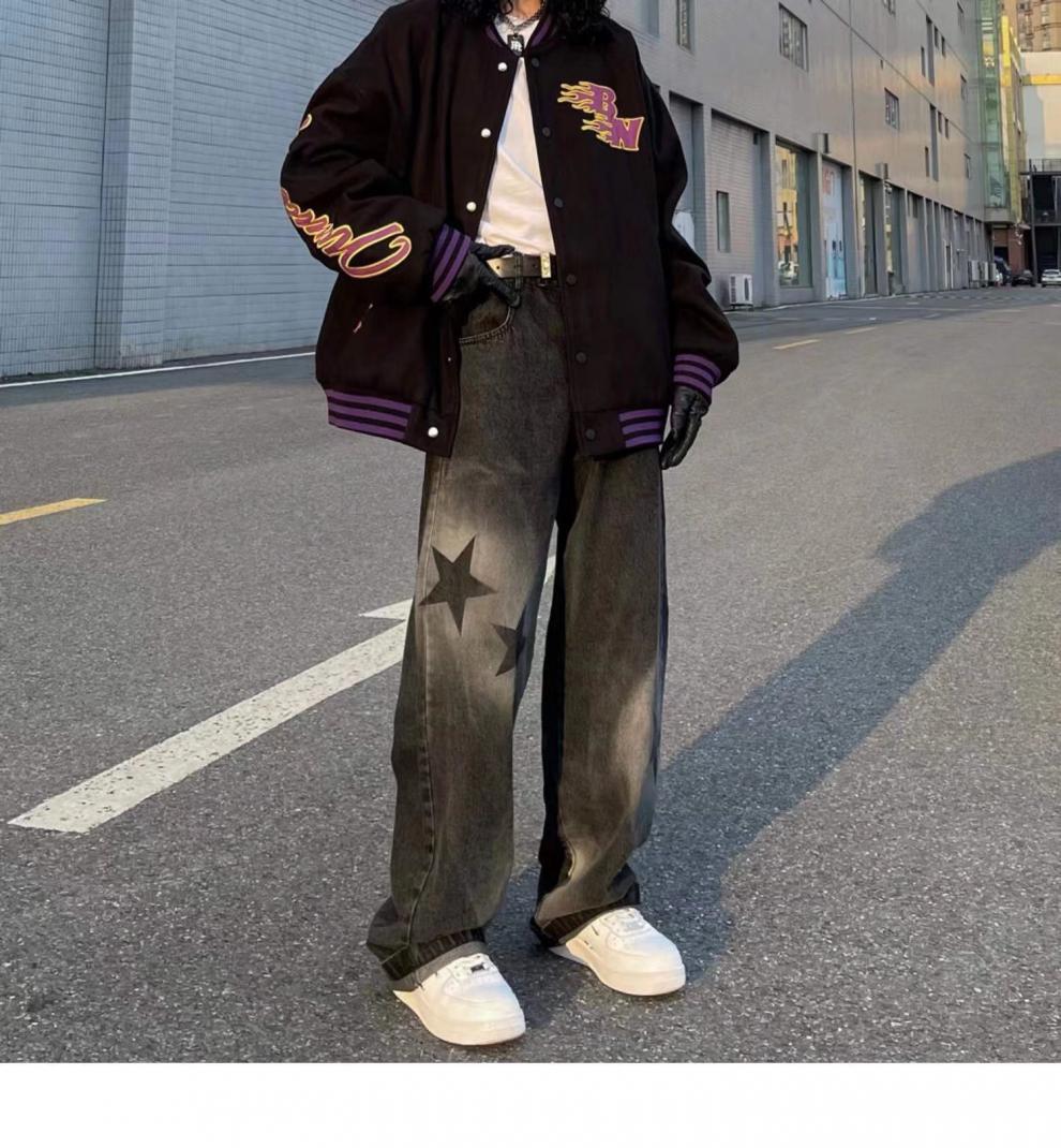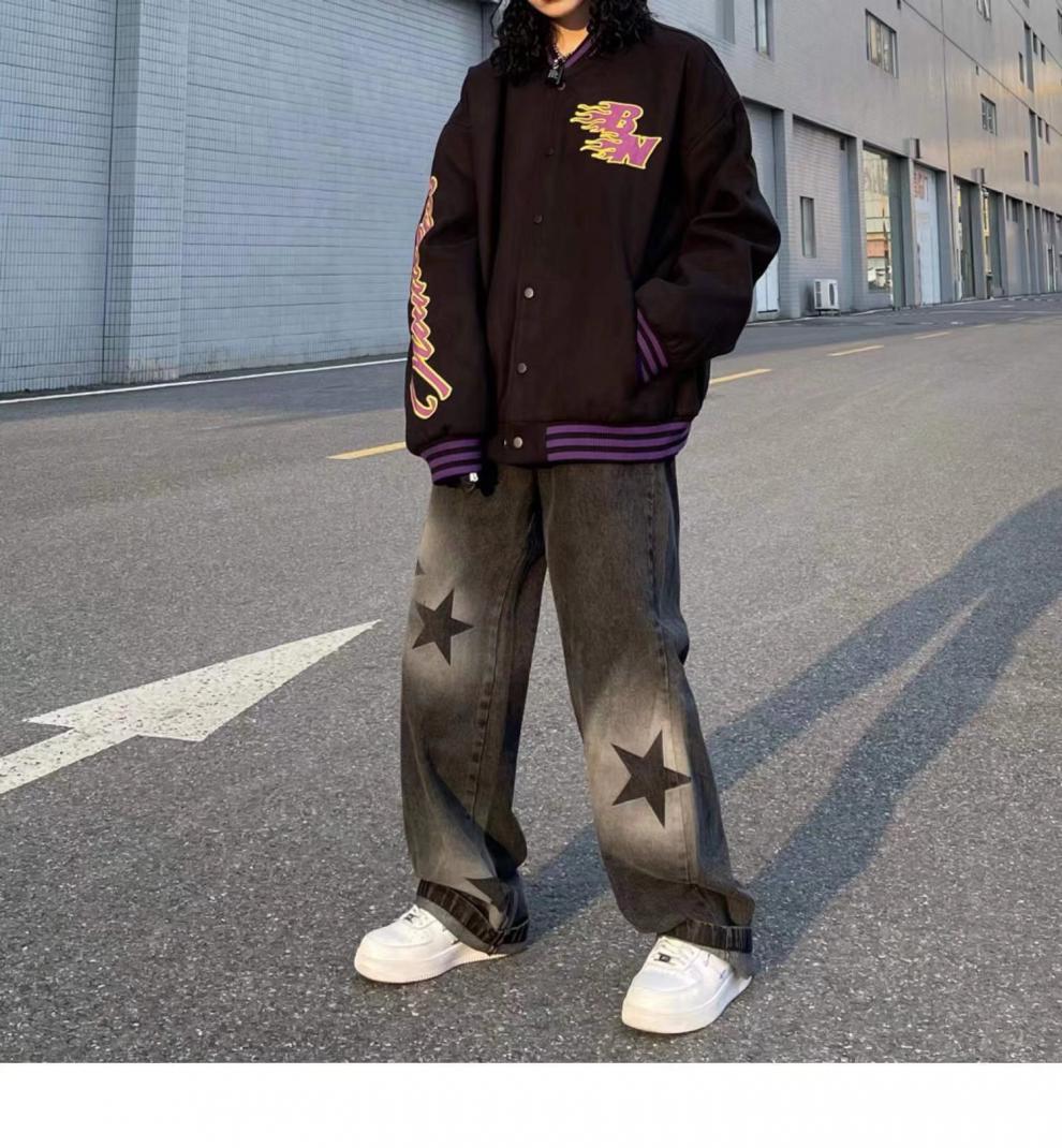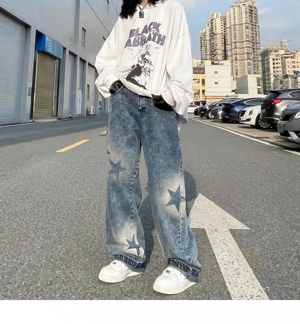 Pantalones Vaqueros Rectos Casuales Europeos y Americanos de Alta Calle Marca de Moda Estrella de Cinco Puntas Pantalones de Pierna Ancha para Hombres y Mujeres Talla Grande Trendy Frito Callejero