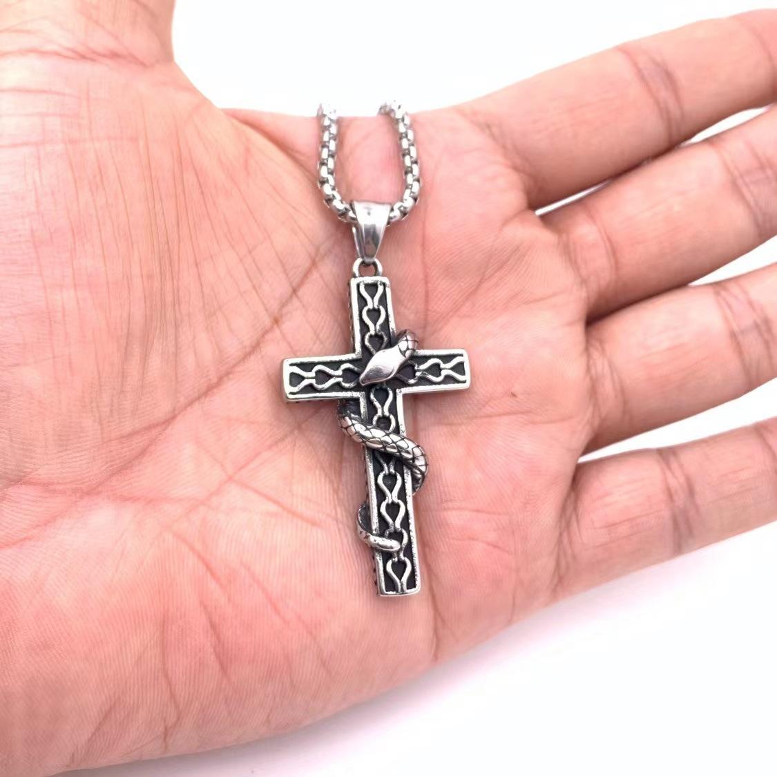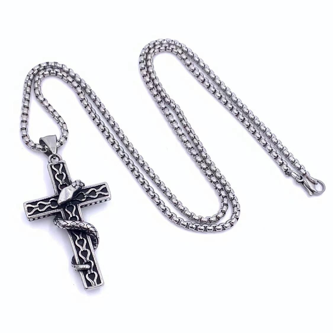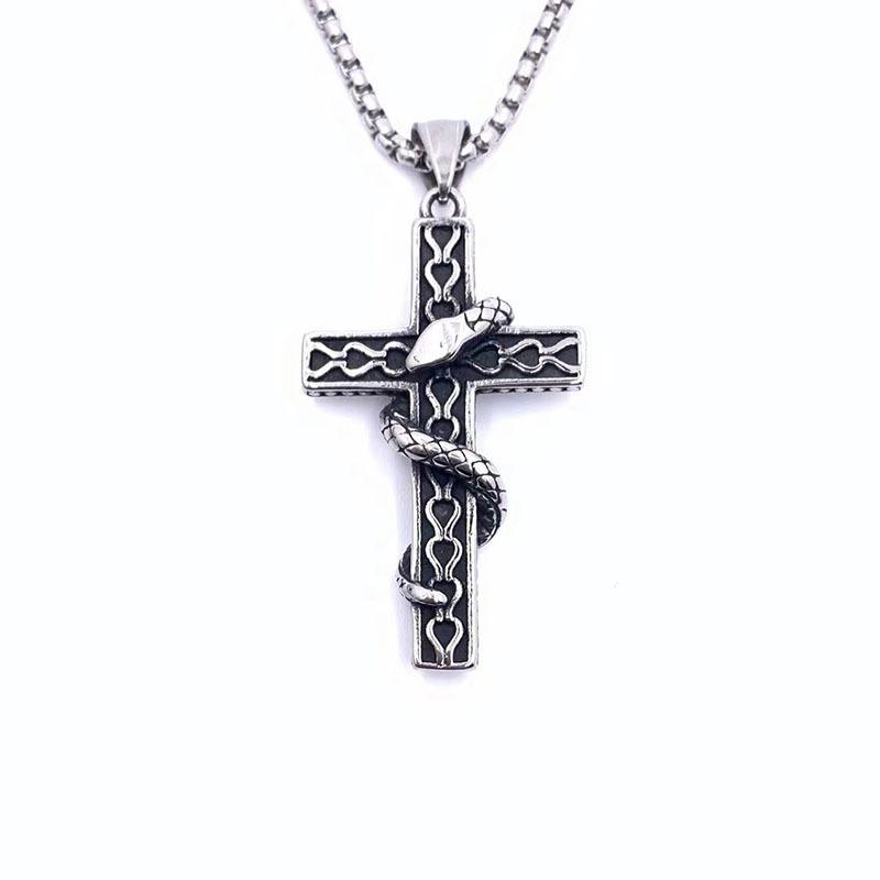 Colgante de cruz con personalidad de acero de titanio y serpiente estilo retro de hip hop para hombre, cadena de suéter con colgante de moda hipster