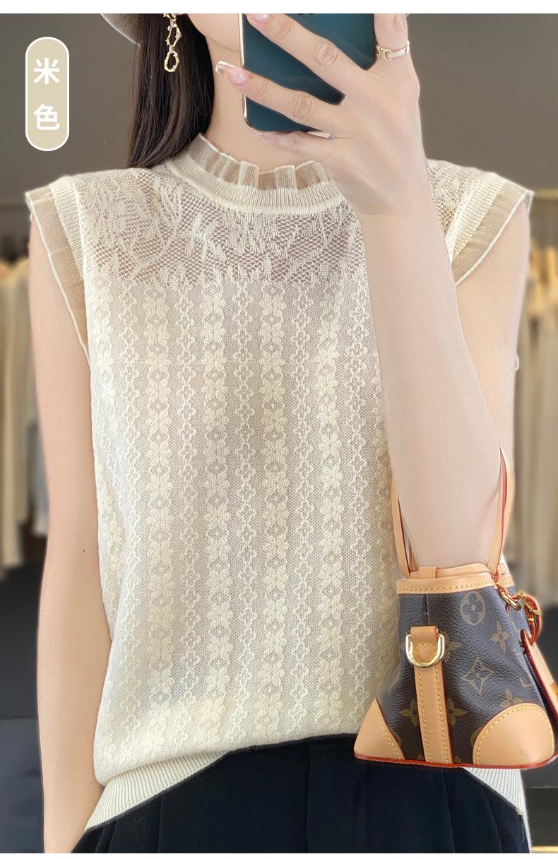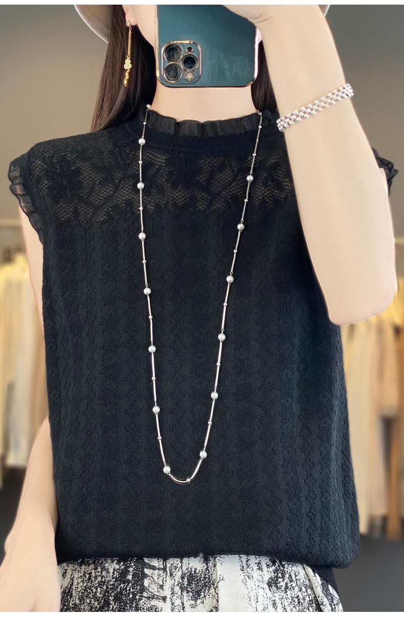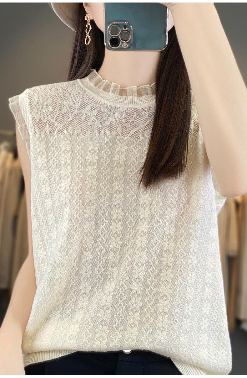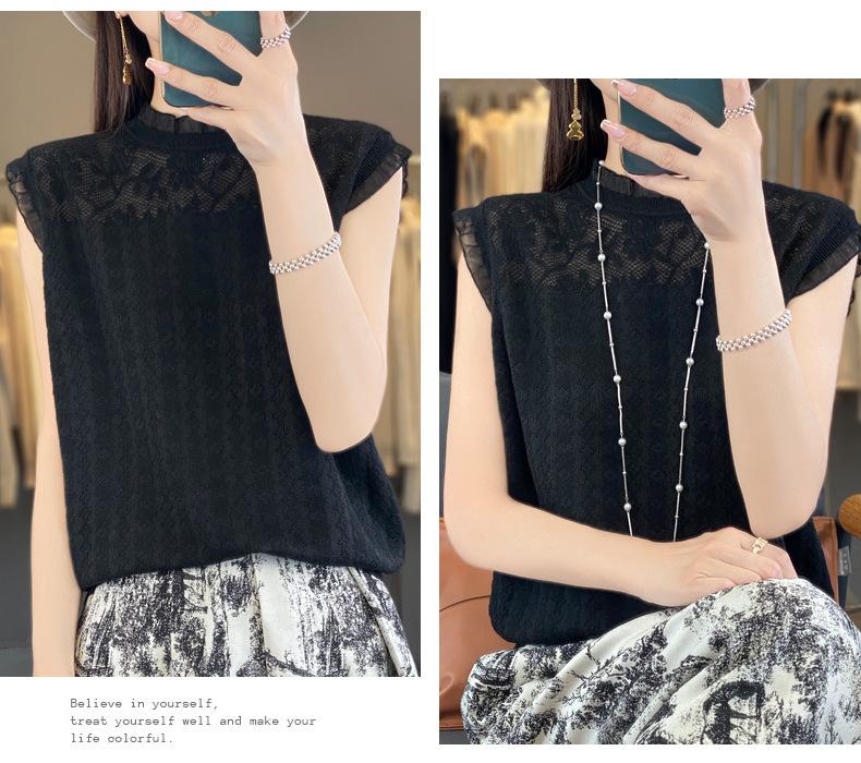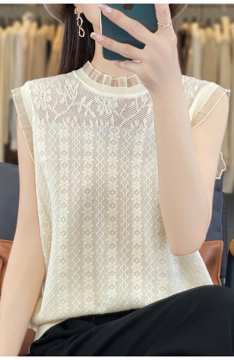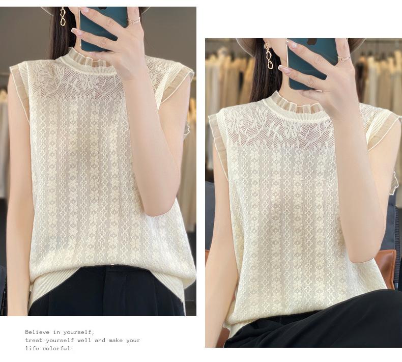 Chaleco de punto con base fina y hueca de encaje, primavera y verano 2024, con costuras de organza