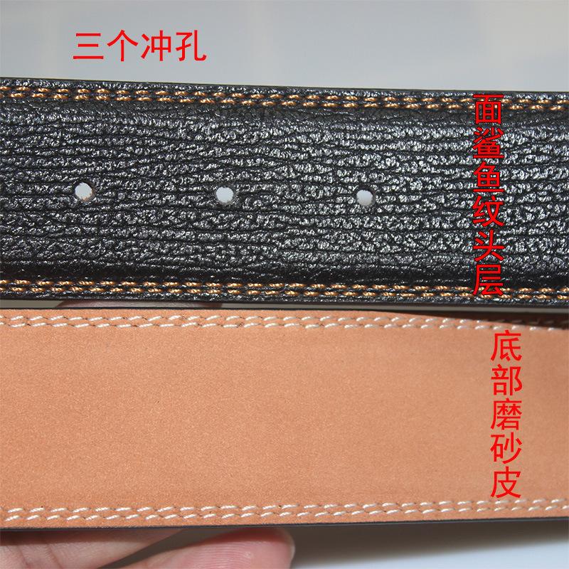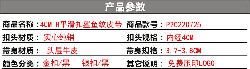 La superficie de este producto está hecha de piel de vaca de capa superior con grano de tiburón, la parte inferior está hecha de cuero esmerilado de capa superior y la parte inferior es de cobre macizo.HEl producto es de alta gama y elegante, con un estilo de marca grande. Puede ser empaquetado en una caja de regalo. El embalaje necesita ser añadido10Yuan RMB, es un cinturón de hombre de alta calidad.
