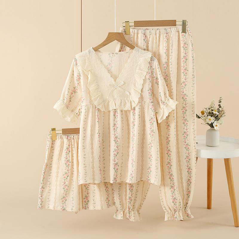 Pijamas de algodón puro para mujer, primavera y otoño, nuevo estilo princesa dulce, encaje, manga larga, doble gasa, conjunto de ropa fina para el hogar