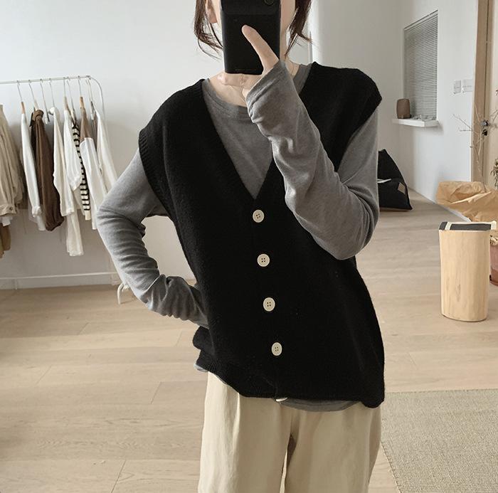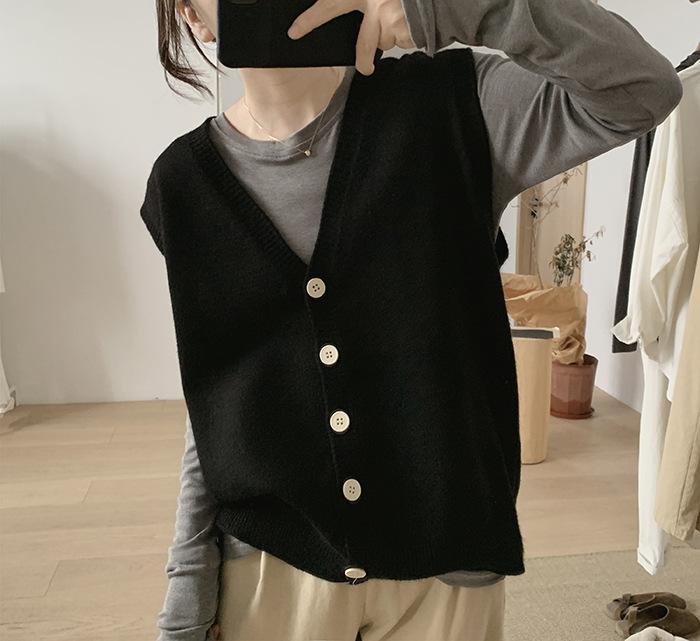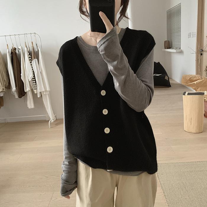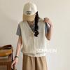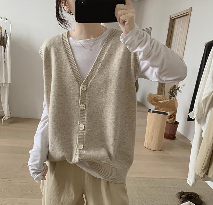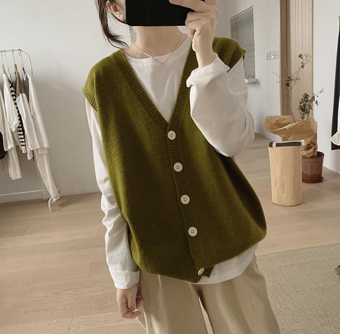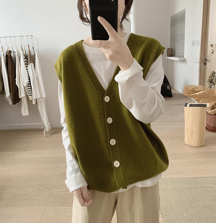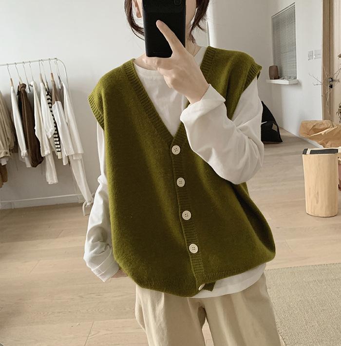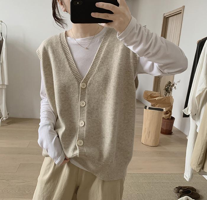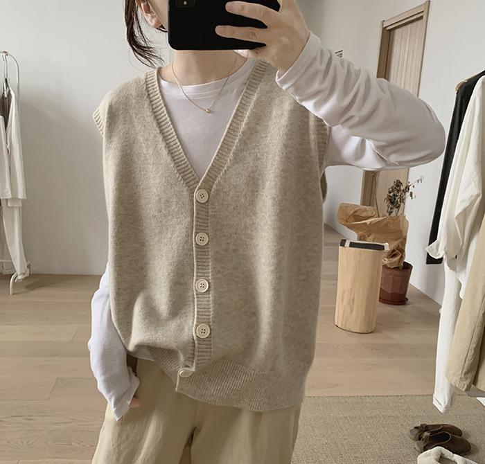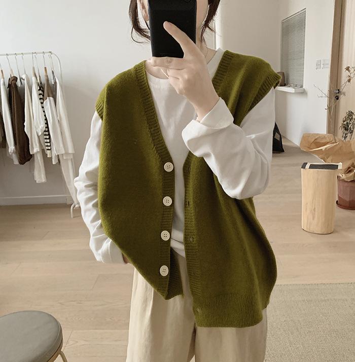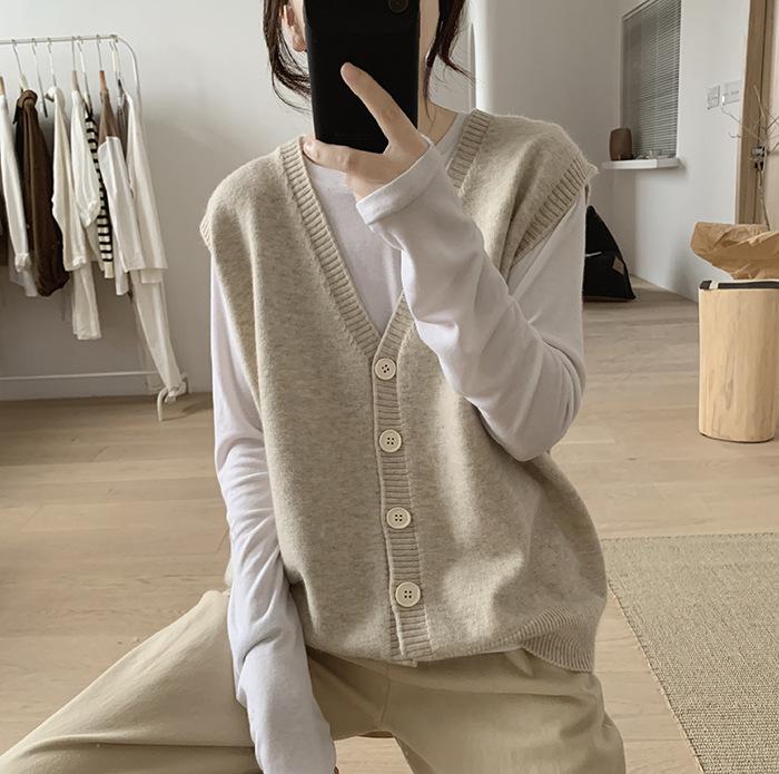 Chaleco Tejido con Cuello en V para Mujer Primavera y Otoño Nuevo Suelto Adelgazante Estilo Coreano Simple Sin Mangas Rejuvenecedor Cárdigan Chaleco