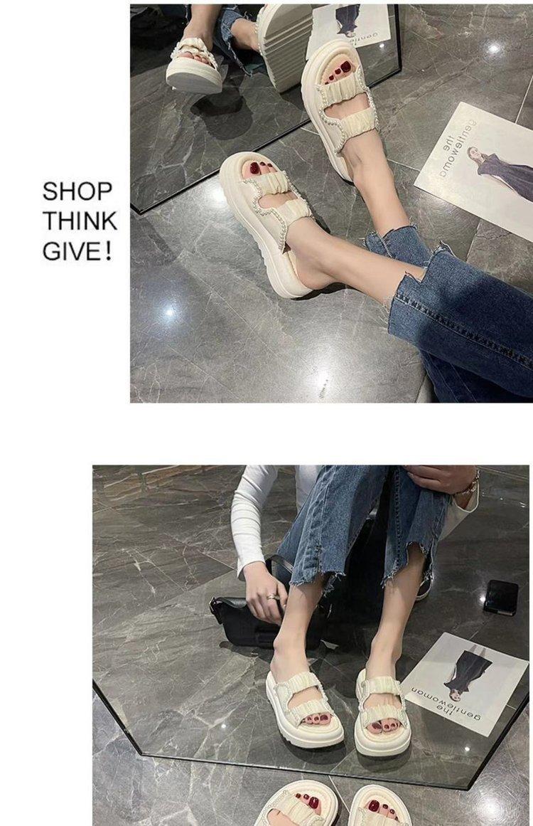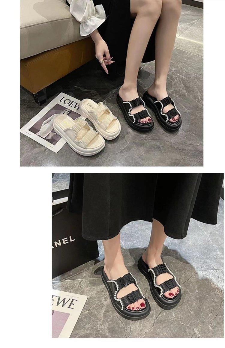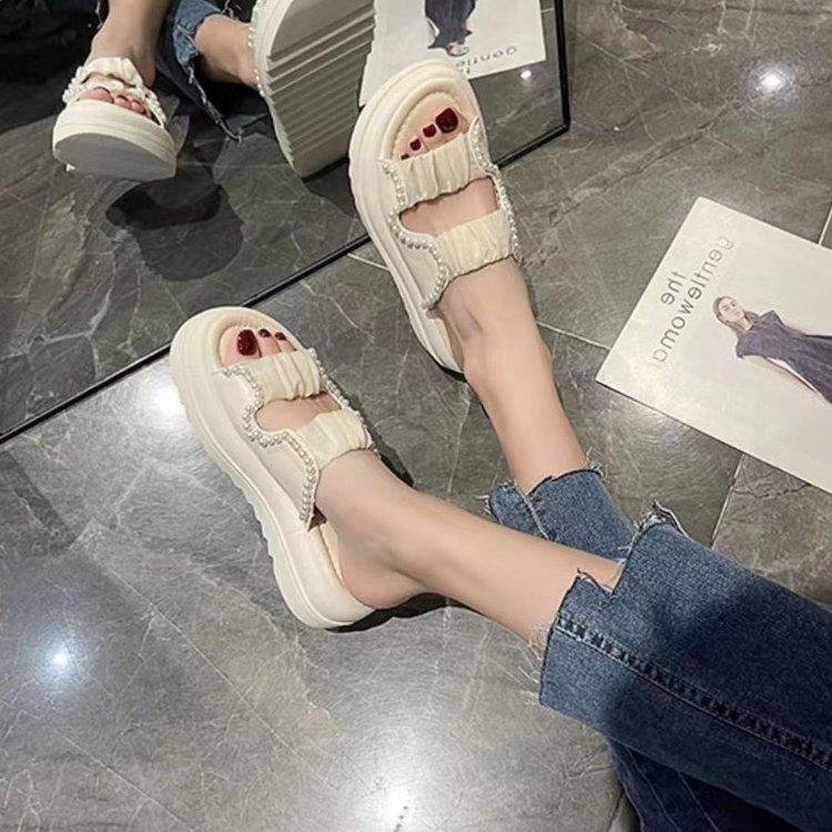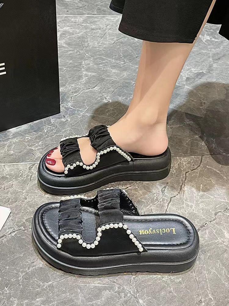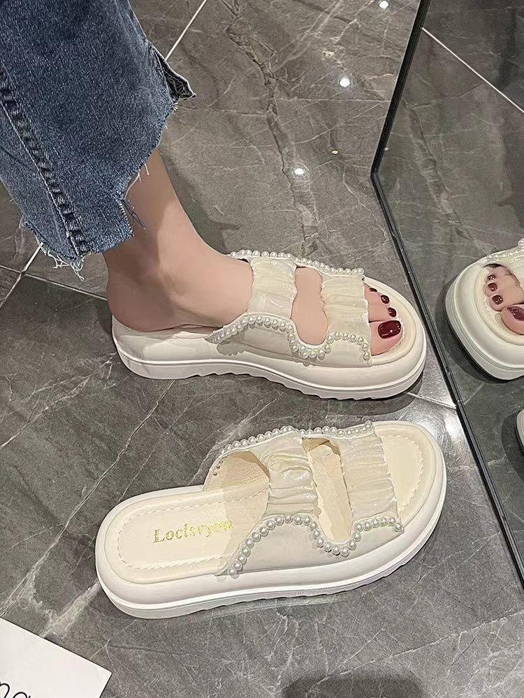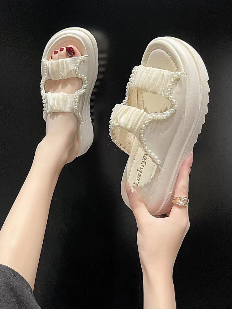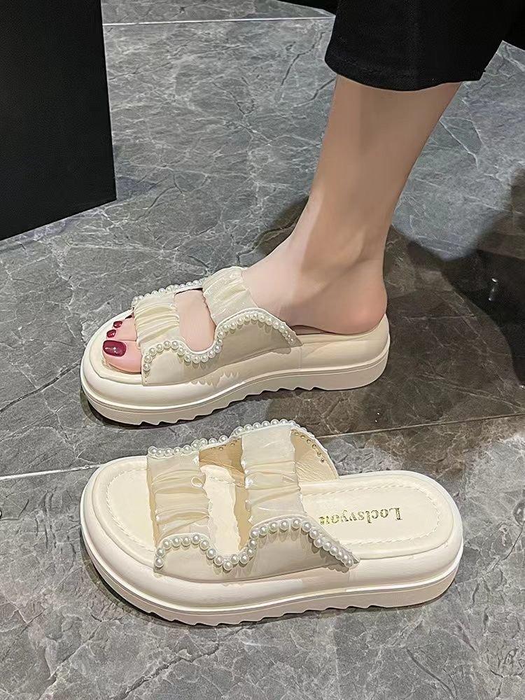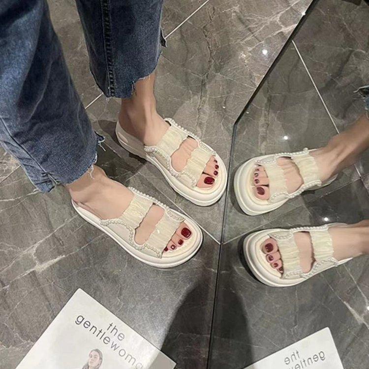 Zapatillas de suela gruesa para mujer, ropa de verano 2024, nueva moda, estilo hada, sandalias y zapatillas de playa de fondo suave con perlas romanas, marea