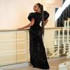 Comercio Exterior Vestido Nuevo Vestido de Noche Europeo y Americano Negro Lentejuelas Falda Cola de Pez Abertura Alta Manga Abullonada Falda Larga Vestido
