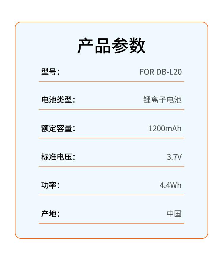 Aplicable a la batería de la cámara Sanyo DB-L20 DMC-C1 CA65 E60 CG6 CA6 DMX-CA8 CG9