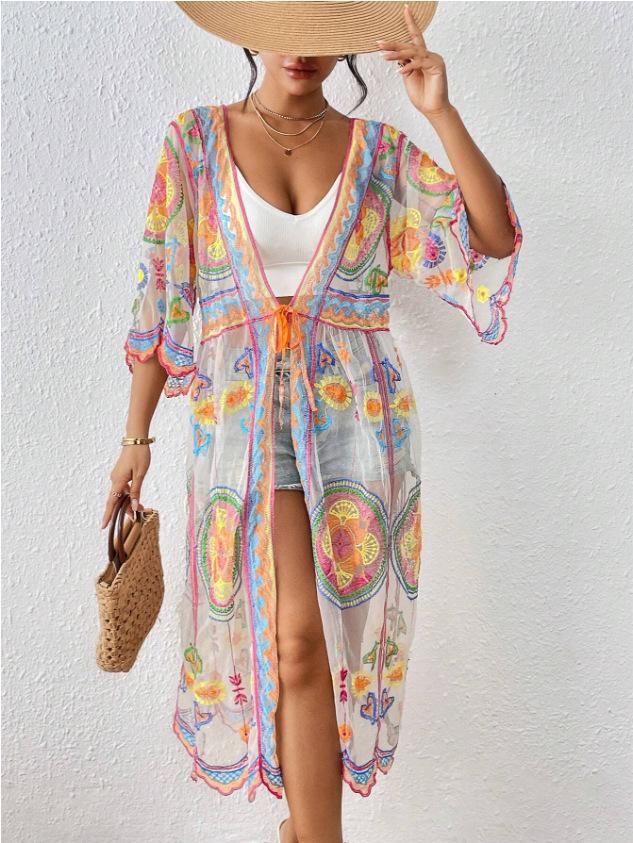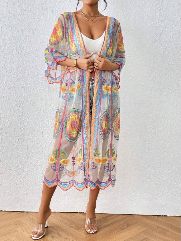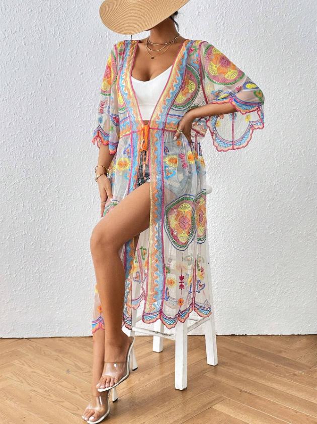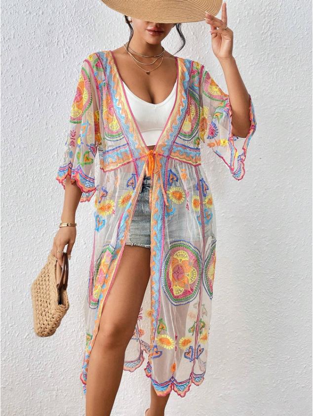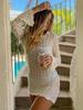 Blusa de bikini larga de comercio exterior transfronterizo, camisa de playa de encaje hueco, ropa de protección solar, cárdigan, traje de baño, abrigo que se puede usar al aire libre